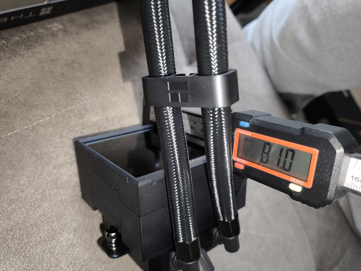 Węże wychodzą z komory końcowej poprzez solidne, metalowe zakuwki. Mają długość około 400 mm, zostały pokryte materiałowym oplotem i wyposażone w trzy klipsy porządkujące, które ułatwiają ich prowadzenie w obudowie i poprawiają estetykę całej instalacji.