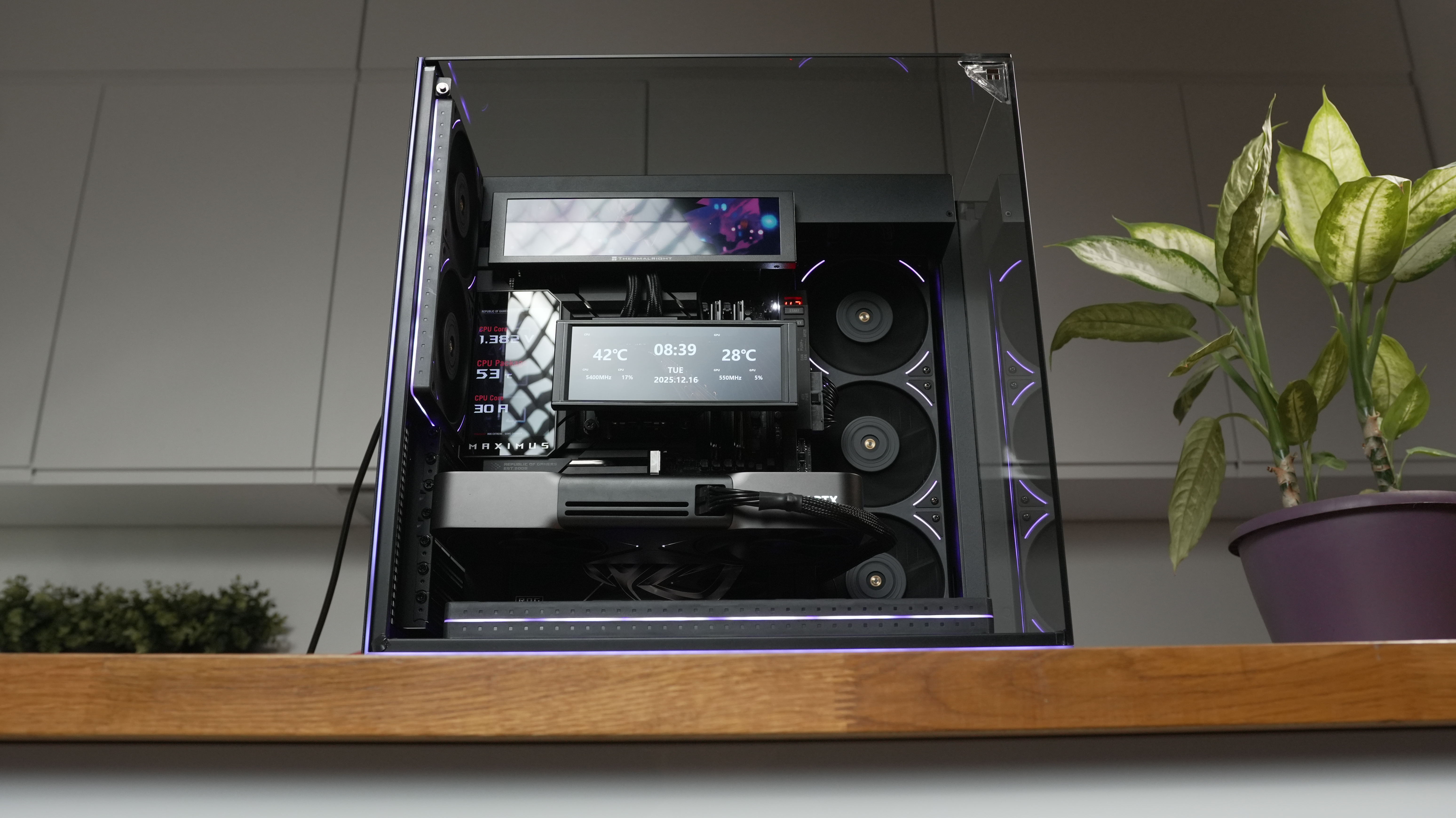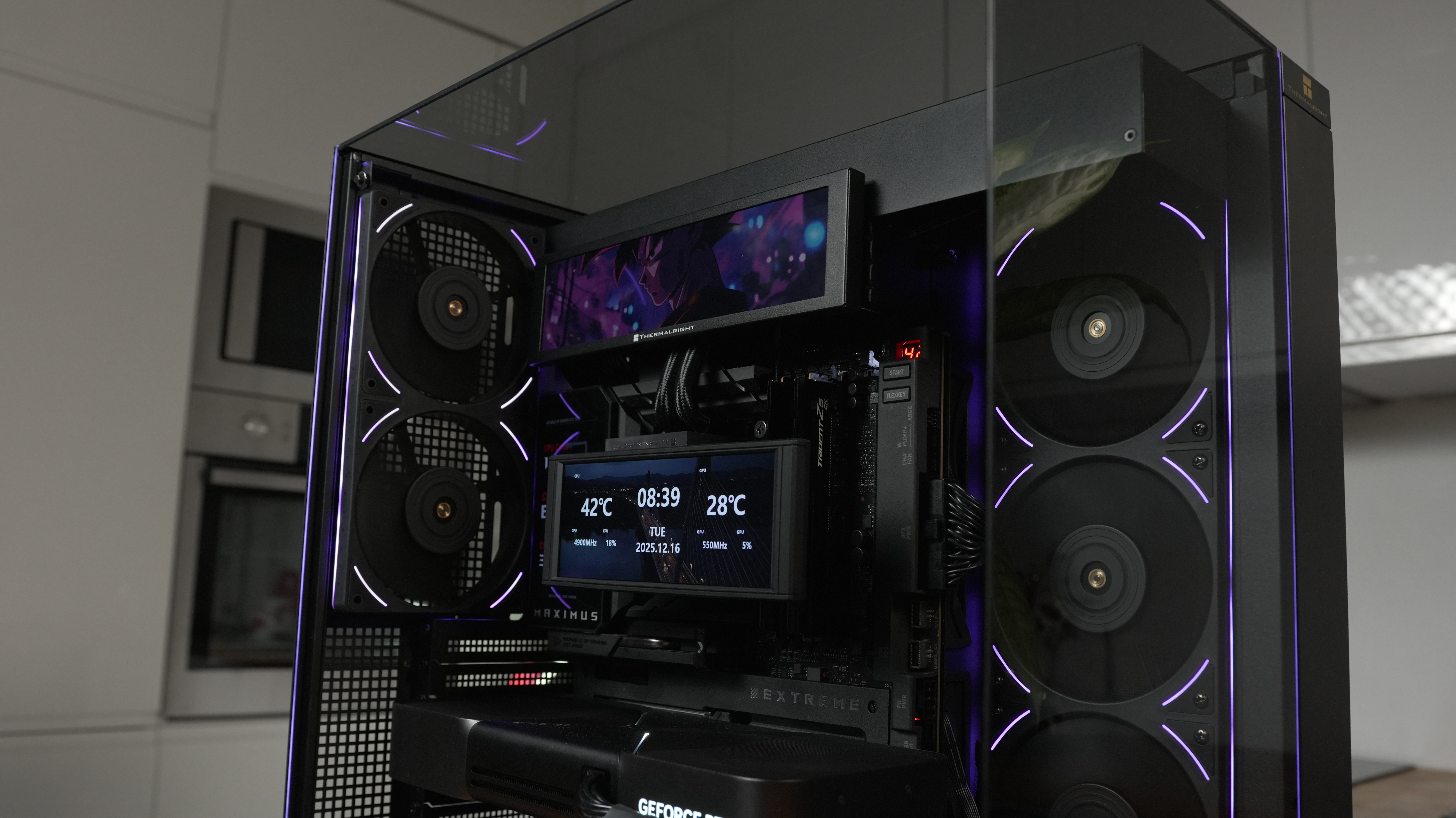 Najwyższa wersja obudowy została wyposażona w magnetycznie montowany ekran Trofeo Vision. To ponad 9-calowy panel IPS o wysokiej rozdzielczości, który łączy się z systemem za pomocą wewnętrznego złącza USB-C. Dzięki oprogramowaniu TRCC (Thermalright Control Center), użytkownik może wyświetlać na nim parametry pracy podzespołów lub dowolne multimedia.