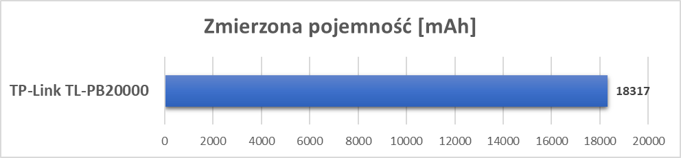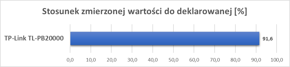 Zgodnie z oczekiwaniami TP-Link TL-PB20000 nie wspiera żadnego szybkiego ładowania. Zaliczony jest jedynie BC1.2 DCP 5 V i niestety szybko nie naładujecie Waszego sprzętu. Zmierzona pojemność jest bardzo dobra. Stosunek do deklarowanej wynosi 91,6%, co jest także znakomitym wynikiem.