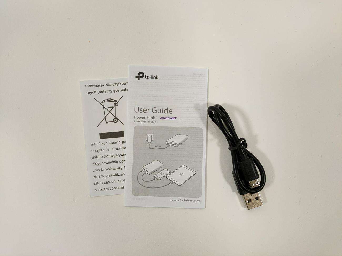 Powerbank otrzymałem wraz z instrukcją oraz kablem USB- micro USB. Szkoda, że w zestawie nie ma przewodu USB-C, który na pewno bardzo by się przydał.