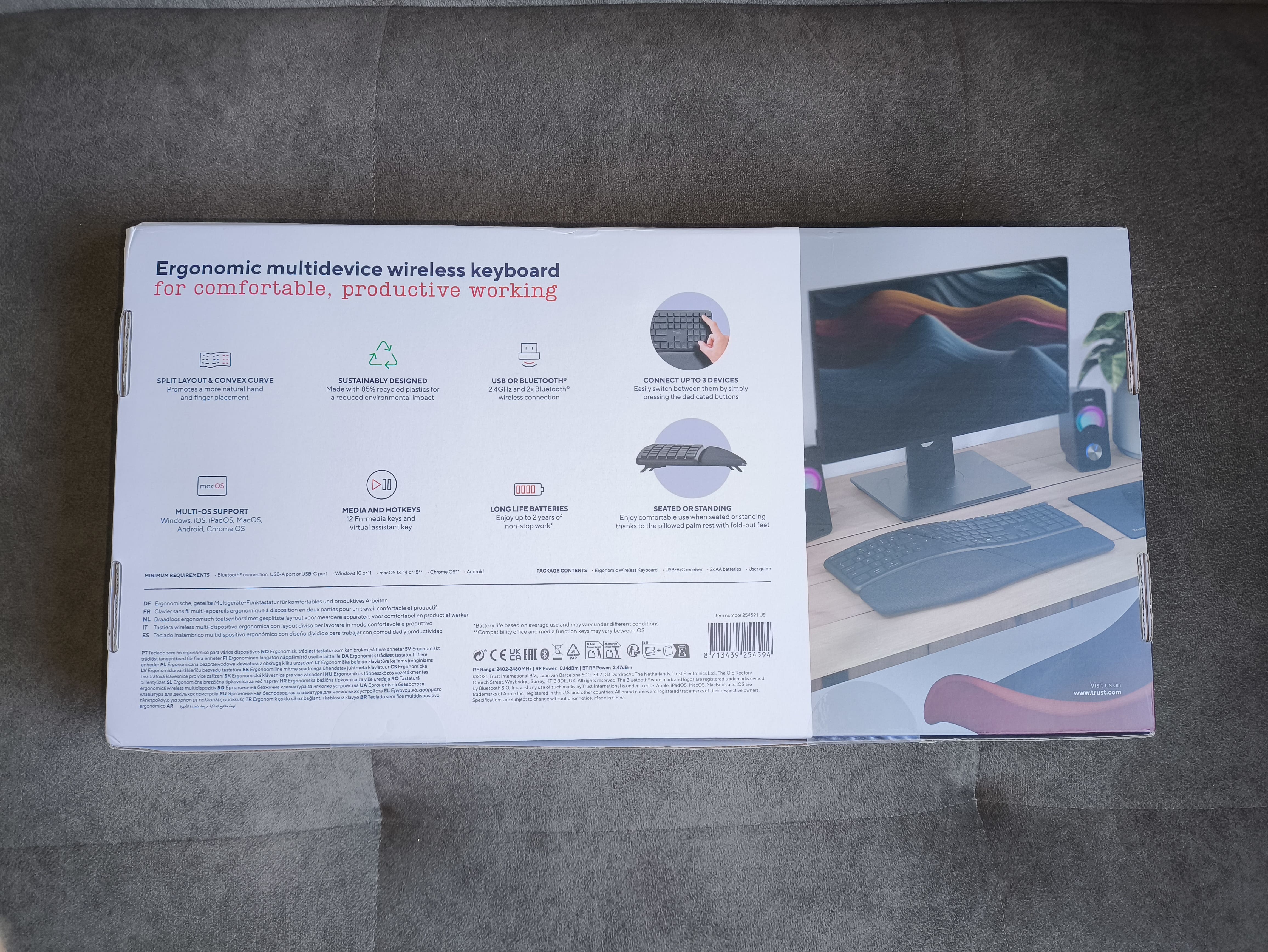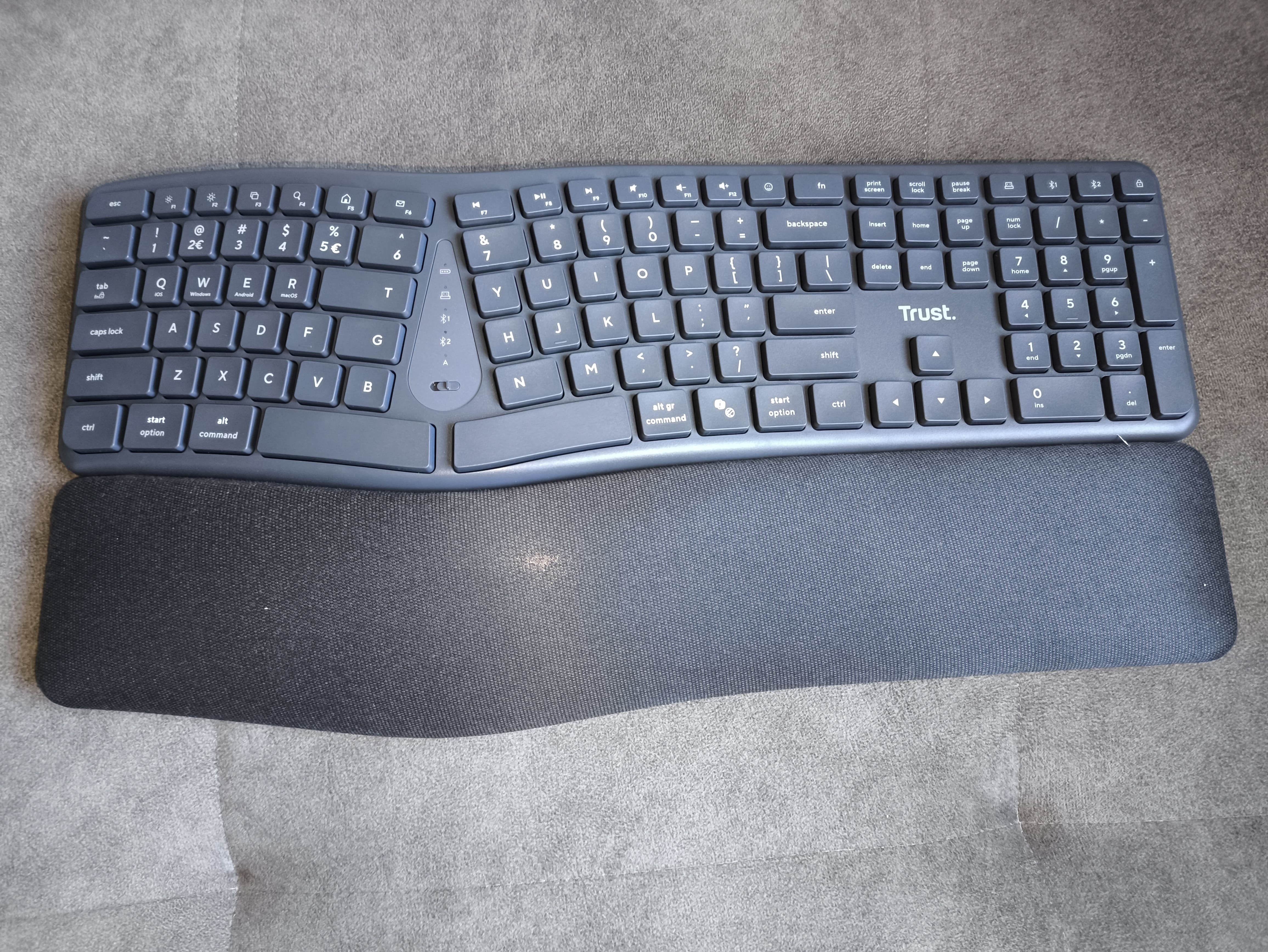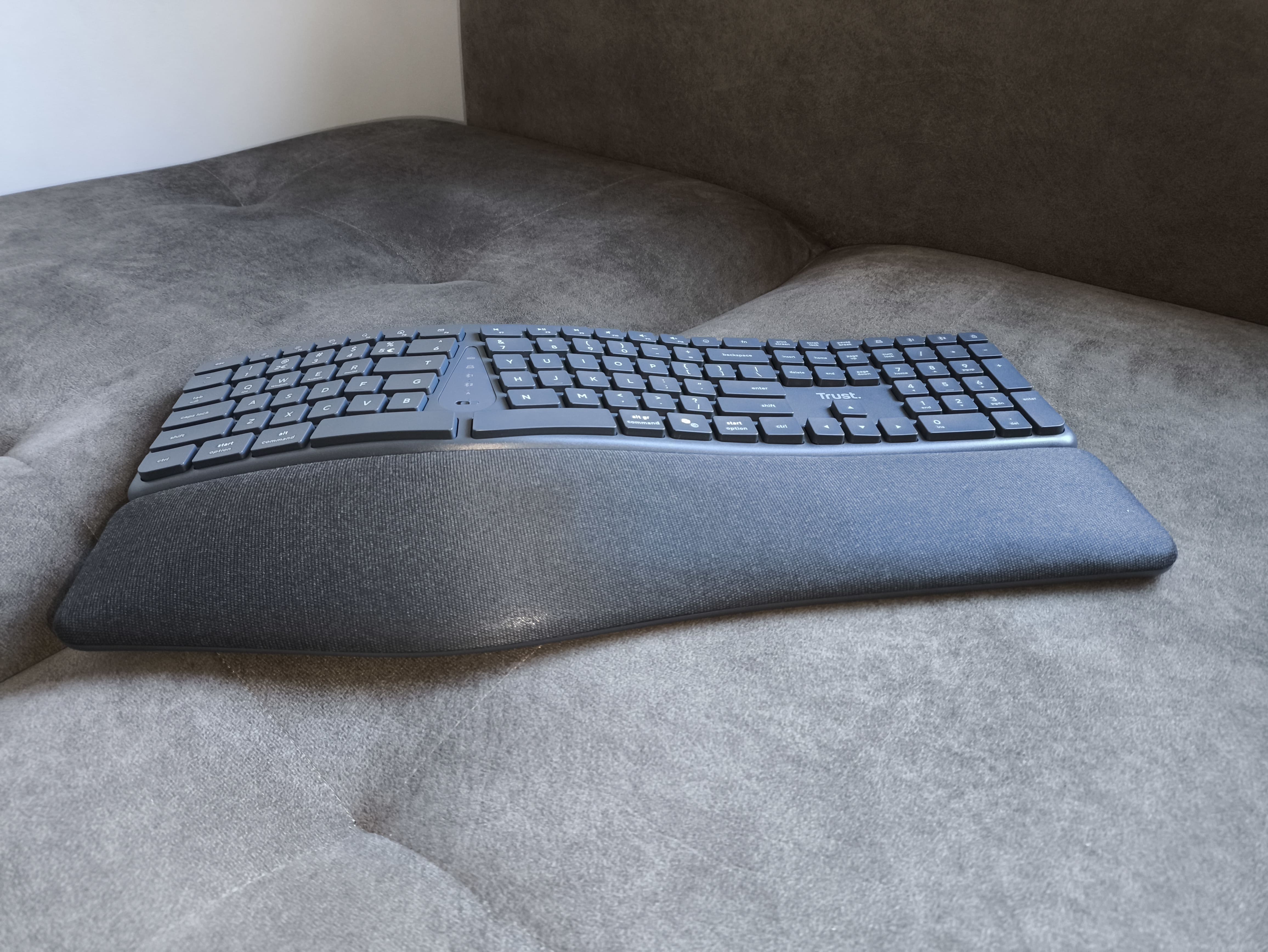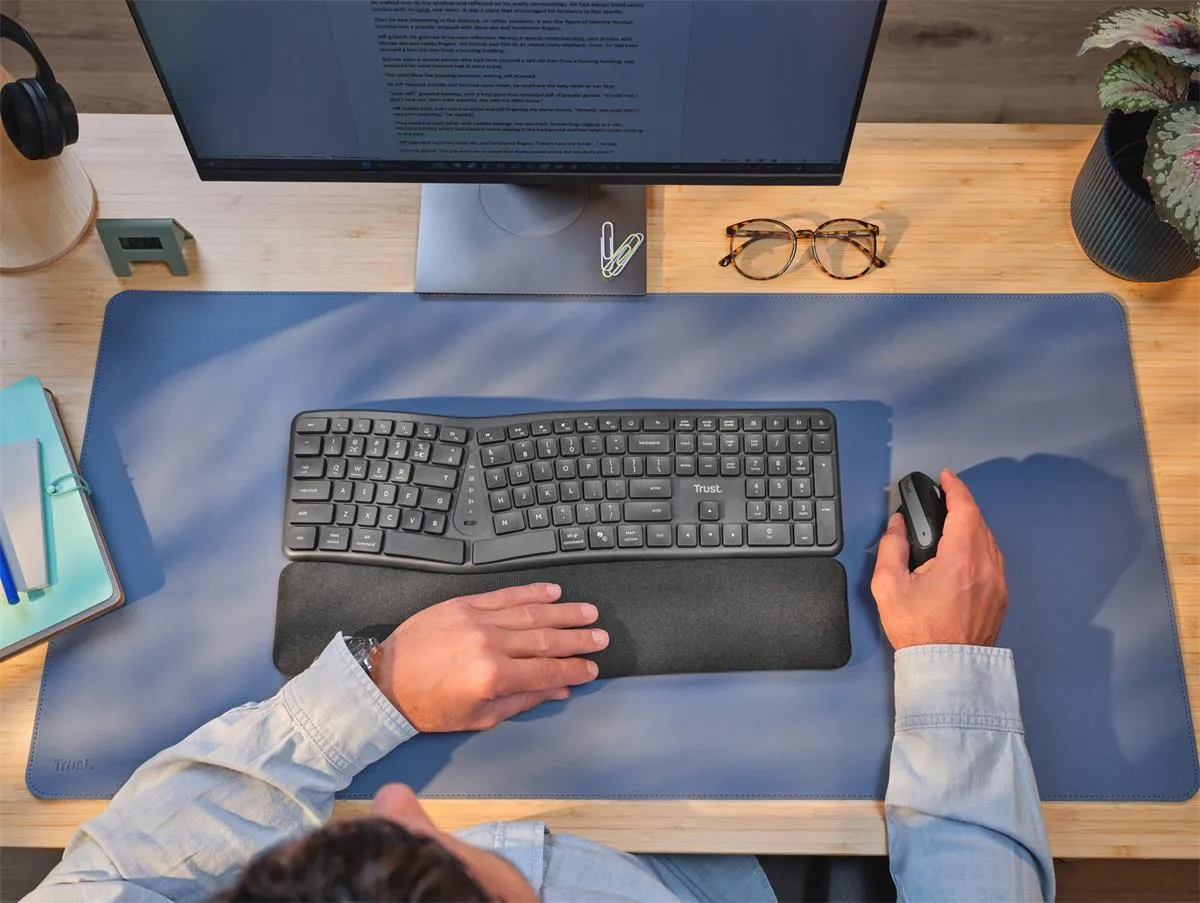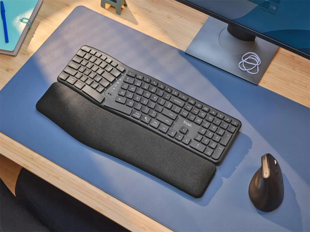 Trust Keyra to bezprzewodowa klawiatura wielozadaniowa, zaprojektowana z myślą o ergonomii i zwiększeniu komfortu pracy biurowej przez cały dzień. W przeciwieństwie do standardowych, płaskich konstrukcji, Keyra przyjmuje dzieloną, kątową formę, mającą wymusić bardziej naturalne ułożenie dłoni i palców. Klawiatura celuje w segment użytkowników profesjonalnych, którzy spędzają wiele godzin na pisaniu.