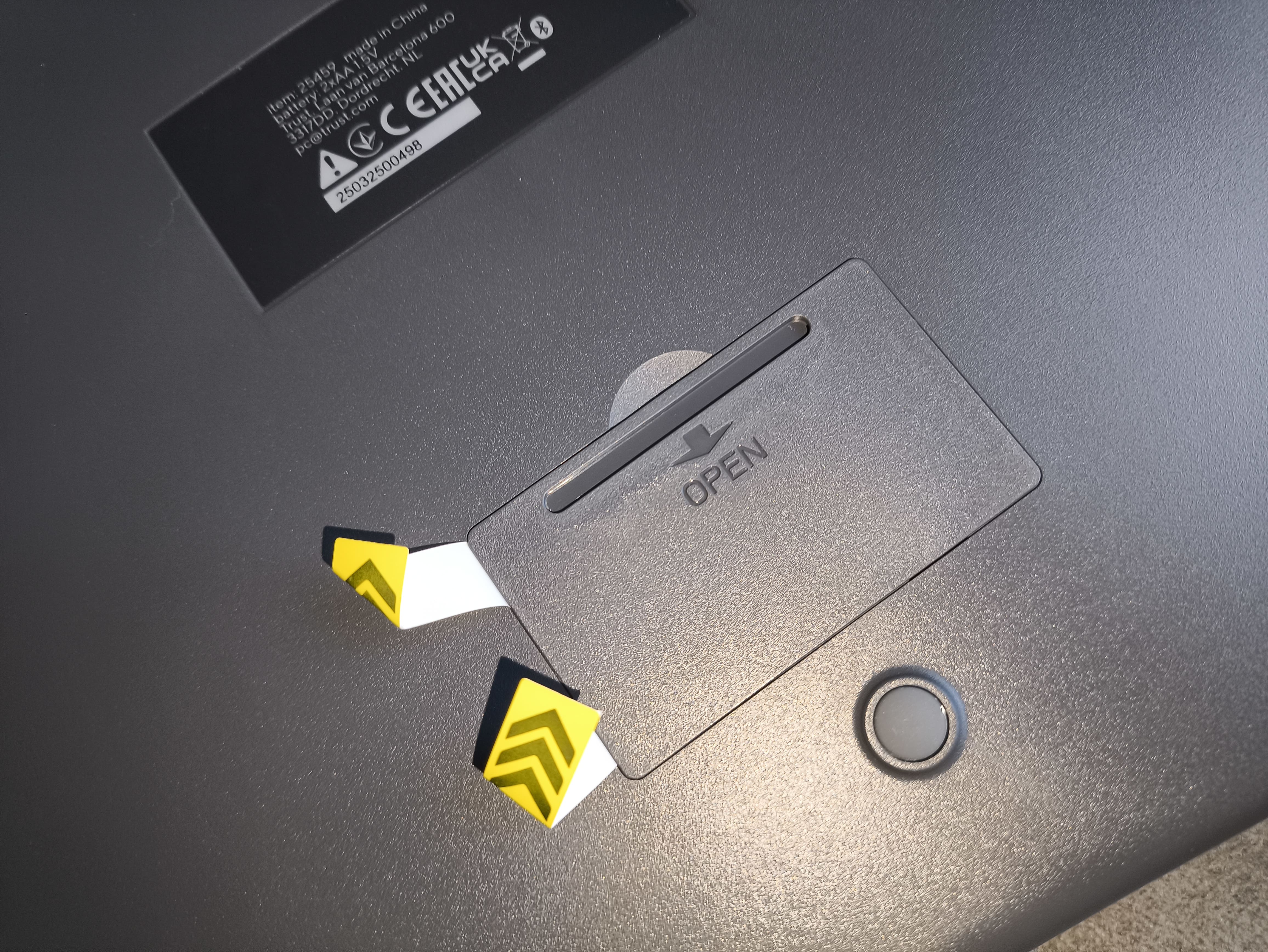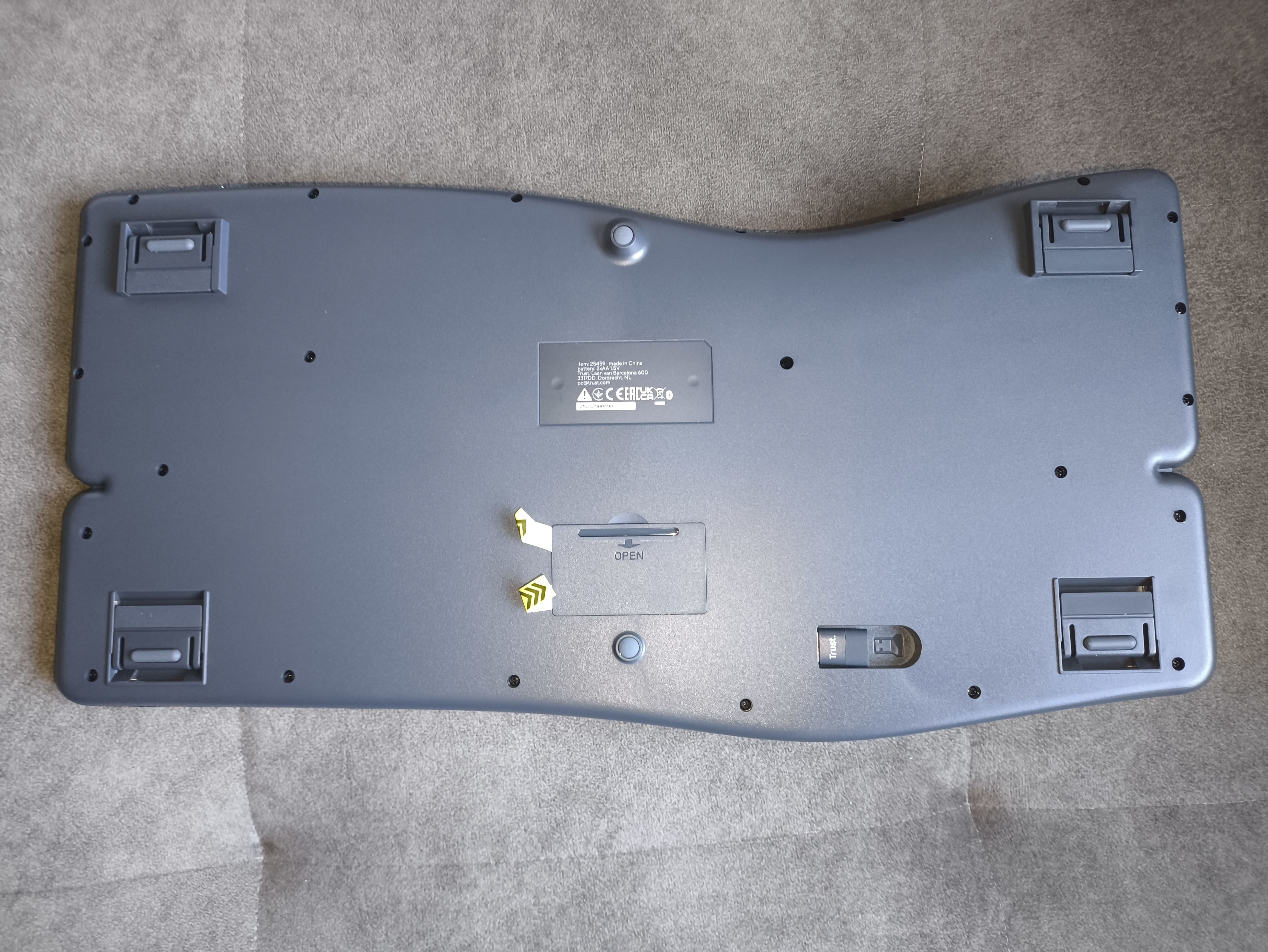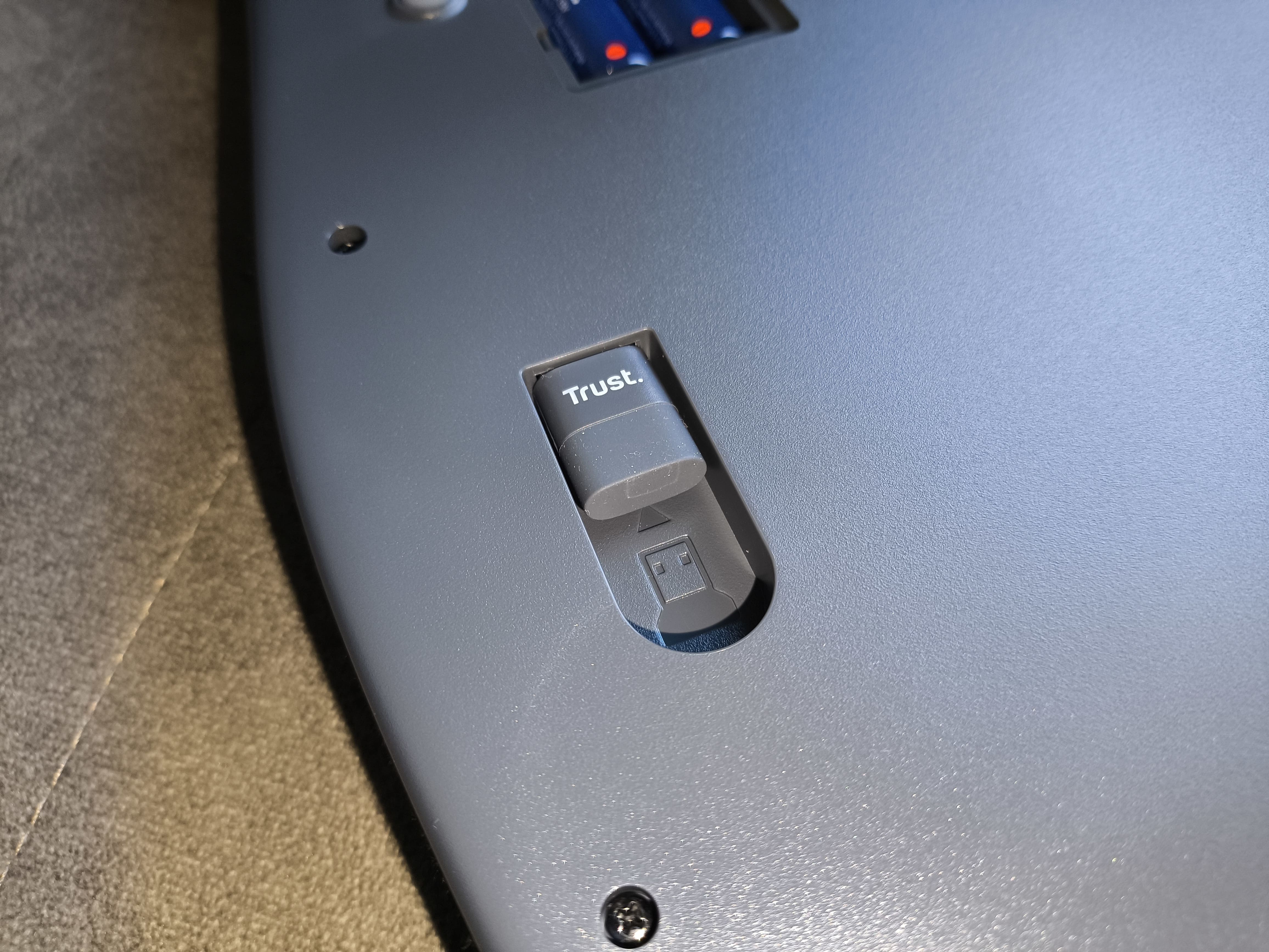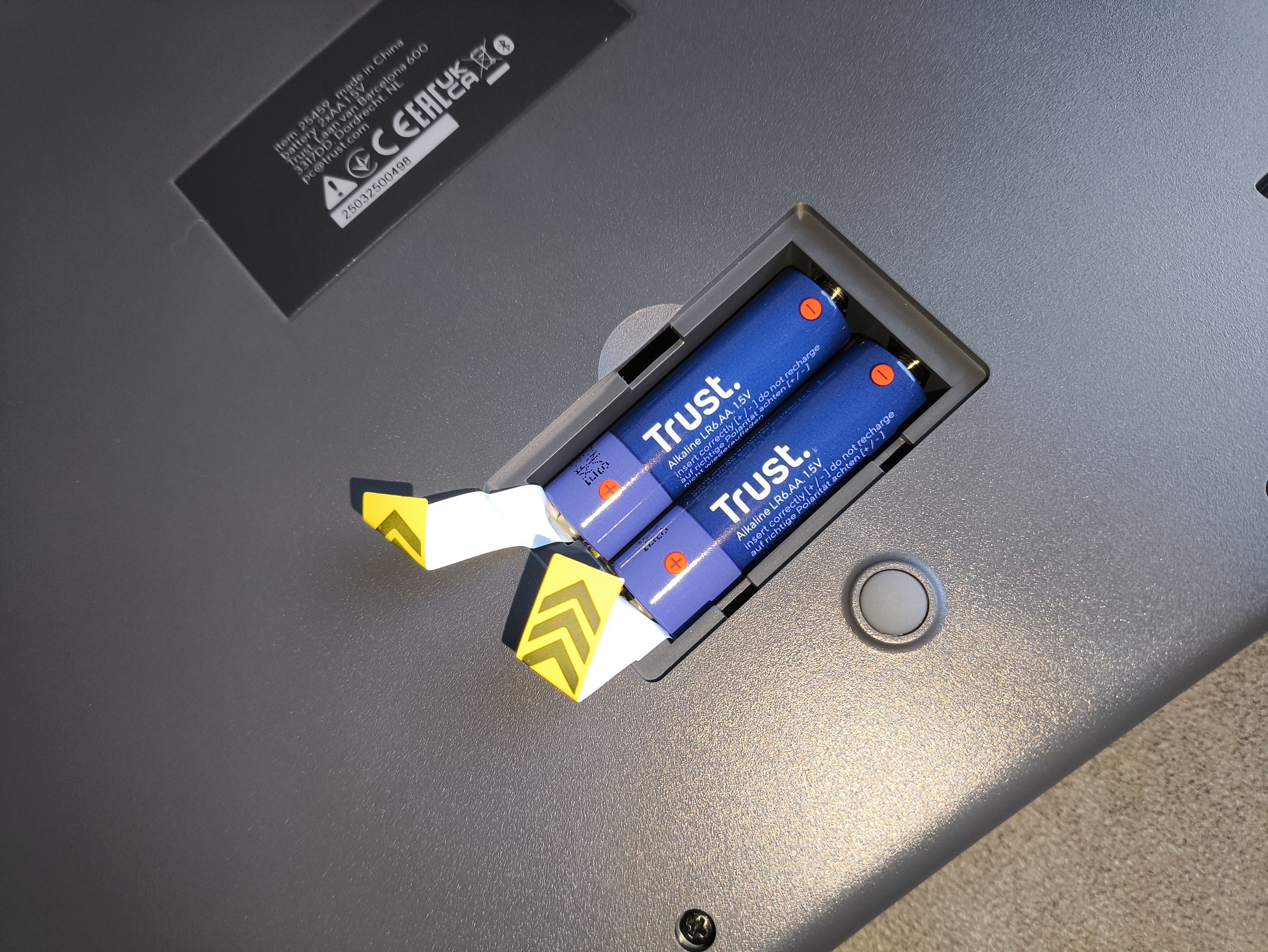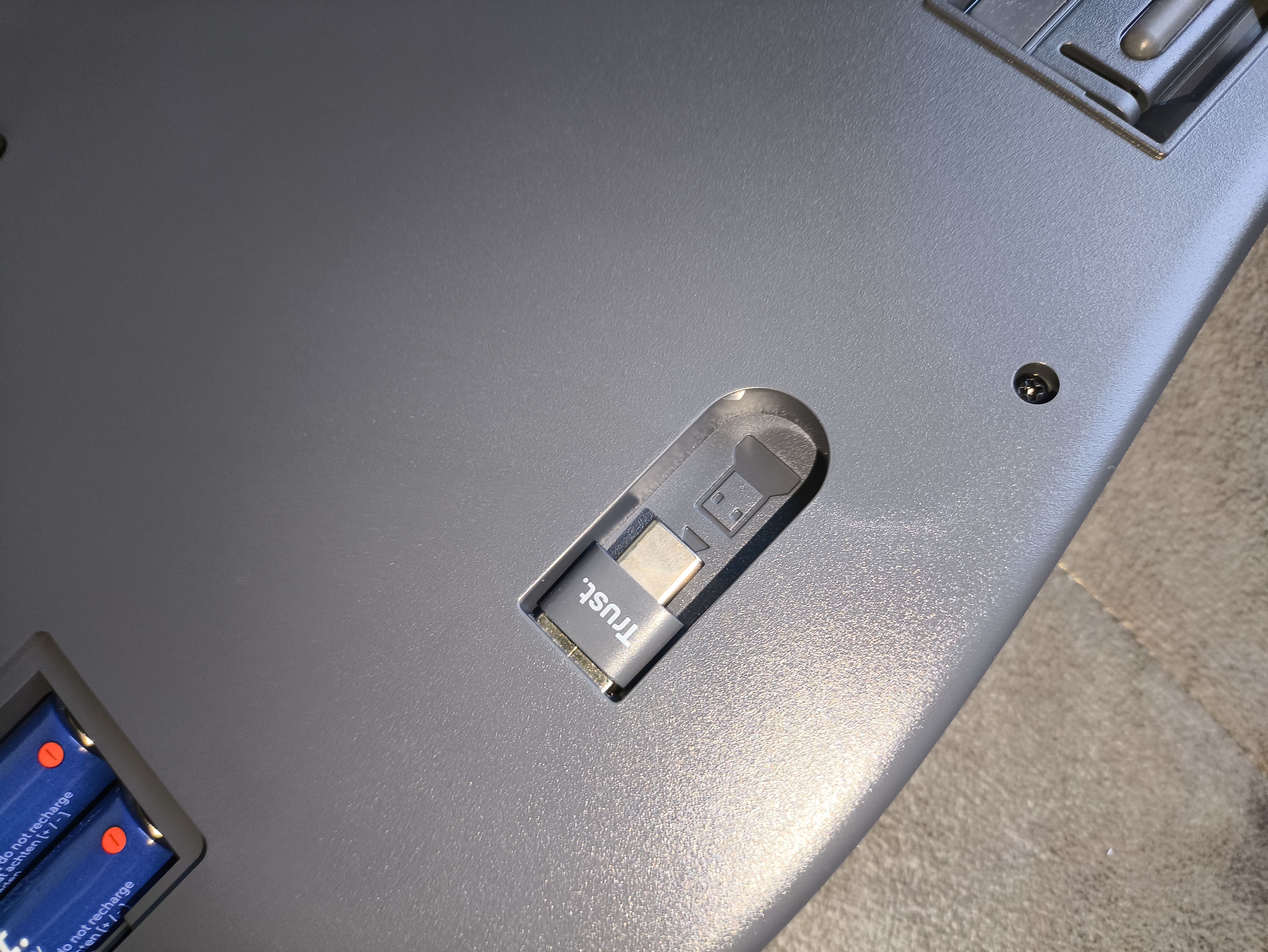 Na spodzie klawiatury przewidziano specjalną szczelinę do przechowywania odbiornika bezprzewodowego, co ułatwia transport i minimalizuje ryzyko zgubienia małego elementu. Do zasilania wymagane są dwie baterie AA, które należy umieścić w przeznaczonym dla nich, odwróconym dołem, wejściu.
