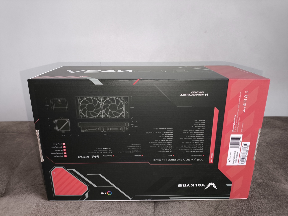 Chłodzenie Valkyrie V240 Lite Black ARGB dostarczane jest w estetycznym czerwono-czarnym pudełku. Front opakowania prezentuje nazwę modelu oraz najważniejsze parametry techniczne, natomiast szczegółowa specyfikacja umieszczona została z tyłu.