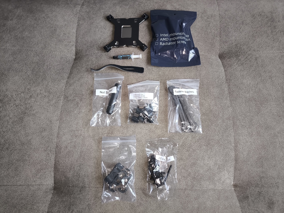 Przechodząc do opakowania i wyposażenia: wnętrze zostało zorganizowane bardzo starannie. Producent zabezpieczył chłodnicę z fabrycznie zamontowanymi wentylatorami (co zawsze warto docenić – ułatwia to montaż i minimalizuje ryzyko uszkodzeń), a wszystkie akcesoria montażowe podzielono według platform i zapakowano w opisane woreczki strunowe. To prosty, ale bardzo wygodny sposób przechowywania elementów montażowych, który powinien być standardem rynkowym.