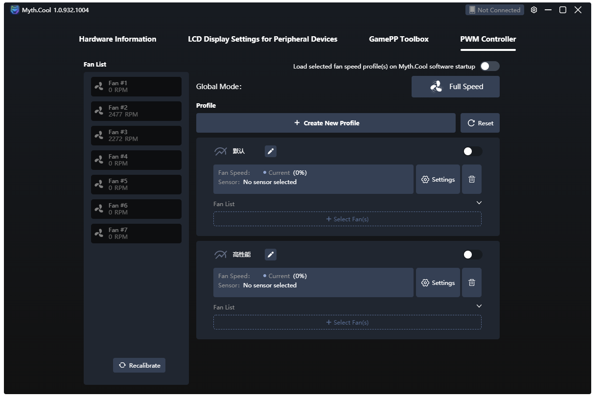 Ostatnia główna zakładka służy do konfiguracji pracy wentylatorów oraz pomp. Użytkownik może dowolnie tworzyć i modyfikować profile obrotów dla chłodzenia procesora, karty graficznej, wentylatorów obudowy oraz samej pompy AIO. Każdy profil może zostać dostosowany pod różne scenariusze działania – od ciszy, po maksymalną wydajność. Wszystko w ramach jednego, spójnego interfejsu.