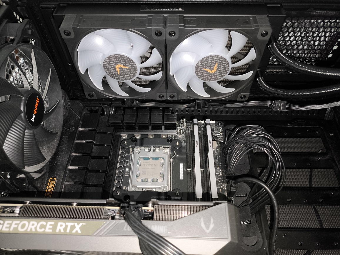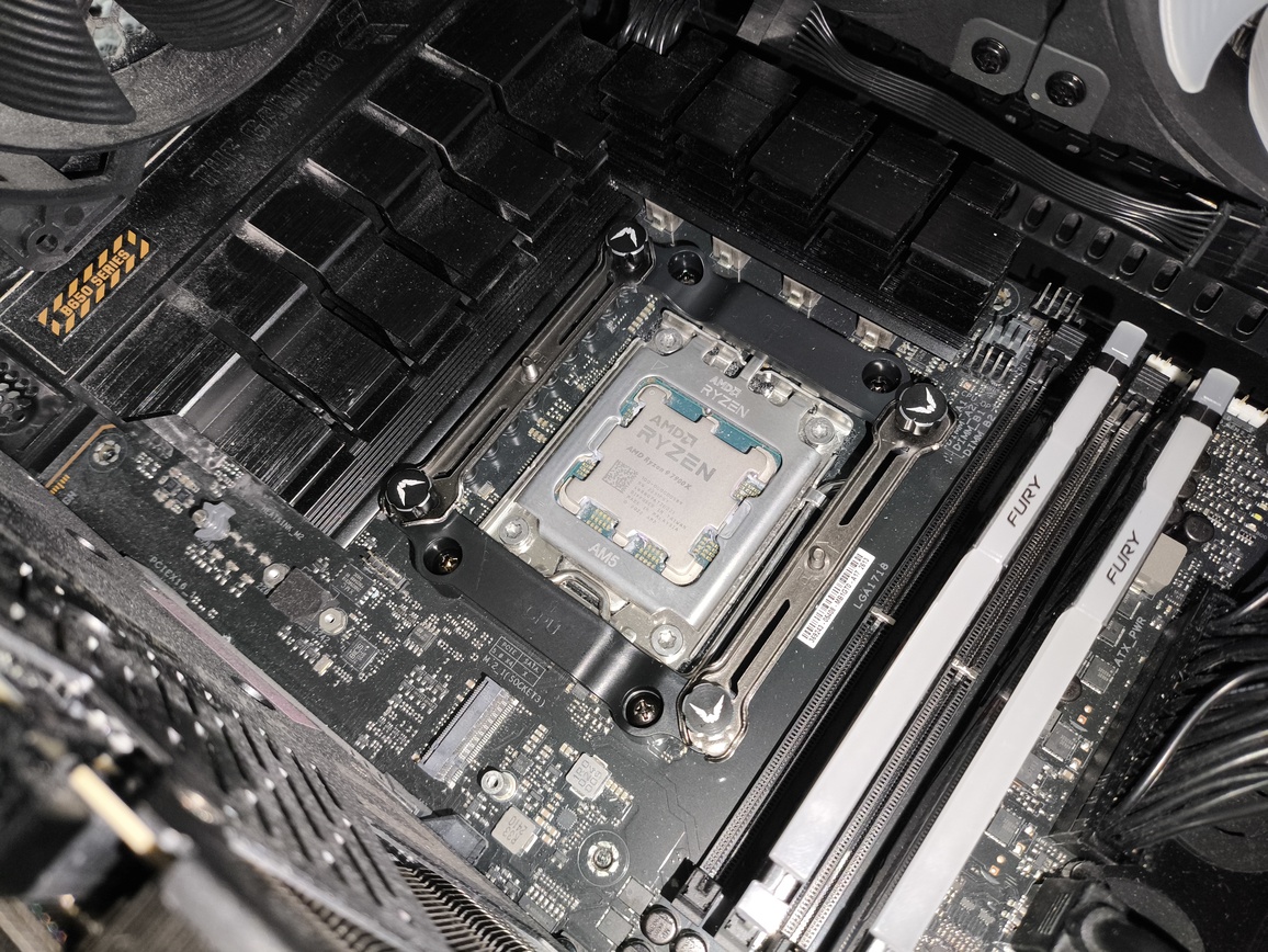Montaż na sockecie AM5 zasadniczo też jest prosty, ale. W trakcie instalacji na mojej platformie odnotowałem drobną uwagę techniczną, o której musze wspomnieć. Chłodzenie wykorzystuje dość nietypowy system mocowania, oparty na dwupunktowym kontakcie, co wymaga precyzyjnego ustawienia ramion montażowych. Należy upewnić się, że wsporniki są umieszczone w środkowych otworach każdego z ramion – w przeciwnym razie blokopompka nie trafi poprawnie na gwintowane tuleje.