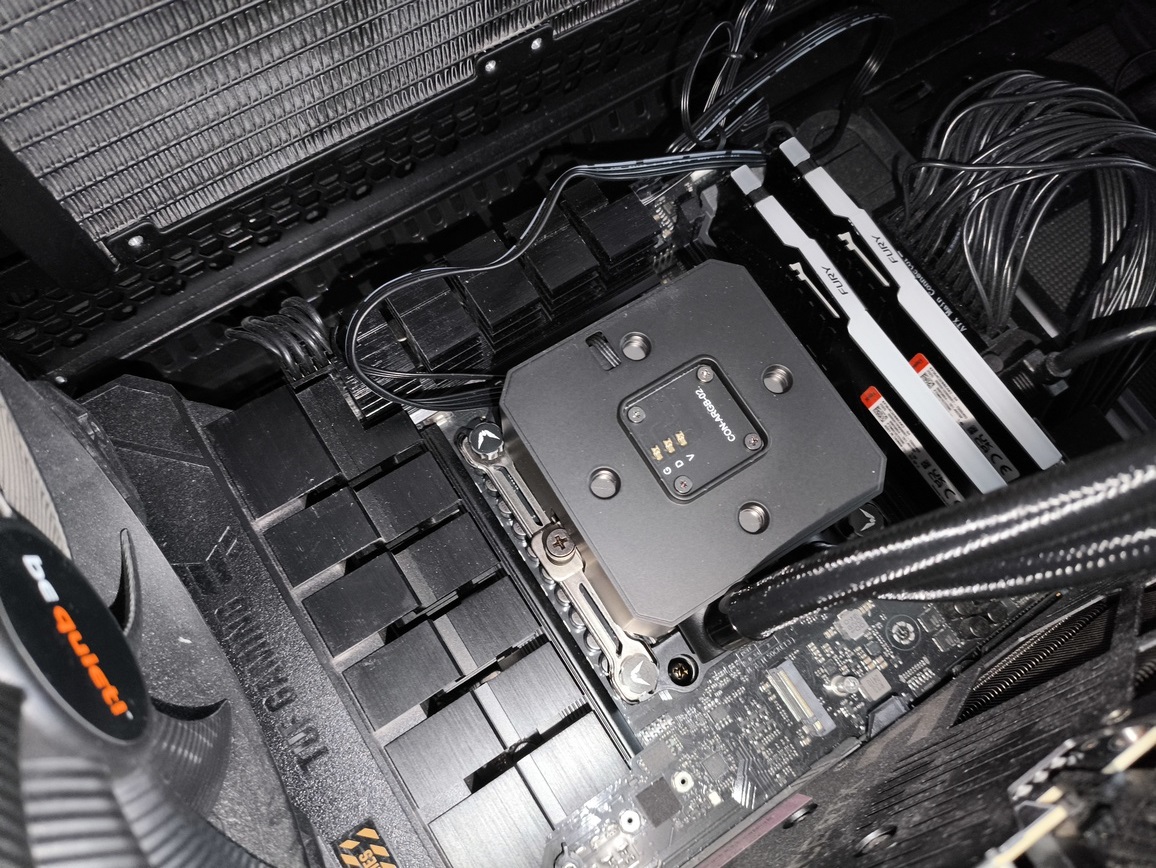 Pasta termoprzewodząca została fabrycznie nałożona na blokopompkę, co dodatkowo upraszcza cały proces — choć oczywiście nic nie stoi na przeszkodzie, aby użyć własnej, jeśli ktoś preferuje inne rozwiązanie. Po przygotowaniu mocowań wystarczy umieścić blokopompkę na procesorze i przykręcić ją do wcześniej zamontowanych wsporników.