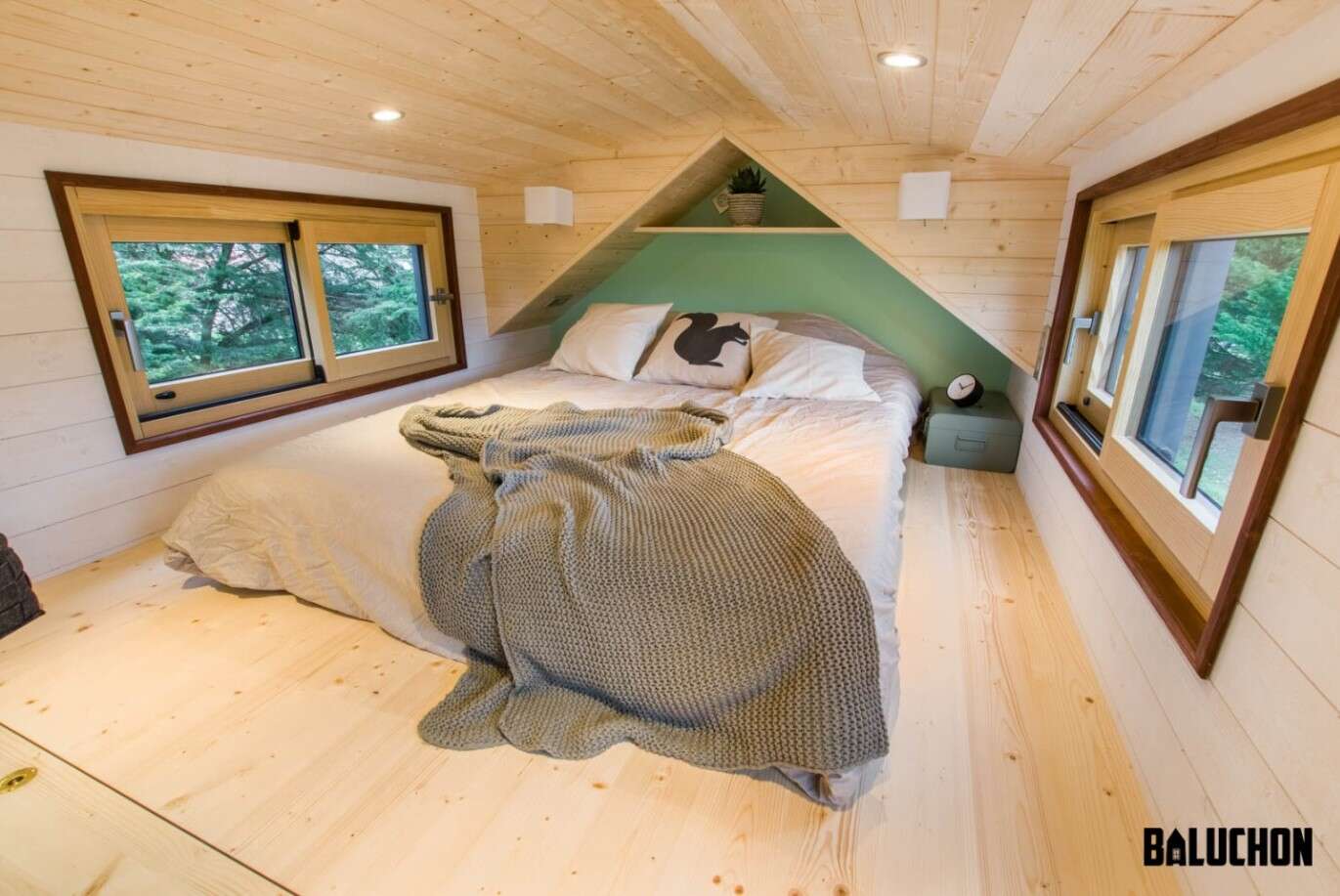 Schody prowadzą do jedynej sypialni domku Le Château Ambulant, która jest typową malutką sypialnią utrzymaną w stylu loftu z ograniczoną przestrzenią nad głową. Tuż przed łóżkiem w podłodze znajduje się ciekawy mechanizm, który na zawołanie rozkłada schowany ekran, podczas gdy resztą zajmuje się pobliski projektor.