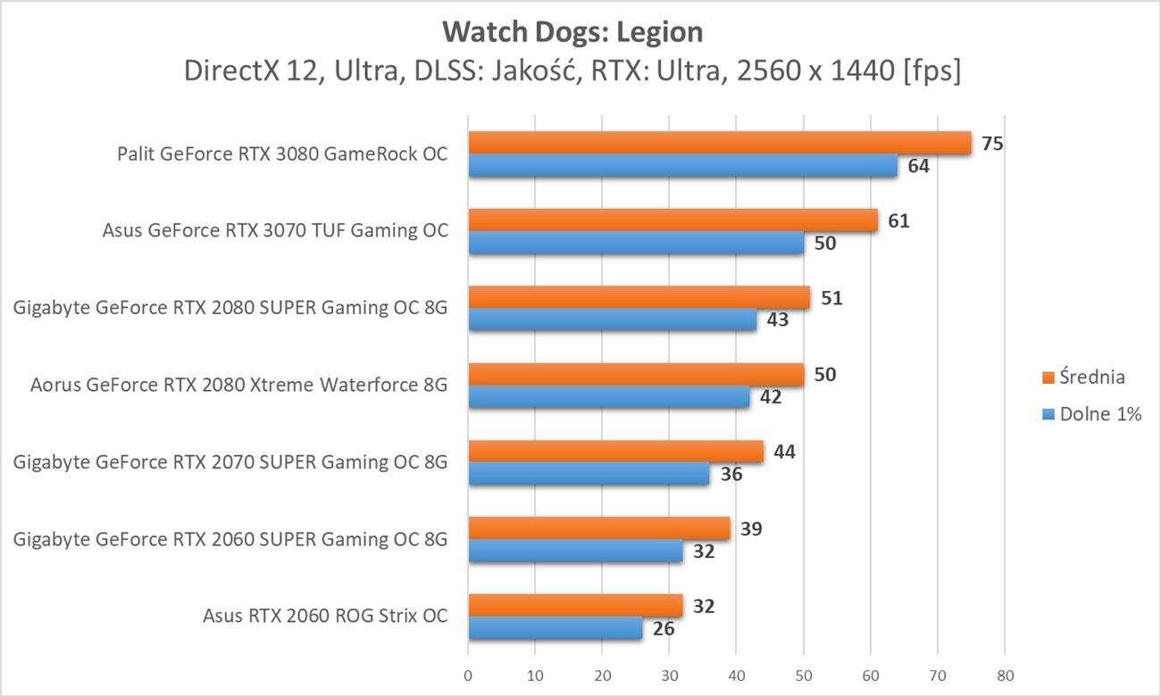Watch Dogs: Legion to gra niezwykle wymagająca na największych ustawieniach. Nawet testy w rozdzielczości 1920 x 1080 px pokazują, że osiągnięcie średnich 60 fps może być wyzwaniem dla większości grafik na rynku. Włączenie ray tarcingu sprawia, że nawet w 2560 x 1440 px żadna z kart nie osiąga średnio 60 fps. Sytuację ratuje DLSS, ale on także w trybie Jakość nie pozwala żadnej karcie na osiągnięcie tej magicznej liczby fps w 4K.