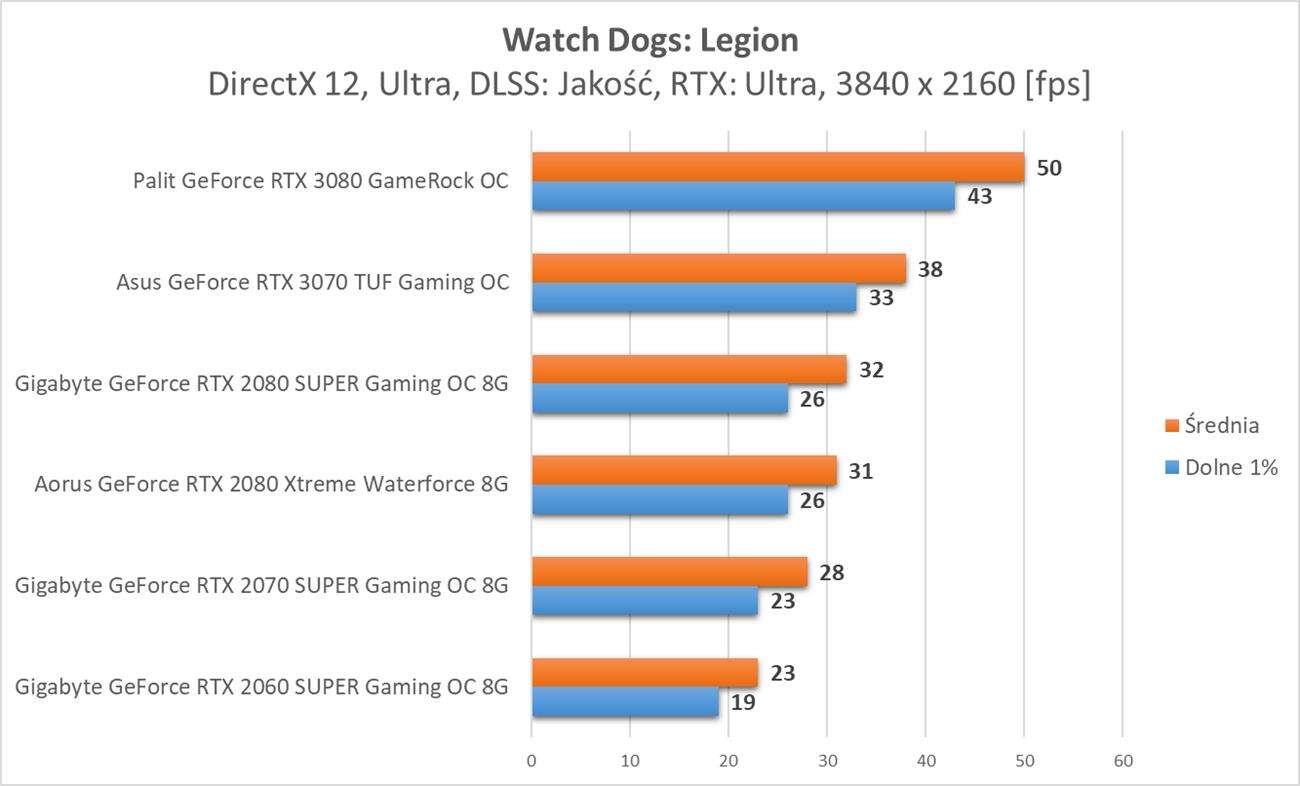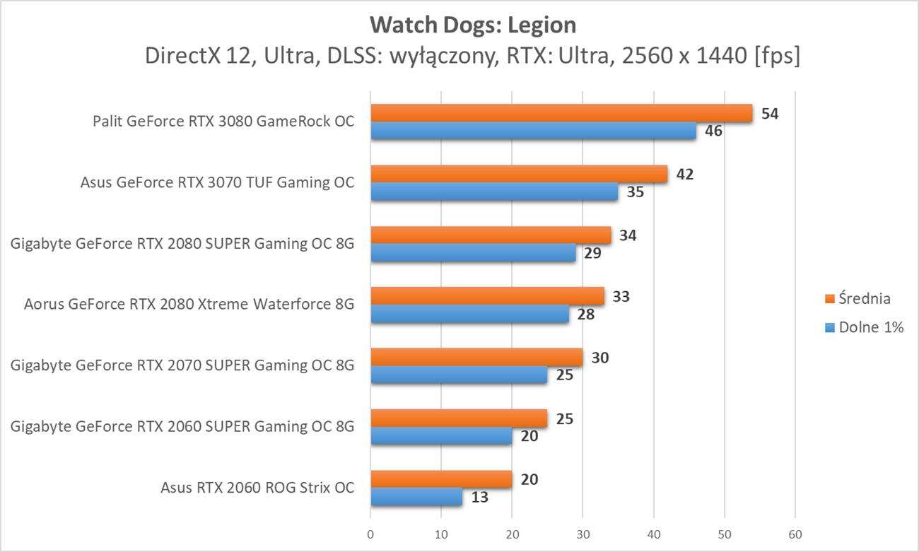 Testy przeprowadziłem przy wykorzystaniu wbudowanego benchmarka. Pozwolił on na uzyskanie bardzo dobrej powtarzalności wyników. Watch Dogs: Legion działa przy wykorzystaniu API DirectX 12. W testach wykorzystałem też najnowsze sterowniki Nvidia Game Ready 457.09. Na wykresach przedstawiłem tylko wyniki kart, które osiągają średnio powyżej 20 fps.