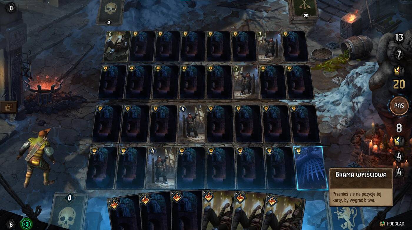 Właśnie, Gwint! Walka w tej produkcji jest przedstawiona w formie pojedynków karcianych, niemal identycznych jak w pełnoprawnym Gwincie, jednak bardzo często urozmaiconych otoczką fabularną, czy specjalnymi zasadami, takimi jak predefiniowana talia, czy zagadka logiczna polegająca na pokonaniu przeciwnika w określonej ilości ruchów i z gotowym zestawem kart. Wartym wspomnienia jest to, że istnieje tryb fabularny z możliwością pominięcia pojedynków karcianych, co z pewnością spodoba się osobom chcącym poznać historię, a niespecjalnie lubiących karciane pojedynki.
