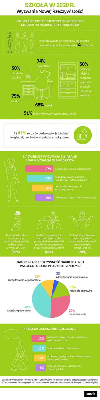 Tylko ⅓ rodziców nie zgadza się ze stwierdzeniem, że nauka zdalna z domu może być równie efektywna, co stacjonarna – wynika z badania przeprowadzonego w sierpniu przez SW Research dla Empiku. Nieoczekiwane zamknięcie szkół w połowie marca sprawiło, że zarówno uczniowie, jak i rodzice, stanęli przed wyzwaniem organizacji edukacji w domowych warunkach. W tym tygodniu dzieci powróciły już do klas, warto więc wyciągnąć lekcje z okresu społecznej izolacji i skorzystać z nich w nowym roku szkolnym – urządzając zarówno przestrzeń do nauki, jak i zapewniając wsparcie w rozwoju nowych umiejętności.
