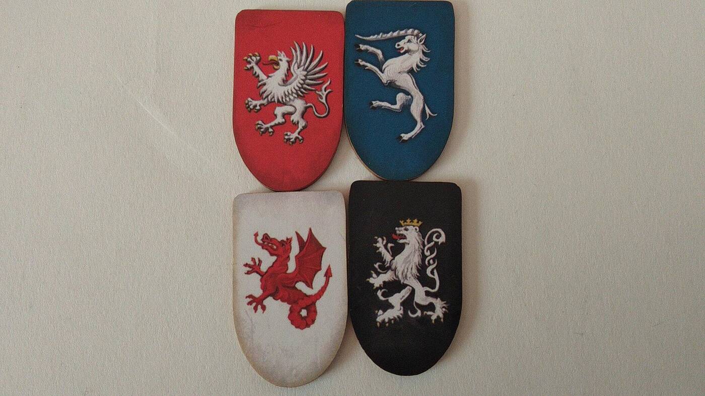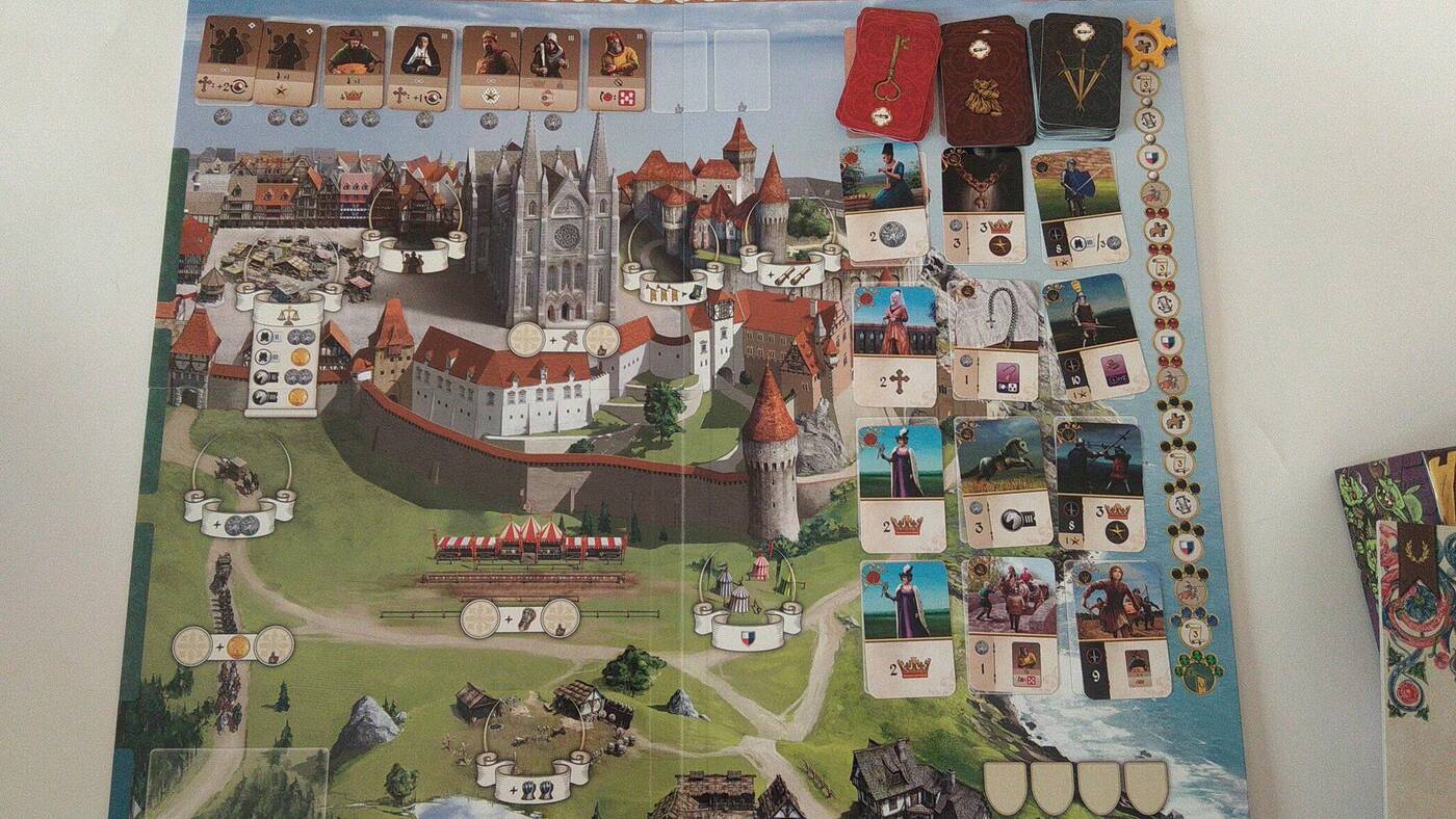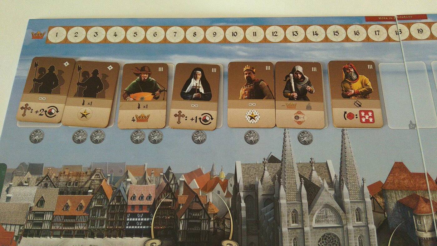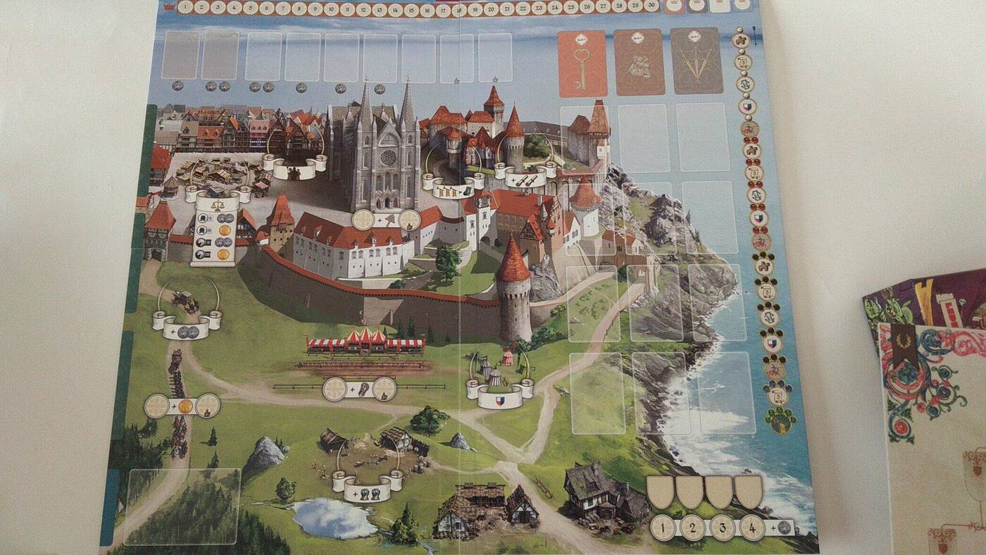 Przede wszystkim należy pochwalić twórców Glory za zawartość – elementów jest naprawdę mnóstwo i nawet w obecnej formie prezentują się bardzo dobrze. Ale po kolei. Mamy więc główną planszę reprezentującą średniowieczne miasto, z pełną dbałością o szczegóły historyczne. Na chwilę obecną występują jeszcze pewne pustki na obszarach, ale zostałem zapewniony, że to się zmieni, podobnie jak tła na kartach.. Sam układ planszy zaś przypomina mi nieco ten znany chociażby z Najeźdźców z Północy. Mamy całą masę bardzo ładnych żetonów, świetnie wyglądające znaczniki akcji w formie rycerzy na koniach oraz mnóstwo wszelkiego rodzaju kart. Mówiąc krótko – zawartości w Glory: A Game of Knights nie brakuje.
