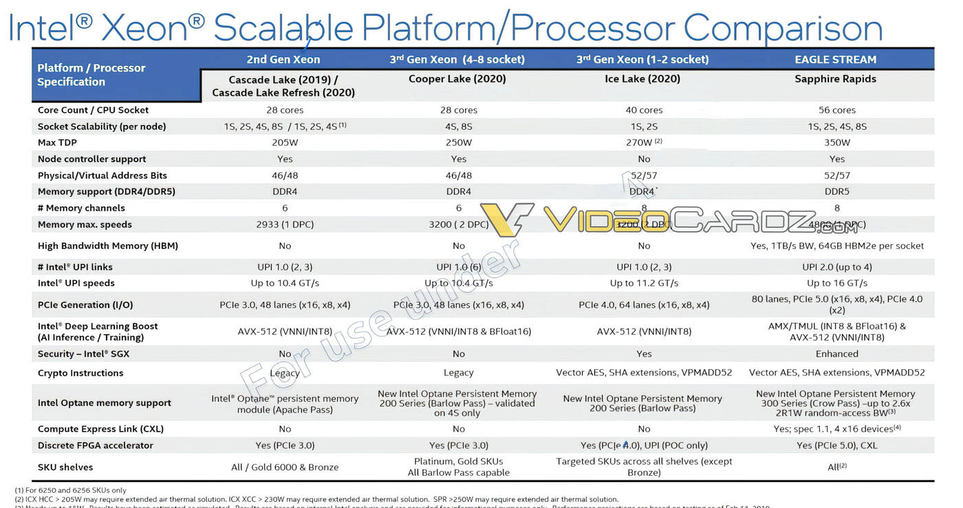Wygląda na to, że procesory Intel Sapphire Rapids będą oferować do 56 rdzeni i współpracować na raz z maksymalnie ośmioma procesorami. Ich TDP ma wynosić 350W, czyli o 100 W więcej względem Cooper Lake. Idąc dalej, Intel Xeon Scalable czwartej generacji będzie obsługiwał DDR5 do 4800 MHz, do 80 linii PCI Express w ramach gniazd PCIe 5.0 generacji x16, x8, x4 i PCI Gen4 x2.