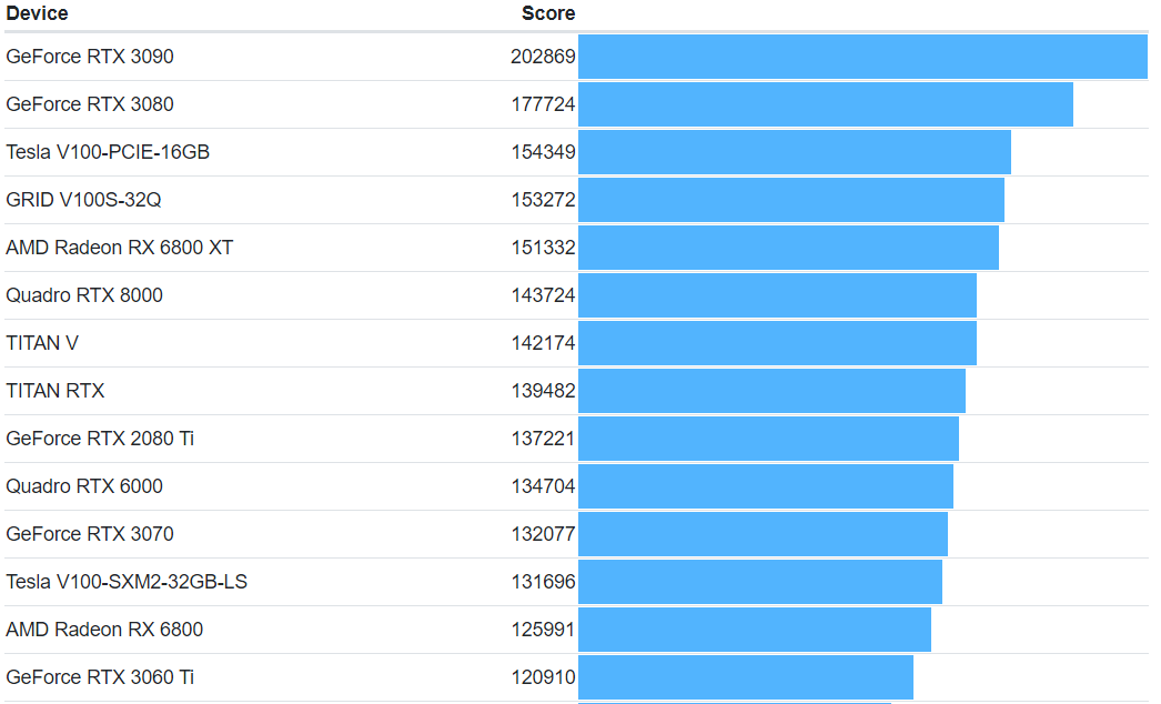Z wynikiem 169779 punktów OpenCL, Radeon RX 6900 XT jest o 12% szybszy niż RX 6800 XT i 35% szybszy niż RX 6800. Co ciekawe, RX 6900 XT ma 11% więcej procesorów strumieniowych niż RX 6800 XT i 33% więcej niż RX 6800, co po porównaniu z wynikami zapewnia ciekawe wnioski. Niestety ta karta AMD nadal przegrywa z NVIDIA Geforce RTX 3080 i RTX 3090, które są wydajniejsze o kolejno 4% i 19%.