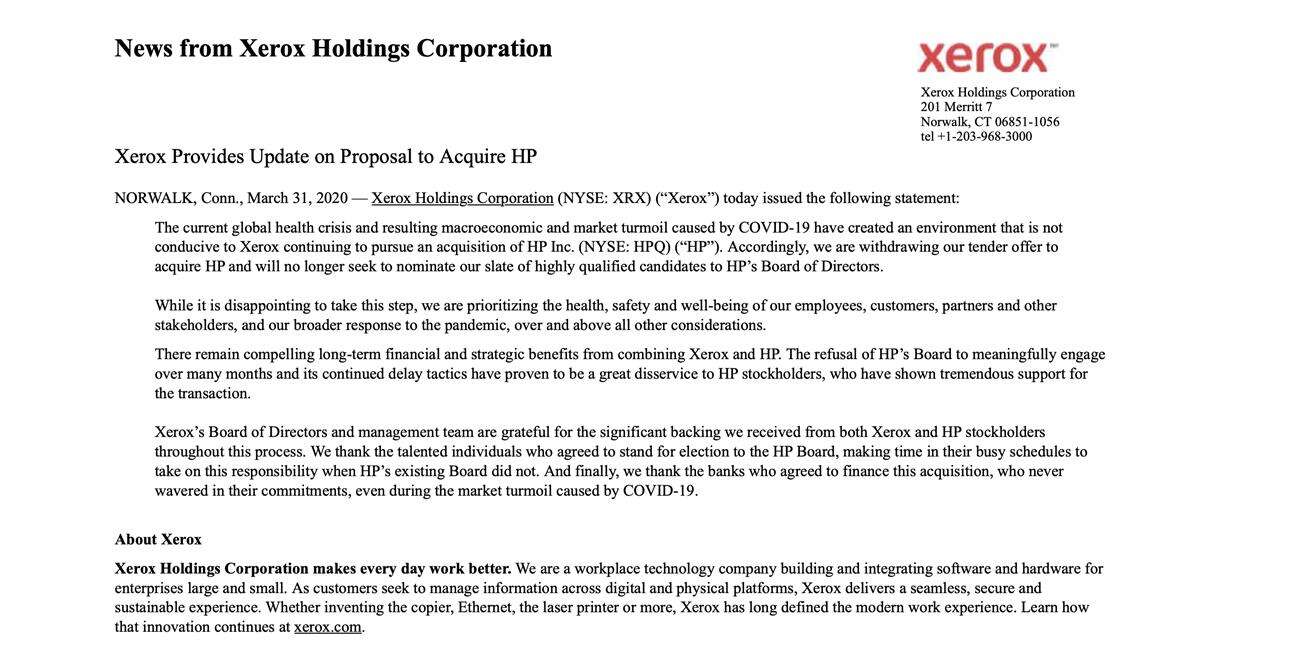 Firma potwierdziła to w najnowszym oświadczeniu. Położyła ona kres trwającej walce i oficjalnym próbom przejęcia HP. Z leżących u podstaw tej decyzji powodów wymienia koronawirusa. Ten sprawił, że wartość rynkowa obu firm spadła i Xerox musi zająć się teraz sobą.