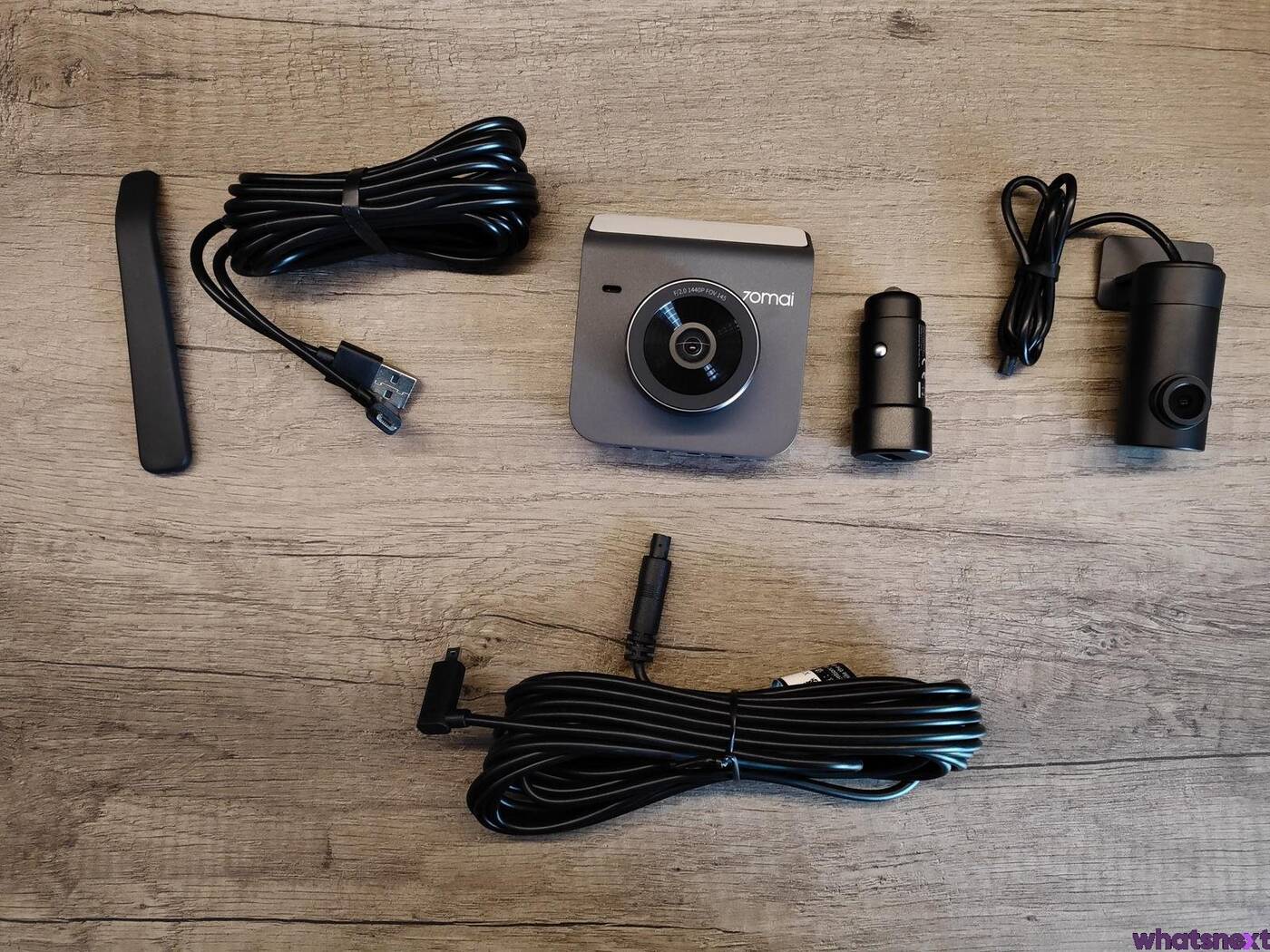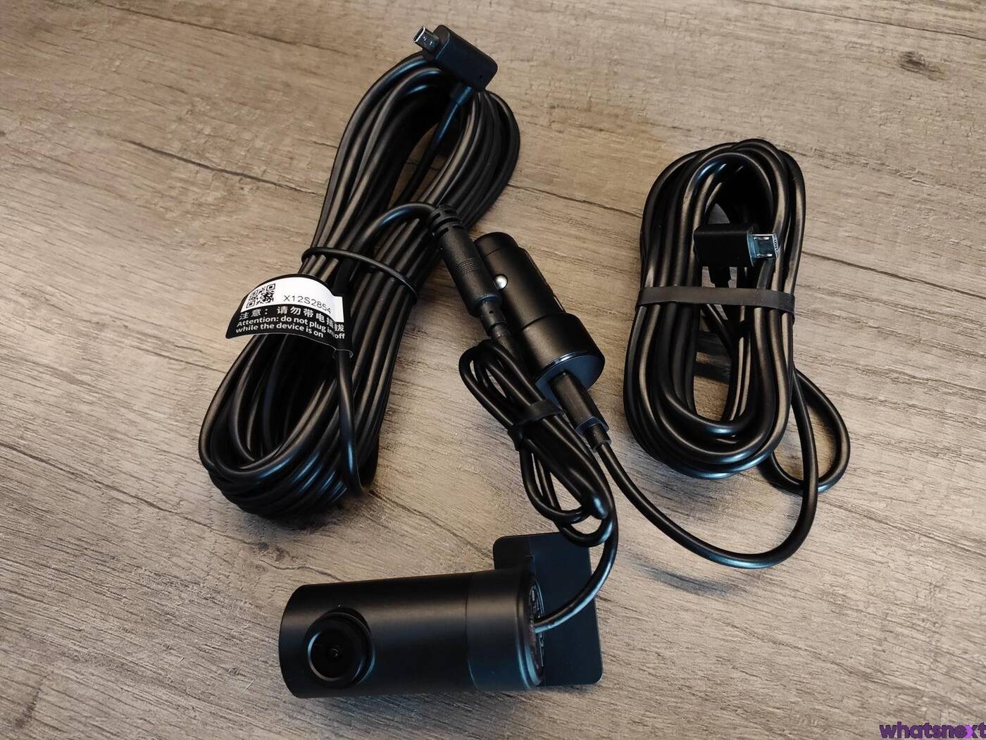Po zsunięciu obwoluty naszym oczom ukazują się liczne złote ozdóbki, a po ściągnięciu z głównego pudełka w formie twardego kartonu wieczka, wreszcie położymy na wideorejestratorze swoje rączki. Oprócz niego w zestawie znajdziemy kamerkę na tył, długi przewód, umożliwiający jej połączenie z głównym modułem, przewód USB-A do microUSB z opcją dopięcia modułu do ładowarki samochodowej.