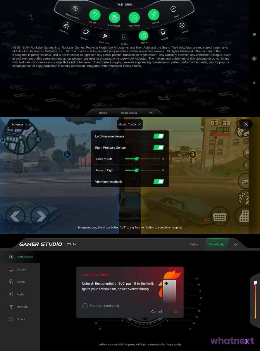 Zdecydowanie najbardziej przydatną funkcją gamingową jest Mater Touch. Można ją określić mianem skrótu klawiszowego. Ekran dzielony jest na pół. Dotykając go mocniej w obszarze połówki aktywujemy zdefiniowany wcześniej przycisk. Dla przykładu, przycisk odpowiadający za strzelanie w Call of Duty Mobile ustawiam po lewej stronie ekranu, a strzelanie z jednoczesnym celowaniem po prawej. Jeśli chcę strzelić szybko, wciskam lewą połówkę ekranu, a jeśli precyzyjnie – prawą. Działa to niezależnie, więc mogę w tym samym czasie poruszać postacią lewy kciukiem, ale w tym samym czasie strzelać poprzez dociśnięcie ekranu. W dynamicznych grach sprawdza się to bardzo dobrze. W obsłudze pomagają bardzo dobrze działające wibracje, bo dzięki nim mamy wrażenie, że faktycznie zatapiamy palec w ekranie. Siłę nacisku wywołującą akcję można modyfikować. Przewaga w graniu, jak np. we wspomnianym Call of Duty, jest całkiem spora.