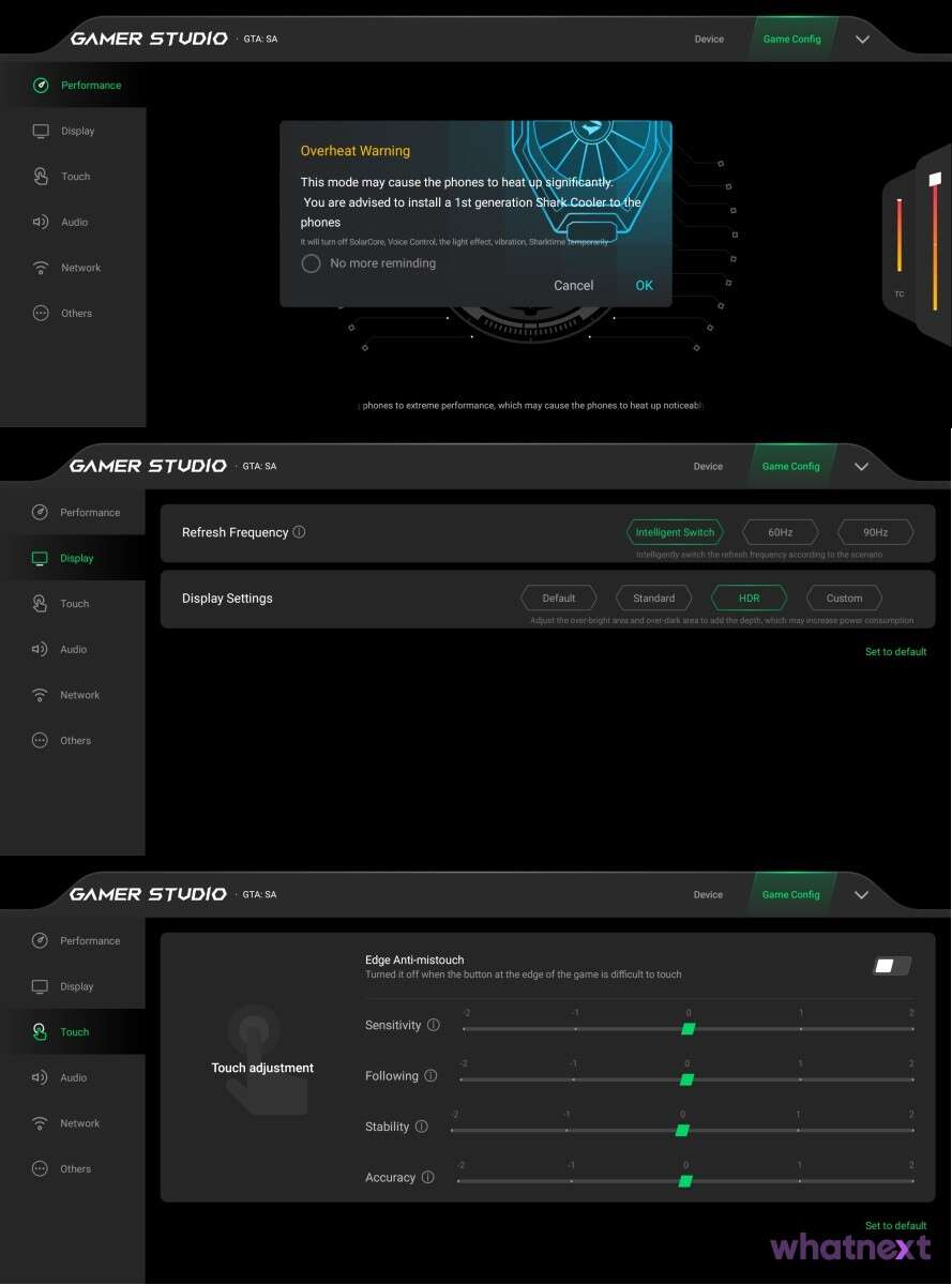 Shark Space to specjalna, gamingowa funkcja uruchamiana suwakiem na boku obudowy.  Uruchamiając gry w ten sposób dostajemy dostęp do szeregu opcji poprawiających jakość rozgrywki. Przede wszystkim Shark Space ogranicza wszelkie zbędne procesy w tle, zwiększając wydajność smaatfonu. Można tutaj uruchomić funkcje Nie przeszkadzać, dzięki której w trakcie grania nie będziemy dostawać powiadomień. Wyłączyć można też połączenia. Dalej mamy opcję optymalizacji połączenia sieciowego, co szczególnie przydaj się w tracie grania online. Truskawką na torcie jest możliwość ręcznego ustawienia wydajności, łącznie ze zignorowaniem przegrzewania się podzespołów. W zasadzie żadna współczesna gra mobilna tego nie potrzebuje, ale jak trzeba – można.