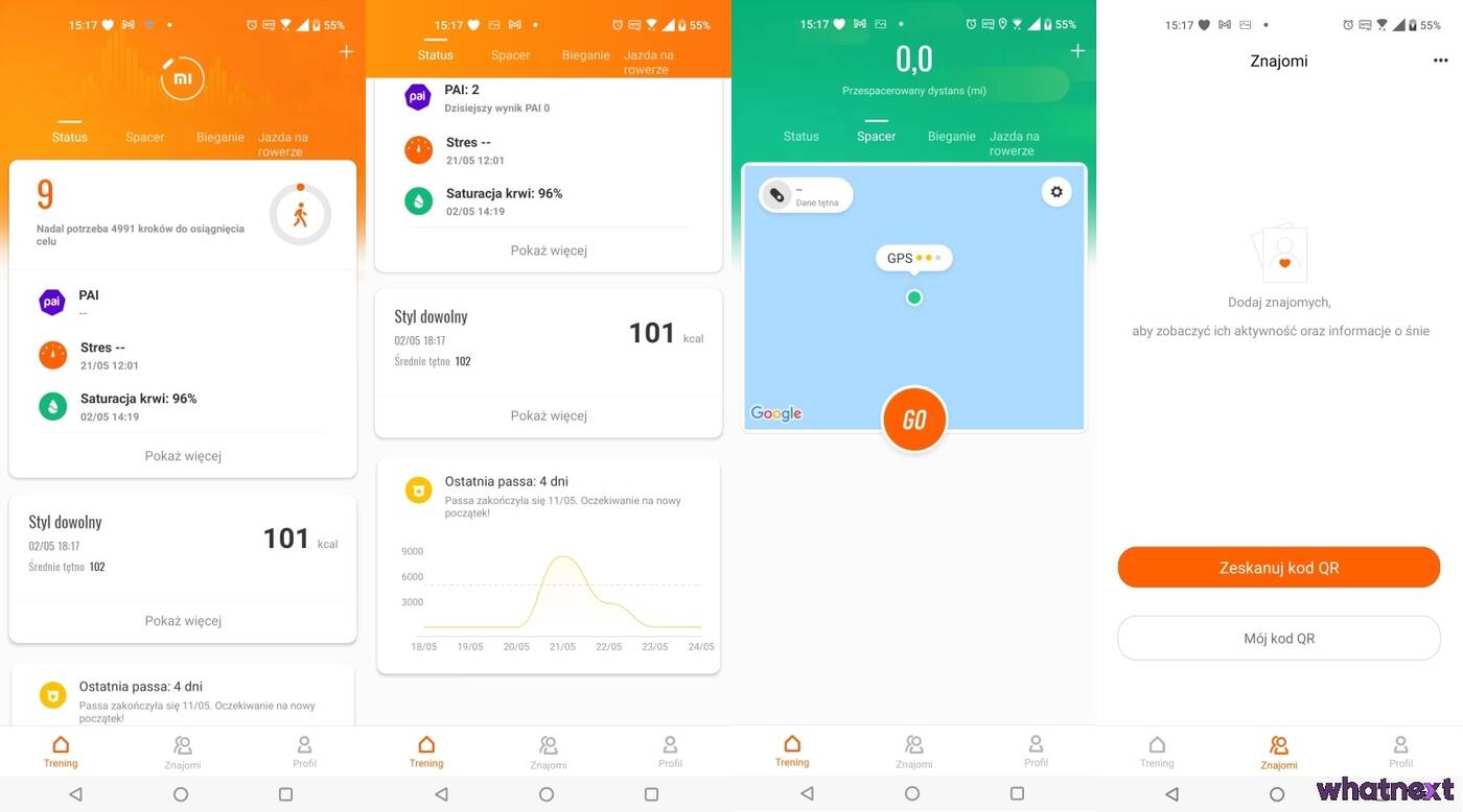 Obie aplikacje służą do tego samego, ale aplikacja Oppo jest wręcz łopatologicznie prosta, podczas gdy Xiaomi wydaje się trochę przeładowana. Kompletnie nie rozumiem np. zakładki Znajomi, która pozwala śledzić aktywność fizyczną oraz… jakość snu znajomych. Ta informacja zmieniłaby moje życie.