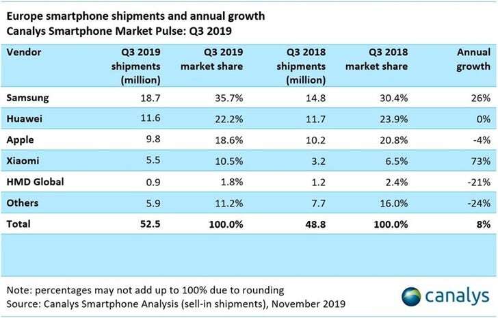 Zgodnie z najnowszymi danymi, Xiaomi jest w Europie na czwartym miejscu z udziałem równym 10,5%. Przed nim jest Samsung, Huawei i Apple. Taka pozycja i tak jest sukcesem – stanowi ona wzrost o 73% w stosunku do 2018 roku.