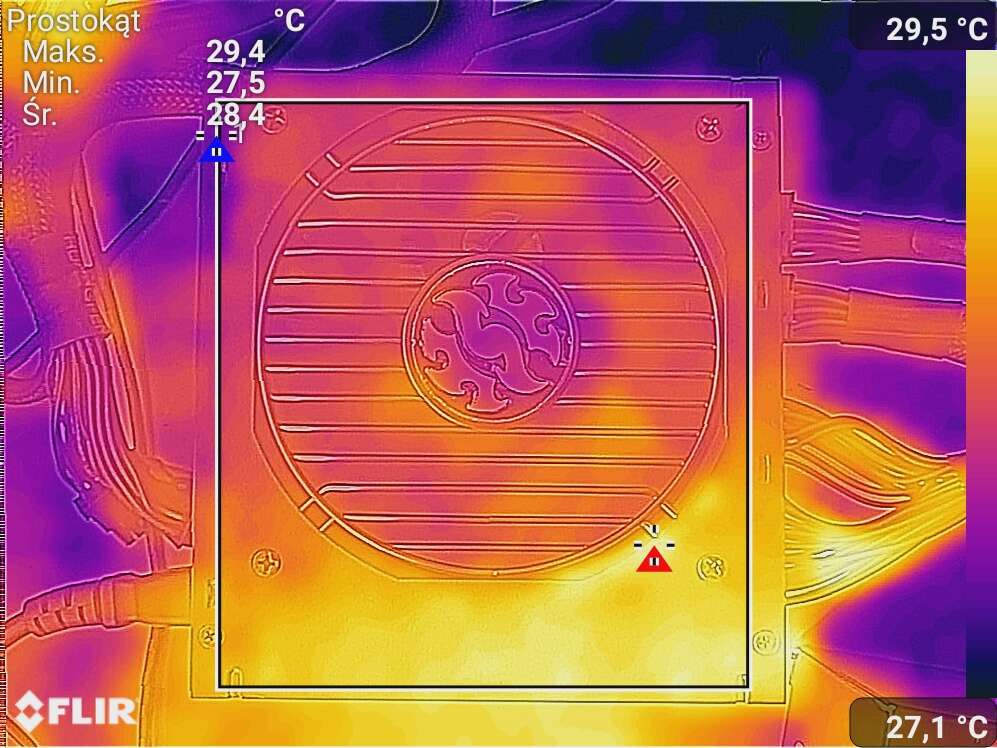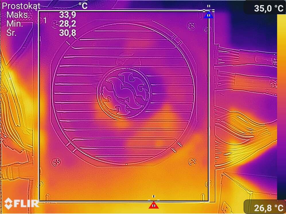 Spoczynek polegał tylko na wyświetlaniu pulpitu. Obciążenie to FurMark + OCCT Linpack. W testach temperatury wykorzystałem moduł termowizyjny smartfonu CAT S61.