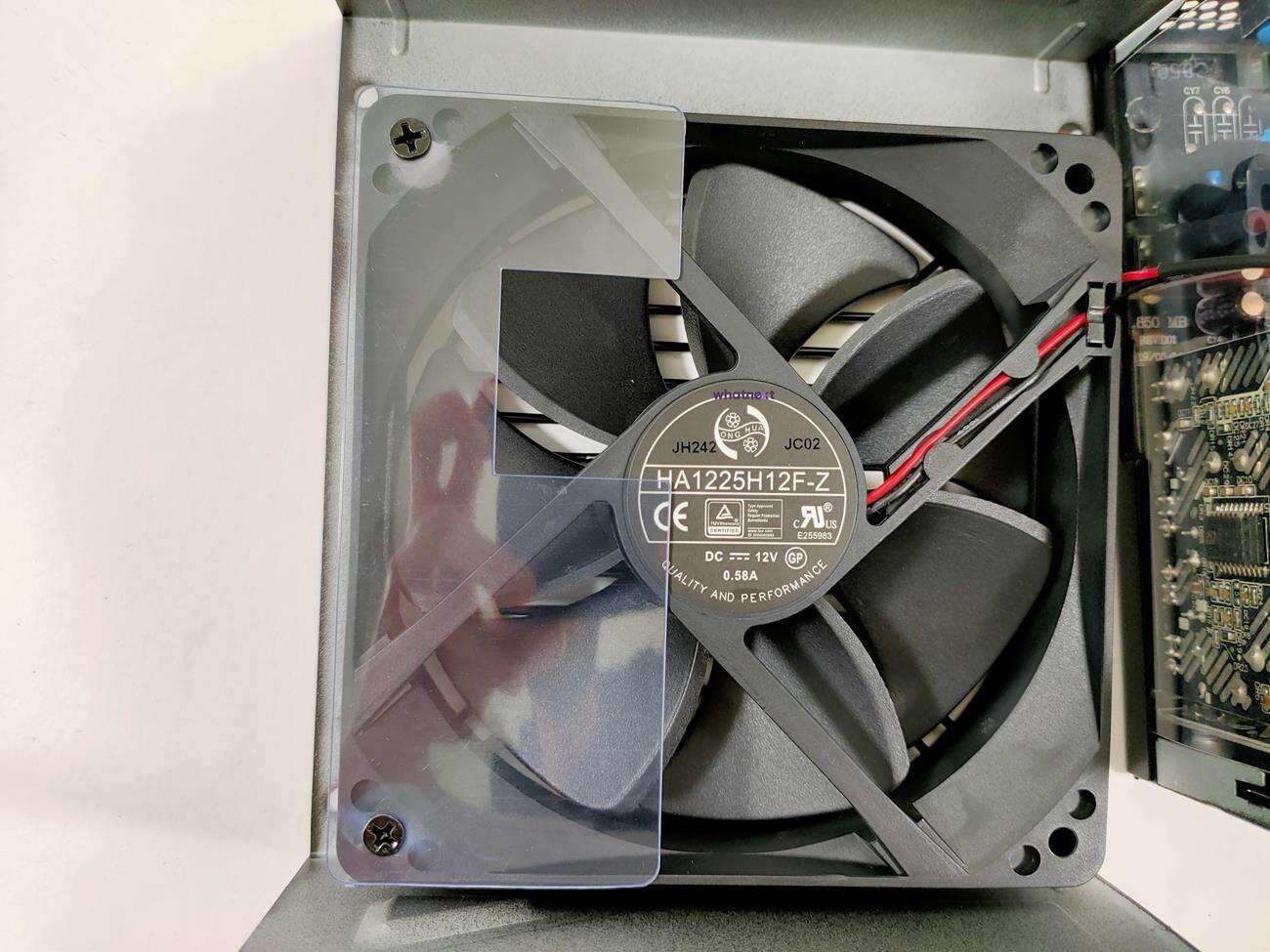 Wentylator to model HA1225H12F-Z firmy Hong Hua. Jest to konstrukcja 120 mm o maksymalnej prędkości 2400 RPM. Producent deklaruje głośność 11,2 dBA dla obciążenia 20%, 11,3 dbA dla 50% oraz 24,7 dBA dla 100%.