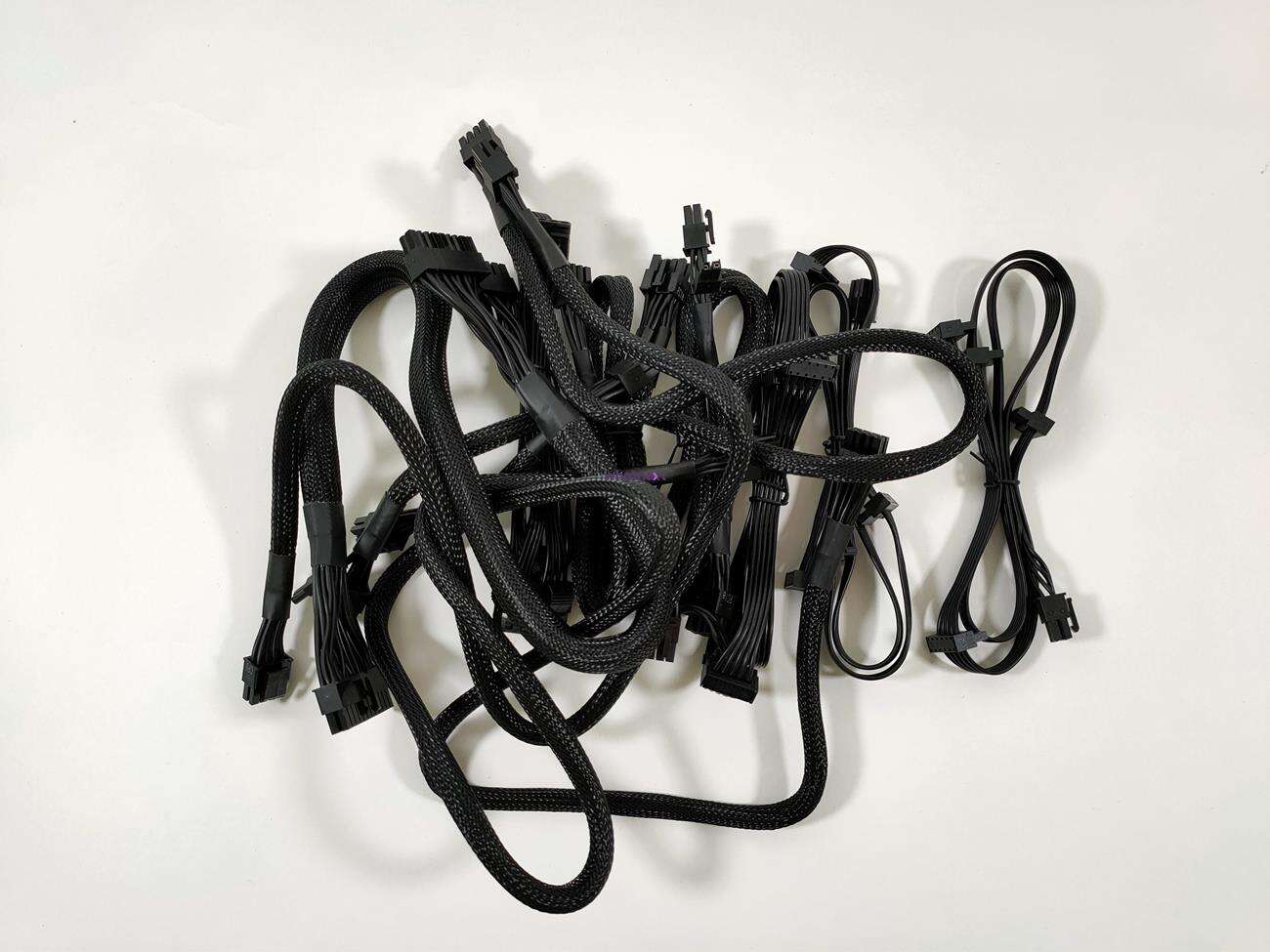 XPG Core Reactor 850W to zasilacz w pełni modularny. Do dyspozycji mamy następujące wiązki: ATX 20+4 pin (650 mm), dwie EPS 4+4 pin (650 mm), dwie 2x PCI-E 6+2 pin (650 mm), dwie 2x PCI-E 6+2 pin (650 mm), trzy 4x SATA (500 mm do pierwszej wtyczki, odległość pomiędzy kolejnymi wynosi 150 mm) oraz 4x Molex (500 mm do pierwszej wtyczki, odległość pomiędzy kolejnymi wynosi 150 mm). Do okablowania mam jednak sporo uwag. brakuje mi mieszanych wiązek SATA + Molex. Także większość kabli (oprócz SATA i Molex) ma okrągły profil z mało elastyczną końcówką. Niestety negatywnie wpływa to na montaż. Kable z płaskim profilem znacznie łatwiej jest przeciągnąć za obudową oraz ładnie ułożyć w środku. Poza tym ilość kabli jest odpowiednia.