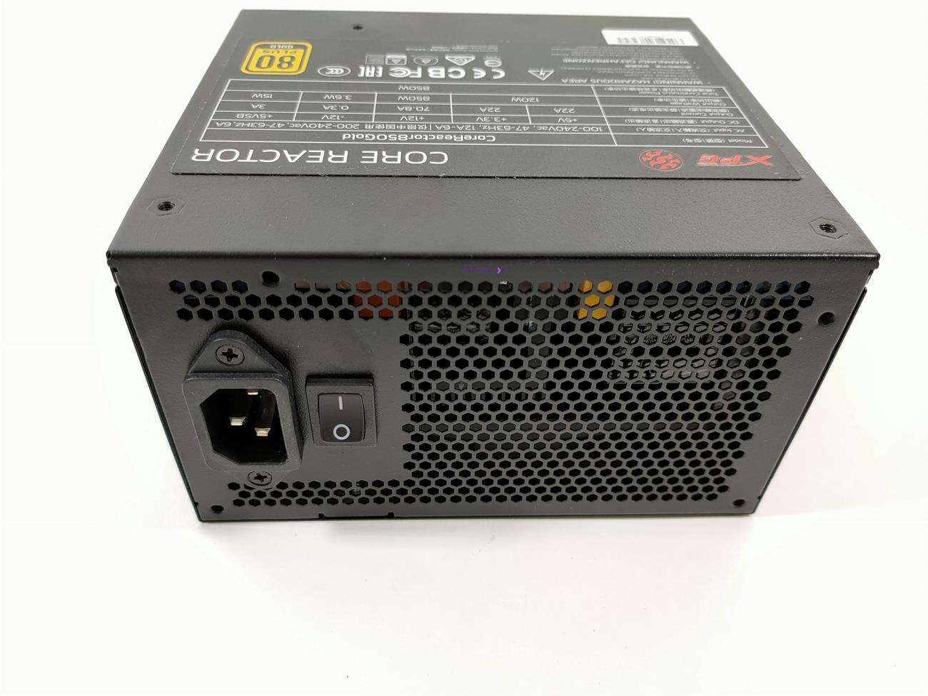 Tył to otwory w kształcie plastrów miodu. Jest tam także włącznik oraz wejście na kabel zasilający. Na spodzie znajduje się tabliczka znamionowa. Zasilacz ma jedną linię +12 V, która oferuje natężenie 70,8 A (850 W). Linie +3,3 V i +5 V oferują po 22 A (łącznie 120 W). Łącznie zasilacz ma 850 W mocy.
