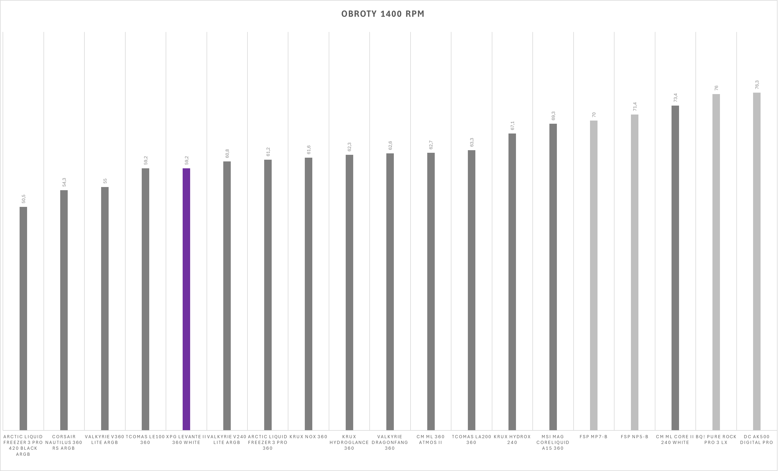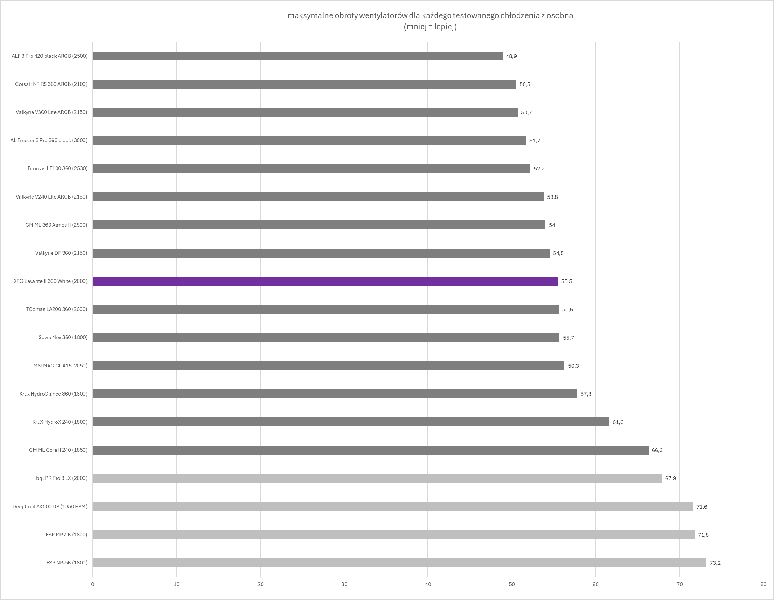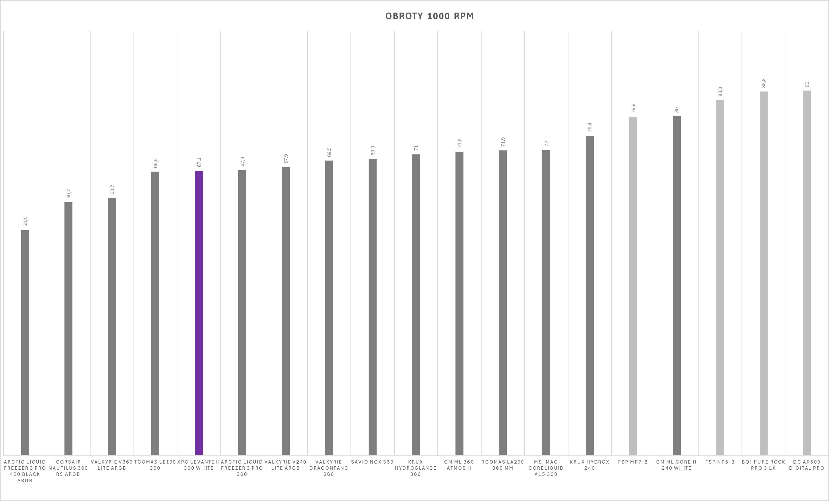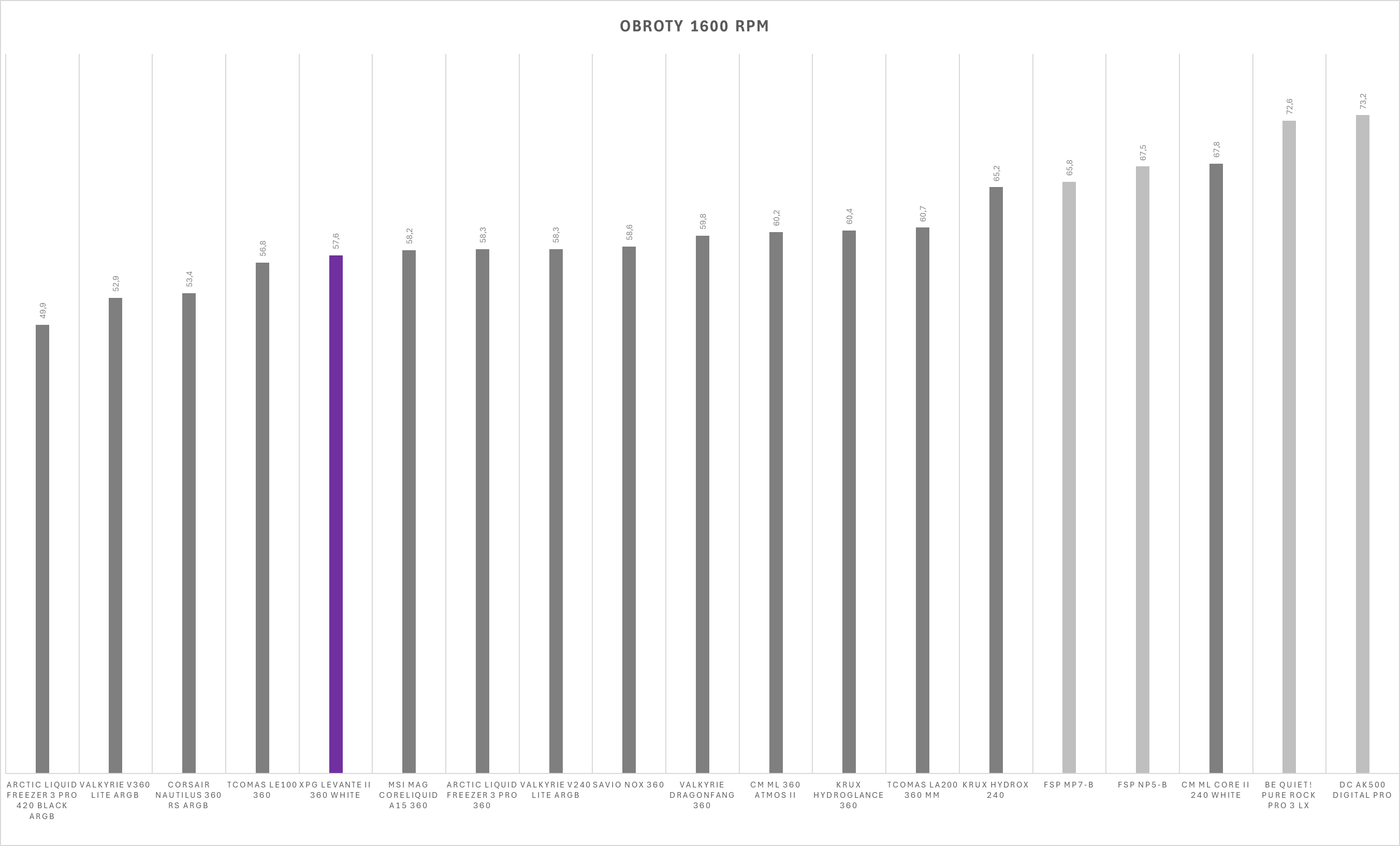 W modelu XPG Levante II 360 White można w pełnym zakresie regulować obrotami wbudowanej pompki. Wyniki są ciekawe, znaczy się w sumie nudne wręcz, bo nieważne, czy pompka kręci się na 25%, czy na 75%, temperatura praktycznie się nie zmienia. Czyli pompka nawet po mocnym skręceniu obrotów nie ma zbytnio wpływu na wydajność całego układu.