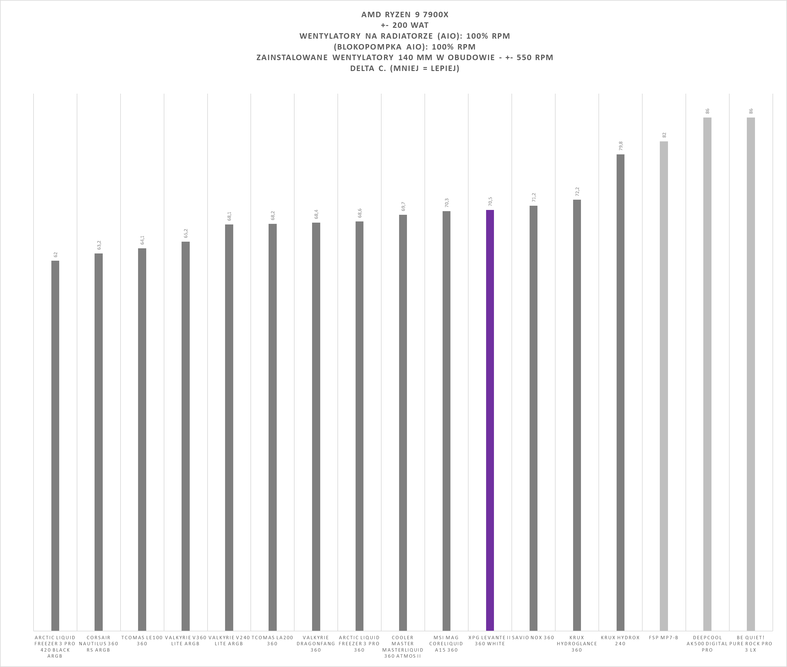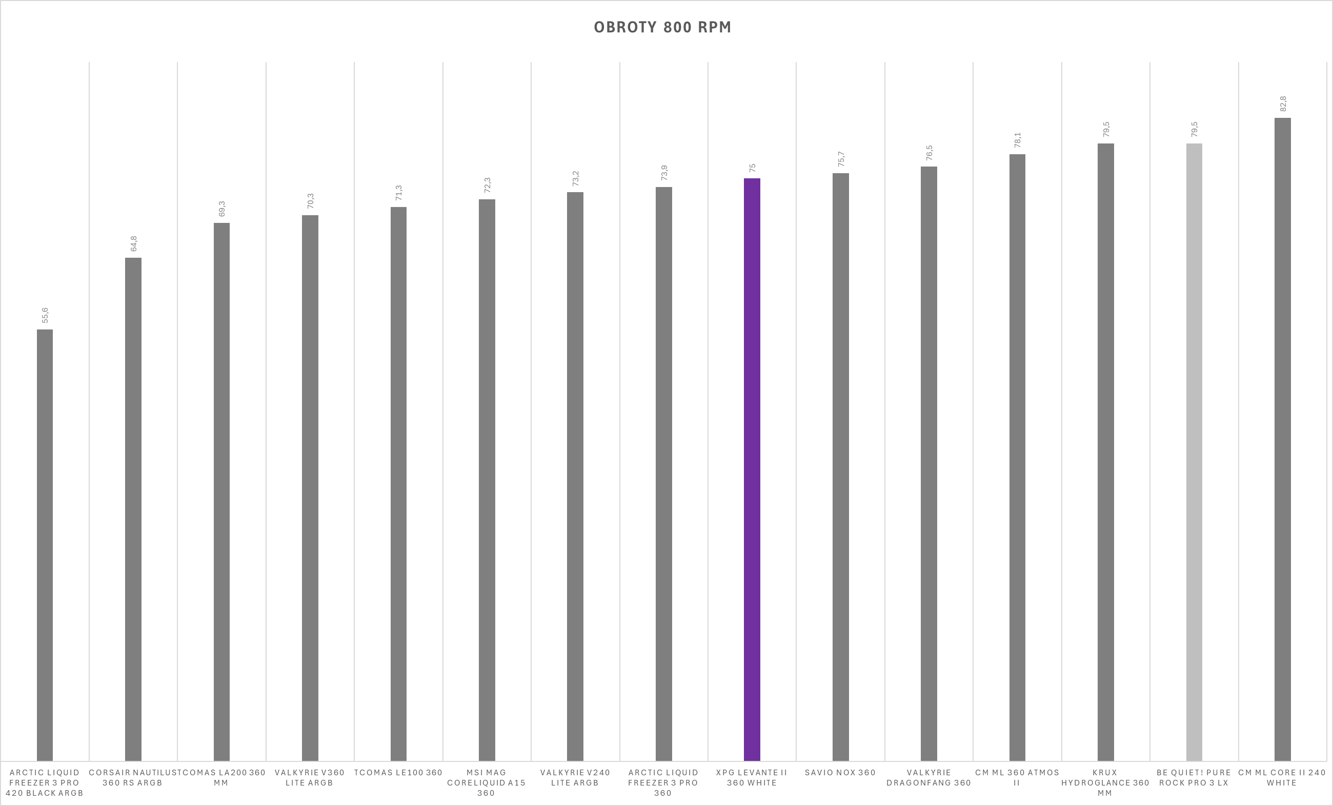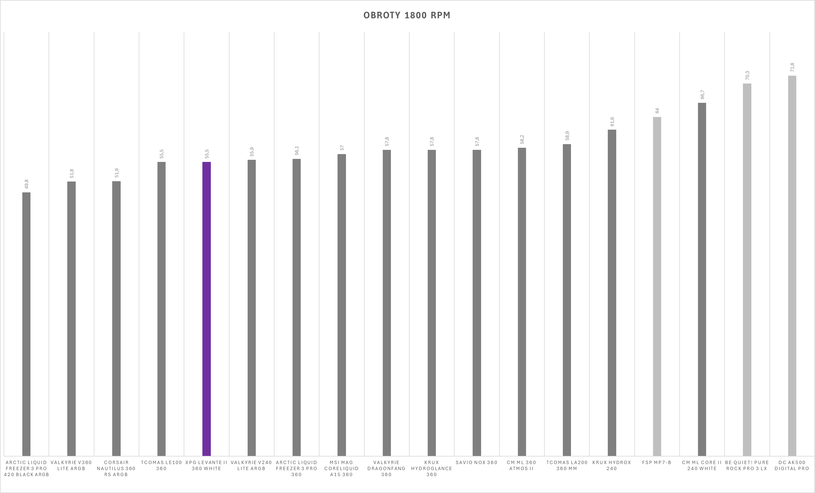 W modelu XPG Levante II 360 White można w pełnym zakresie regulować obrotami wbudowanej pompki. Wyniki są ciekawe, znaczy się w sumie nudne wręcz, bo nieważne, czy pompka kręci się na 25%, czy na 75%, temperatura praktycznie się nie zmienia. Czyli pompka nawet po mocnym skręceniu obrotów nie ma zbytnio wpływu na wydajność całego układu.