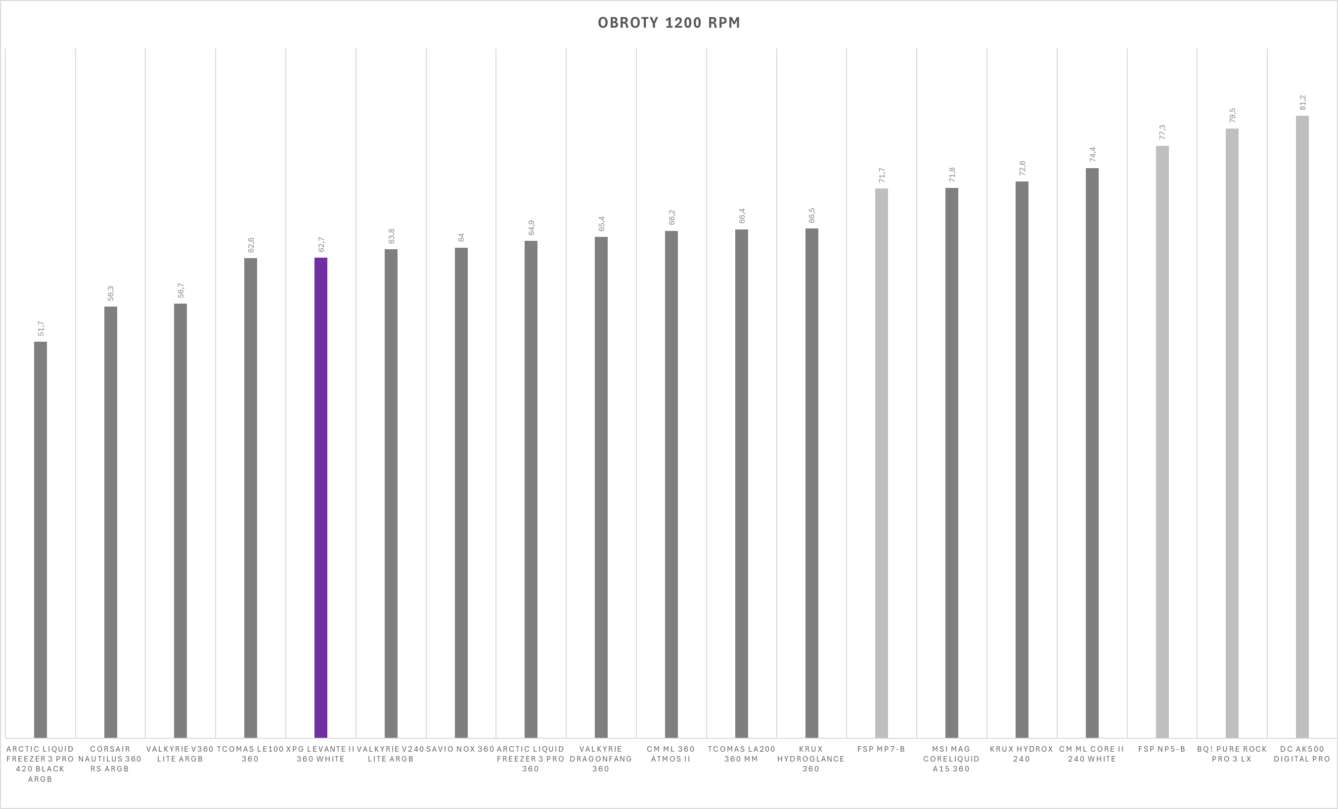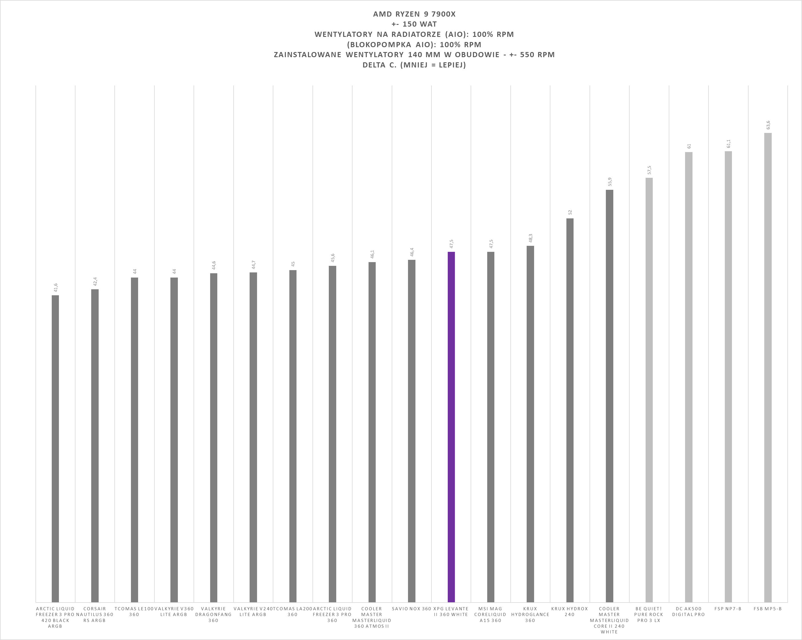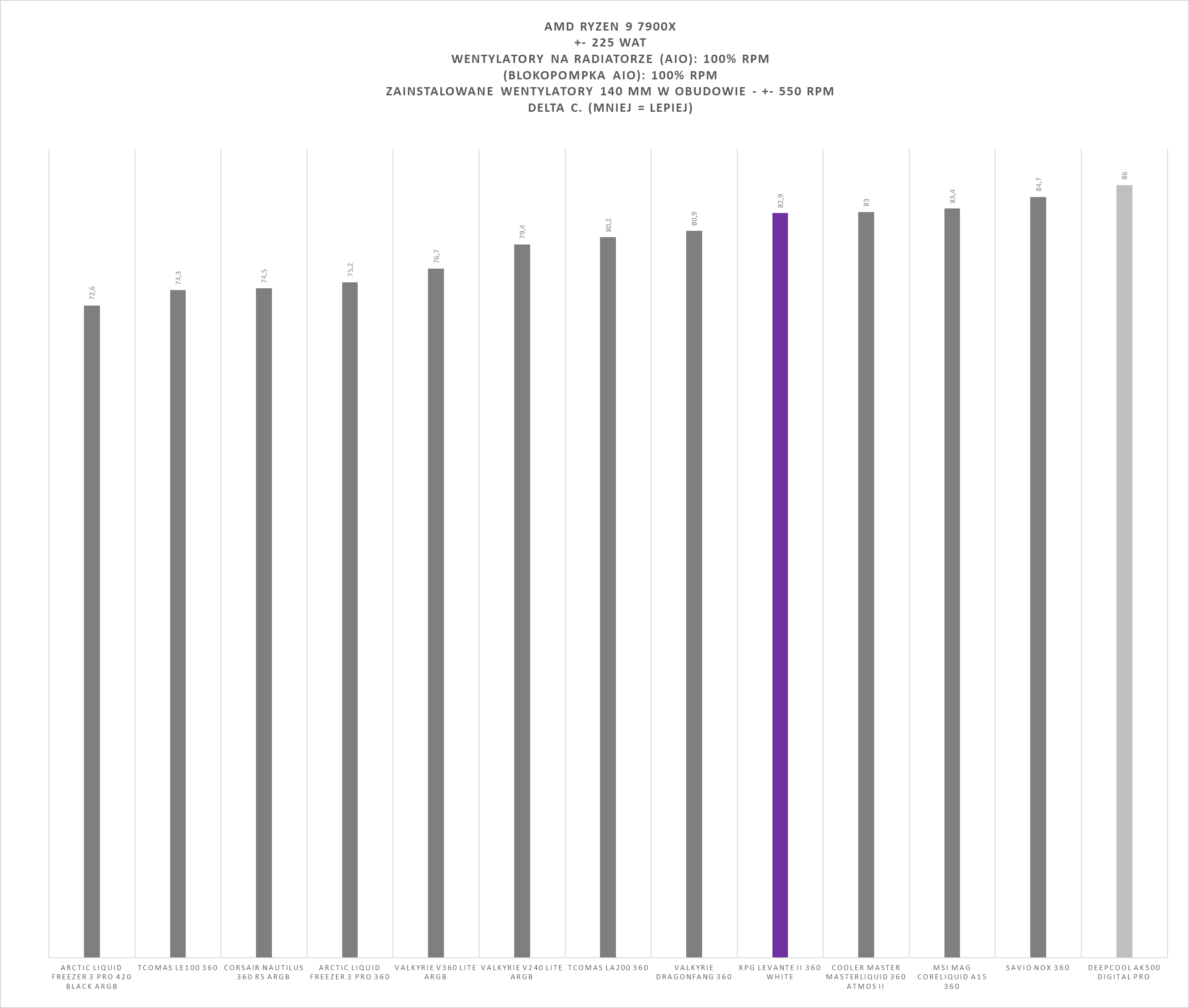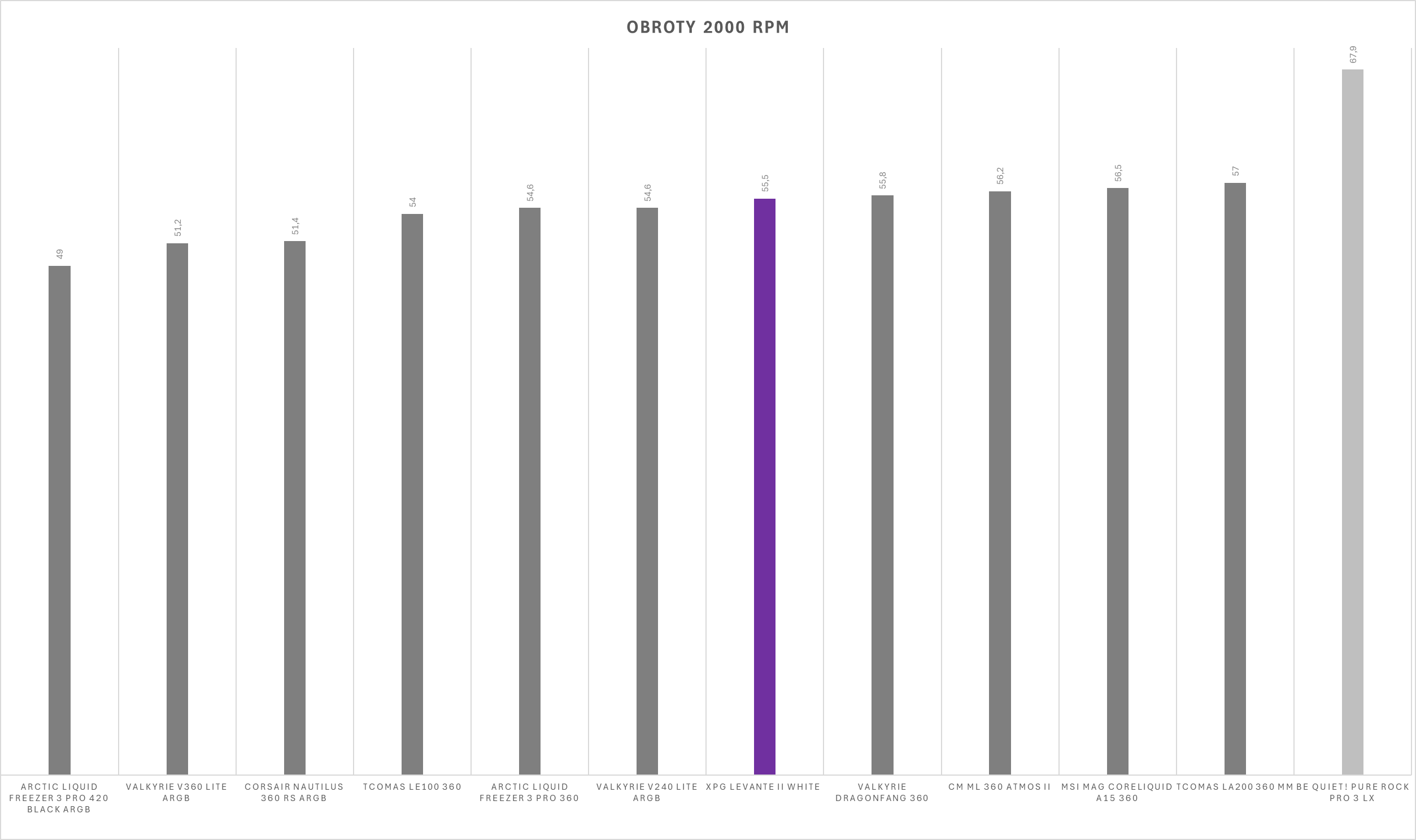 W modelu XPG Levante II 360 White można w pełnym zakresie regulować obrotami wbudowanej pompki. Wyniki są ciekawe, znaczy się w sumie nudne wręcz, bo nieważne, czy pompka kręci się na 25%, czy na 75%, temperatura praktycznie się nie zmienia. Czyli pompka nawet po mocnym skręceniu obrotów nie ma zbytnio wpływu na wydajność całego układu.