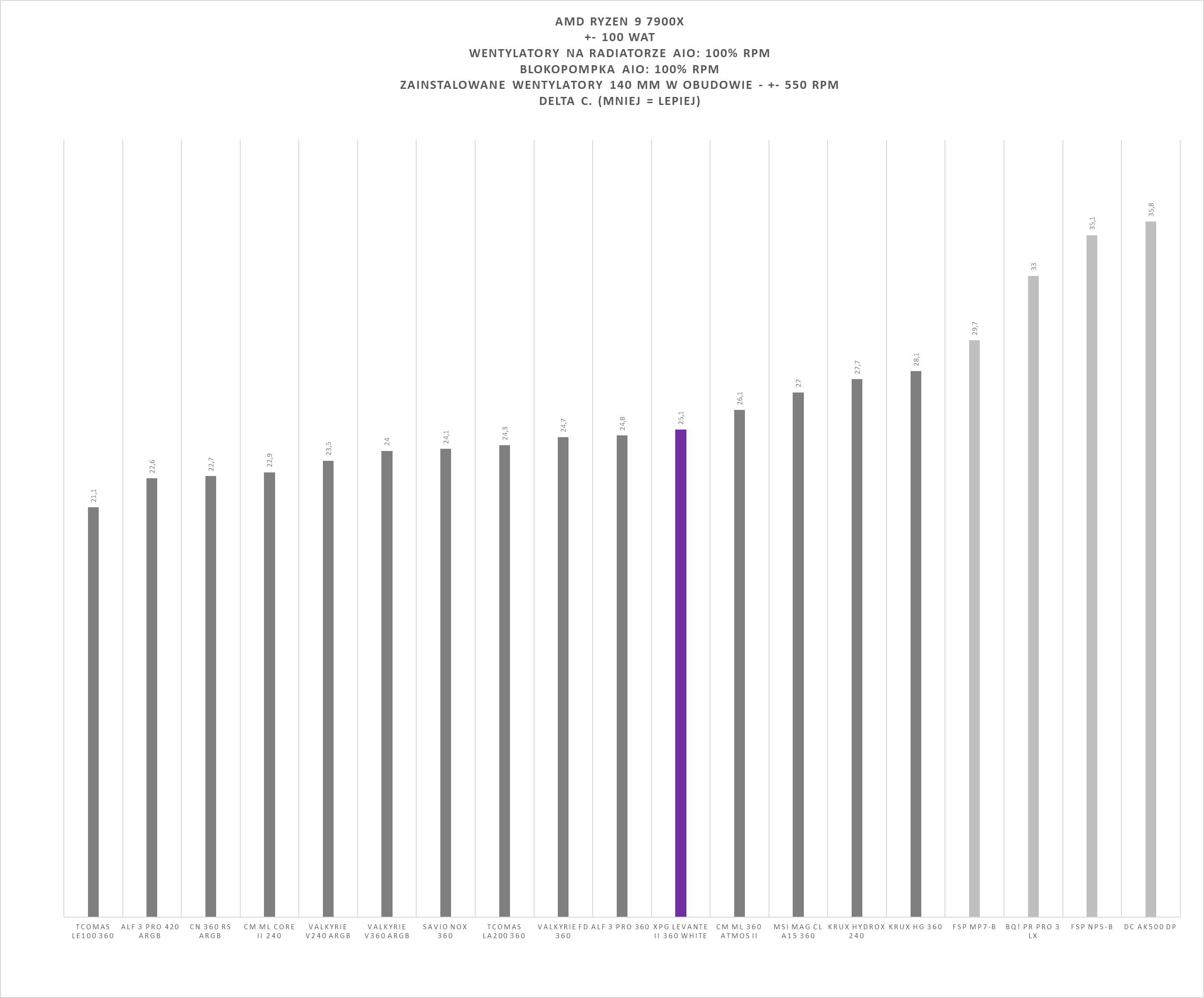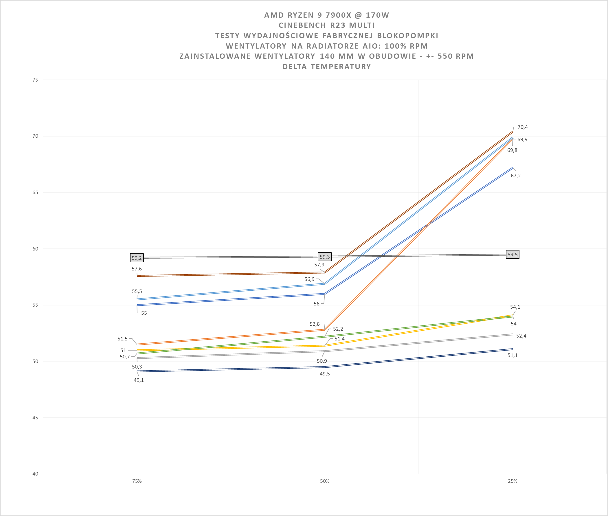 testy blokopompki – sprawdzenie wydajności przy 25, 50 i 75% obrotów RPM (wentylatory na radiatorze: 100% RPM / Ryzen 9 7900X ~ 170W / delta temperatury)