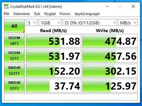 Ważna jest też kwestia samego dysku schowanego pod radiatorem. W teście CrystalDiskMark maksymalne temperatury to 63°C i 80°C (dysk ma dwa czujniki). Są to bardzo dobre wyniki i radiator radzi sobie z tą konstrukcją zapewniając bardzo dobre temperatury pod obciążeniem.