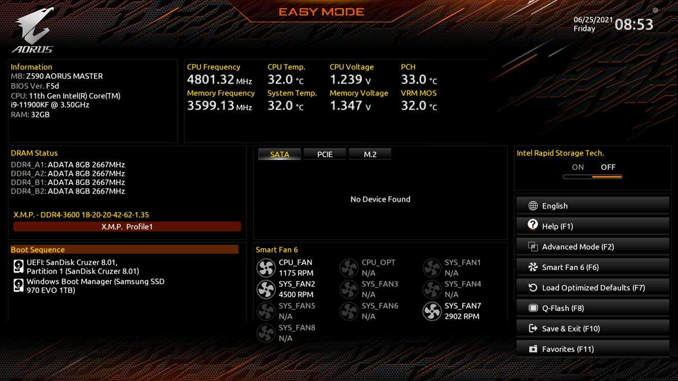 BIOS zaktualizowałem do najnowszego w momencie pisania testu, czyli do F5d. Jest on dosyć przejrzysty oraz oferuje sporo opcji, w szczególności jeśli chcecie wykonać OC procesora. Mniej zaawansowani użytkownicy mają do dyspozycji tryb Easy Mode, gdzie ustawią większość podstawowych rzeczy, w tym profil XMP. Co ważne, po jego ustawieniu płyta automatycznie włączała Gear 1, więc tutaj problemów nie ma. Smart Fan 6 pozwala też w prosty sposób dopasować działanie wentylatorów pod siebie.