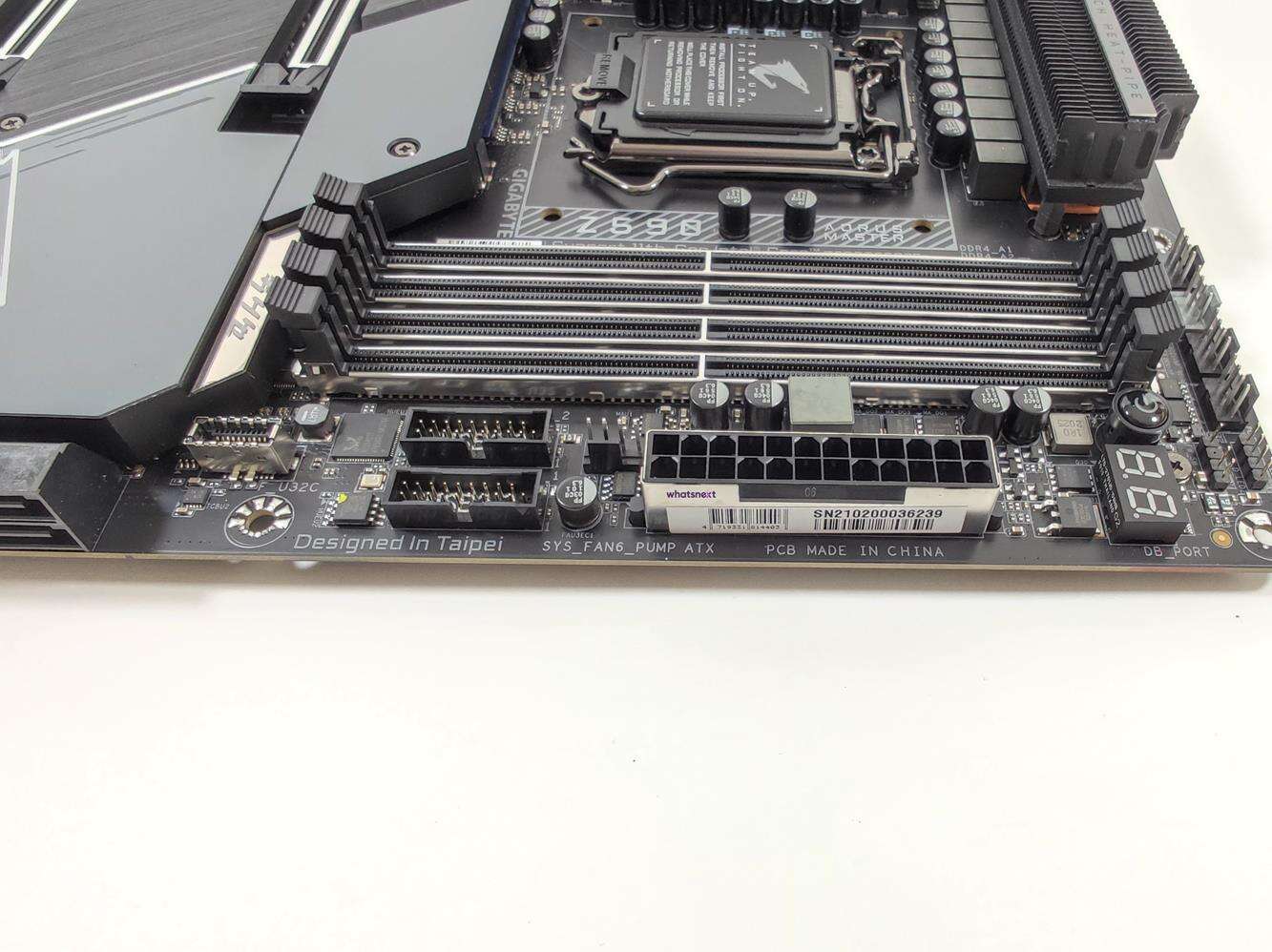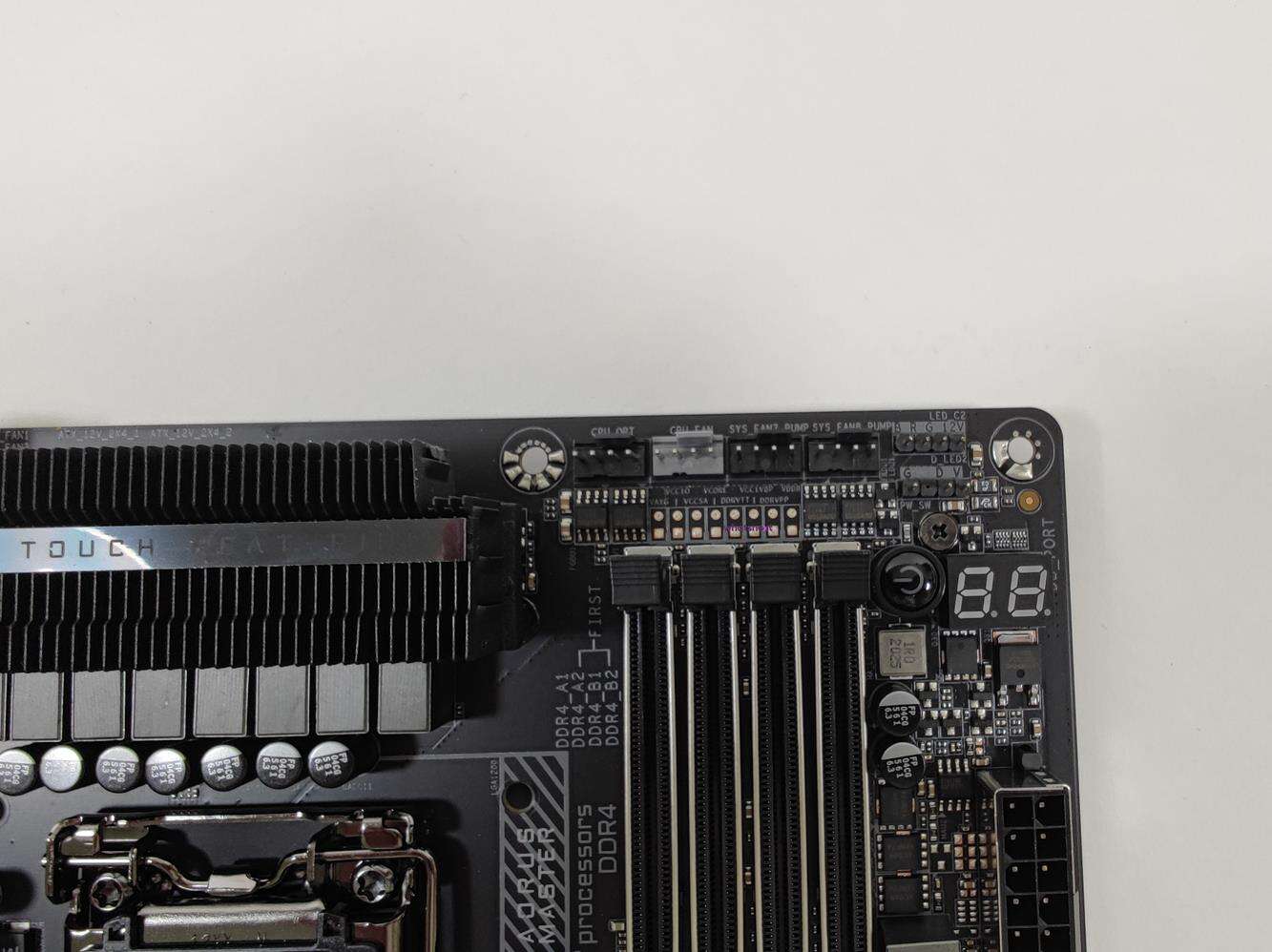 Ilość złączy i przycisków na samej płycie jest naprawdę spora. Mamy do dyspozycji 1x CPU fan, 1x water cooling CPU fan, 4x system fan, 4x system fan/water cooling pump, 2x ARGB, 2x RGB, 1x USB-C, 2x USB 3.2 Gen1, 2x USB 2.0, 1x czujnik głośności, 2x Thundebolt add-in card, 1x TPM, przycisk power, przycisk reset, 2x czujnik temperatury, Clear CMOS, 2x BIOS. Rozmieszczenie złączy jest bardzo dobre. Po prawej na górze od procesora są dostępne złącza 4 pin, RGB czy ARGB. Kolejne są na dole. Pozostałe złącza są umieszczone w takich miejscach, aby dotarcie do nich było naprawdę proste. Jedynie dwa złącza USB 3.1 Gen1 są obok siebie i szkoda, że np. jedno nie jest kątowe albo umieszczone na dole płyty. Co ważne producent pomyślał też o wyświetlaczu kodów POST.