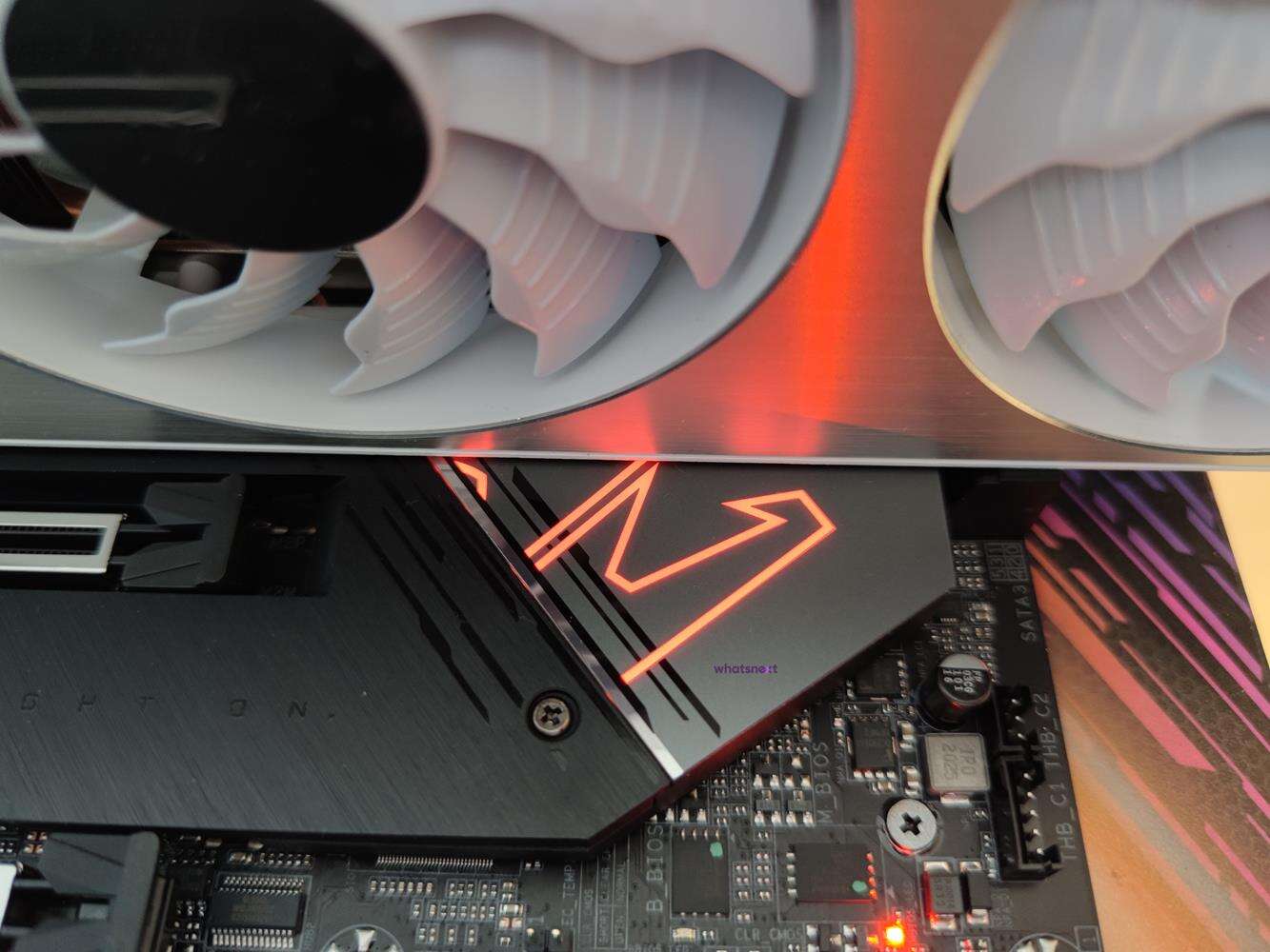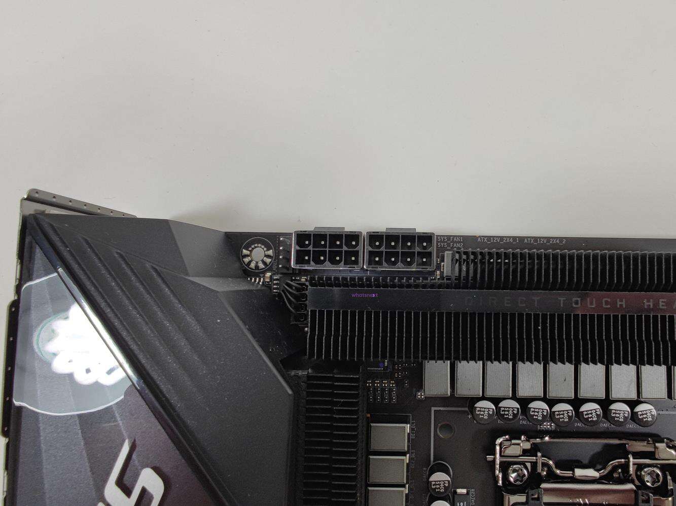 Zasilanie procesora odbywa się z dwóch złączy 8 pin z metalową obudową. Sekcja zasilania ma 18 faz 90 A. Oznacza to, że łącznie jest aż 1620 A. Spokojnie powinno to wystarczyć nawet dla najmocniejszych procesorów 11. generacji Intela. Za chłodzenie sekcji odpowiadają dwa radiatory oraz 8 mm ciepłowód z technologią Direct-Touch II. Co ciekawe znajduje się tam też mały wentylator, ale jego zadaniem nie jest chłodzenie sekcji zasilania. Ma on na celu schłodzenie kontrolera Aquantia 10 GbE LAN.