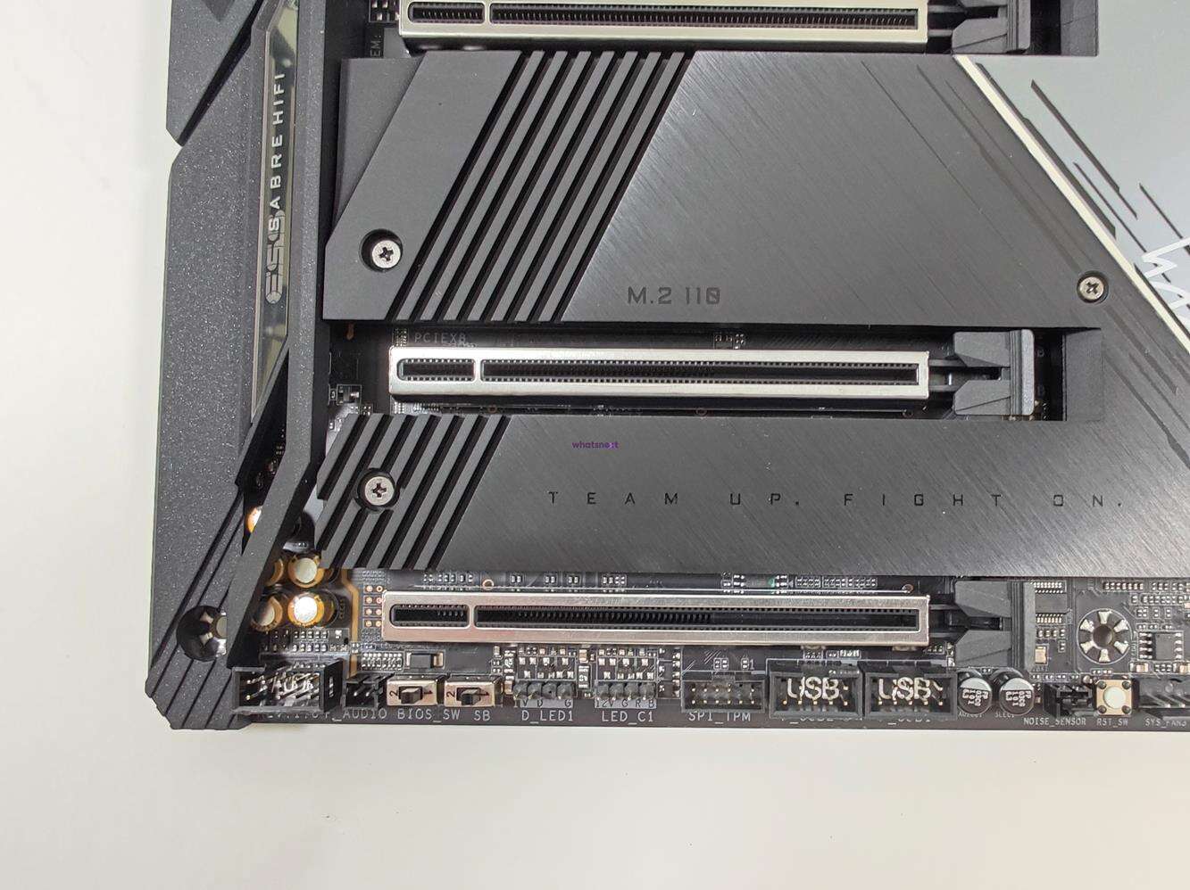 Z590 Aorus Master oferuje dwa złącza PCI-E x16, z czego jedno działa x16 a drugie x8. Oba są zgodne z PCI-E Gen4 (przy procesorach 11. generacji Intela). Warto też pamiętać, że jak złącze PCIEX8 jest zajęte to PCIEX16 działa również w trybie x8. Jest też jeszcze jedno złącze PCI-E x16 działające w trybie x4 i zgodne z PCI-E Gen3. Wszystkie złącza są wzmacniane więc nie ma szans na ich wyłamanie.
