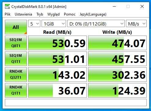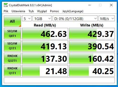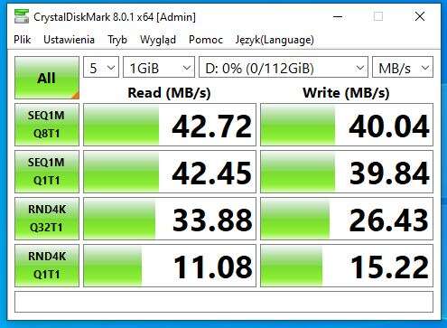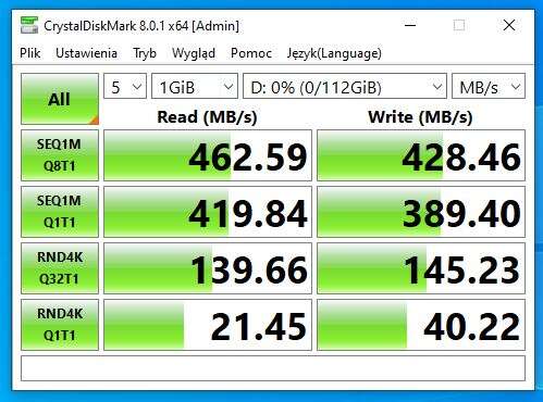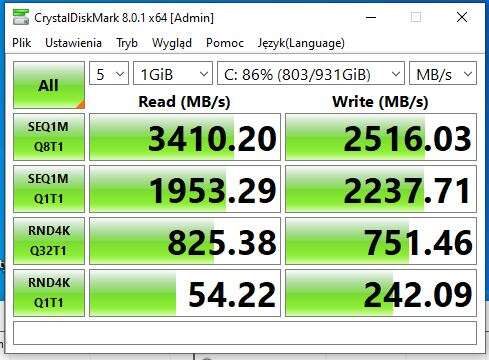 Złącz USB, SATA i M.2 wypadły bez uwag. Ten ostatni dysk znajdował się pod radiatorem na płycie, który jednak nie działa zbyt wybitnie. Temperatury w CrystalDiskMark sięgają 71°C i 94°C (dysk ma dwa czujniki). Szybko więc pojawia się throttling, który zbije Wam wydajność dysku.