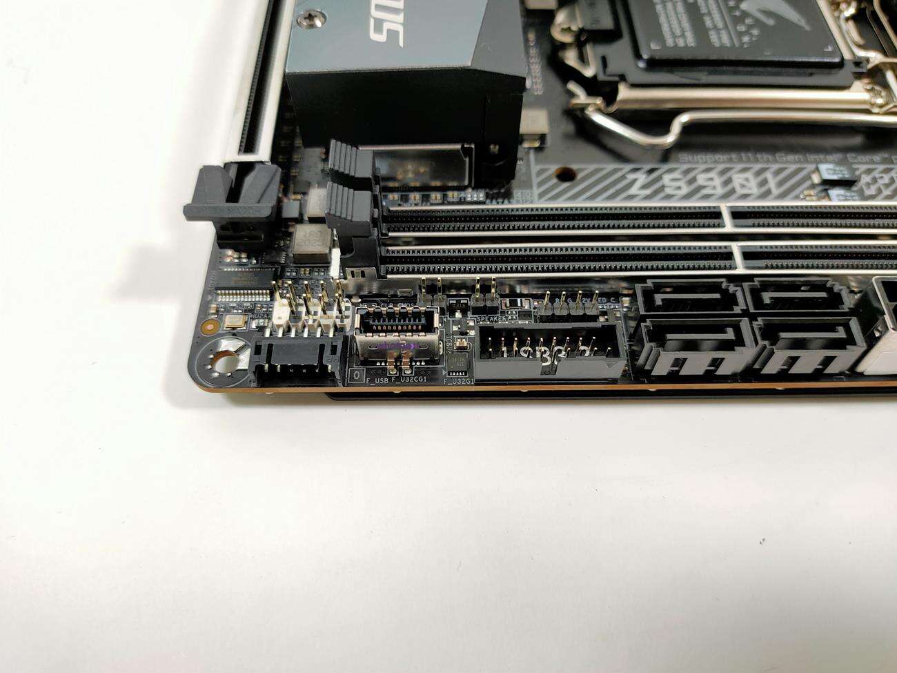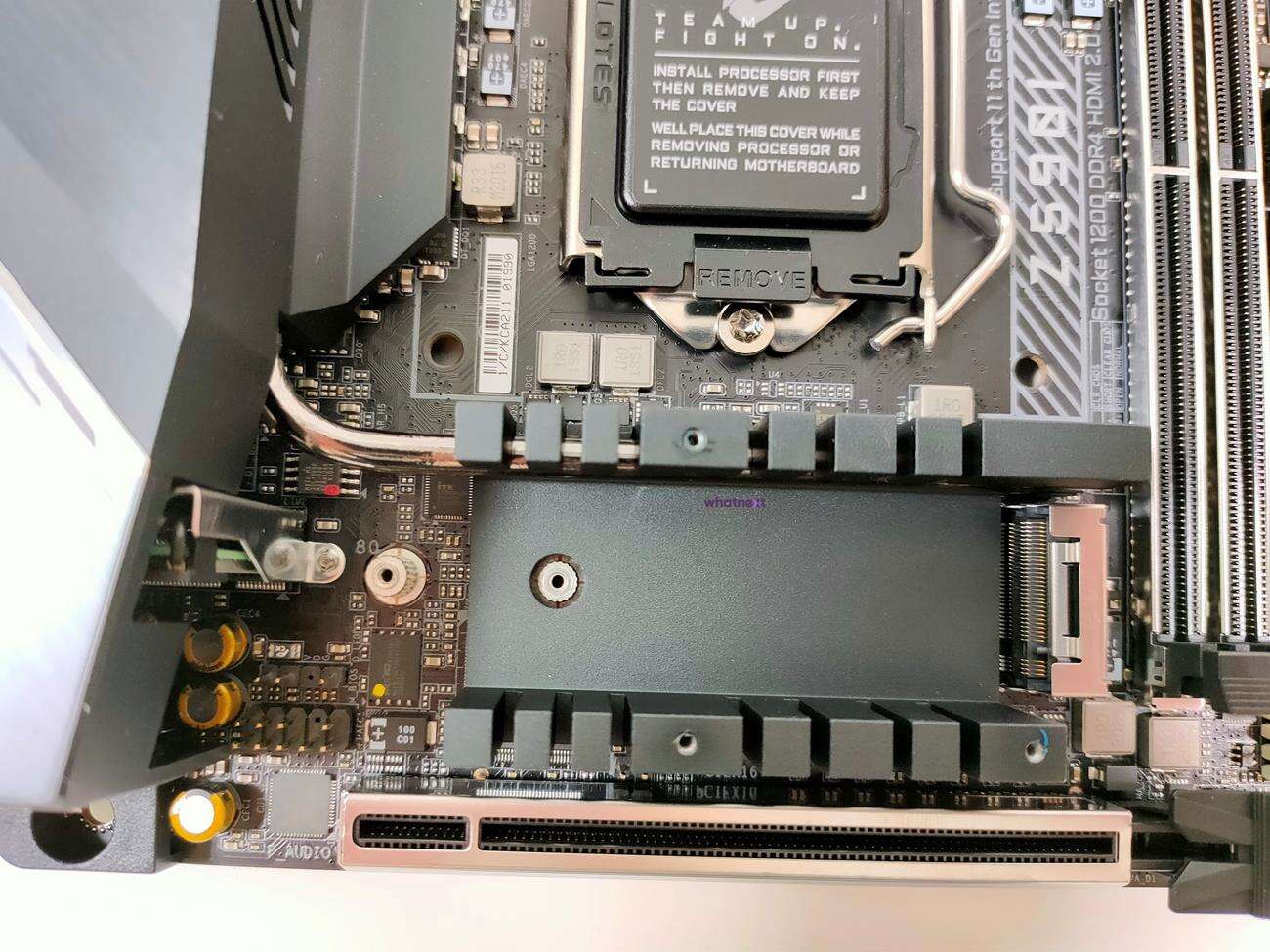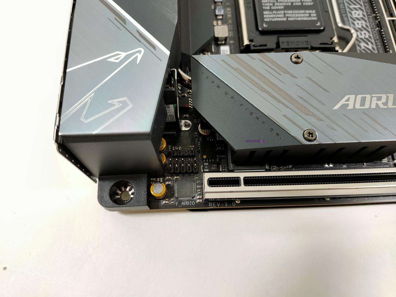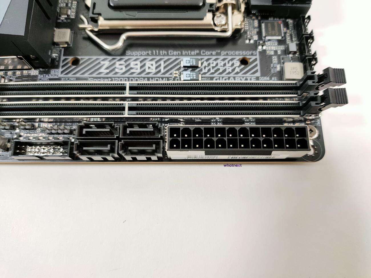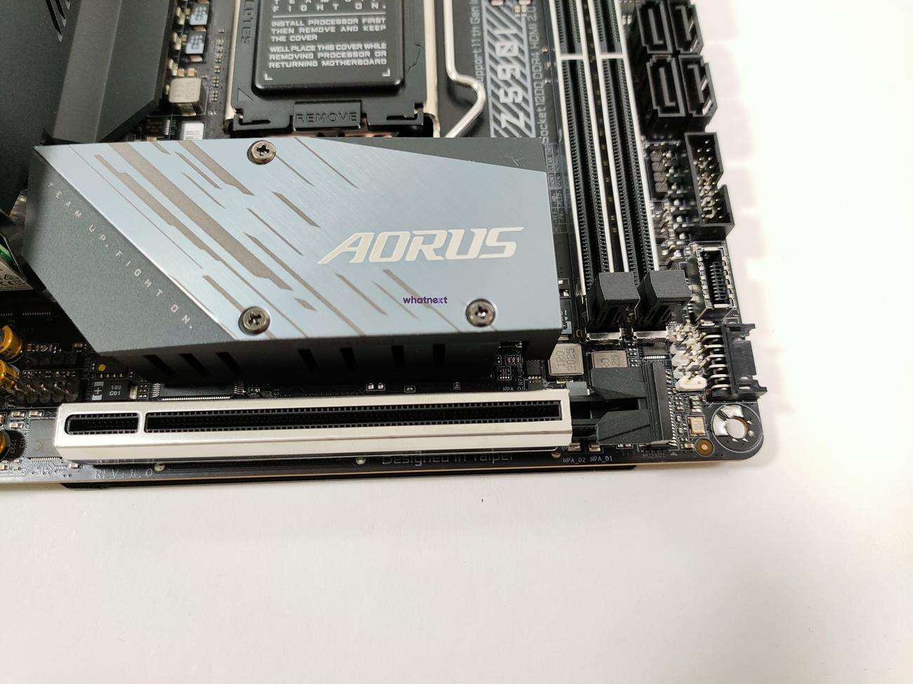 Na płycie znajduje się jedno złącze PCI-E x16. Gen4 wspierane jest tylko przez procesory Intel 11. generacji. Producent zapewnił też dwa sloty na dyski M.2 – jeden z przodu pod radiatorem, drugi z tyłu płyty. To przednie obsługuje dyski PCI-E Gen4, ale obsługiwane jest tylko przez procesory Intel 11 generacji. Przy 10. generacji do dyspozycji będziecie mieli tylko tylne złącze ze wsparciem dla PCI-E 3.0. Na płycie nie zabrakło też czterech złączy SATA 6 Gb/s.