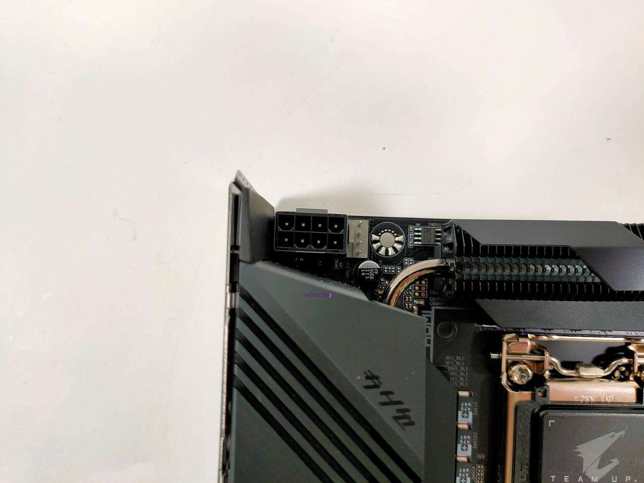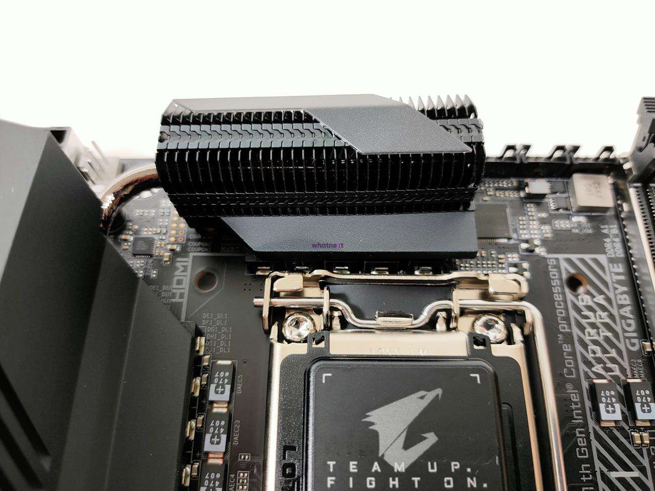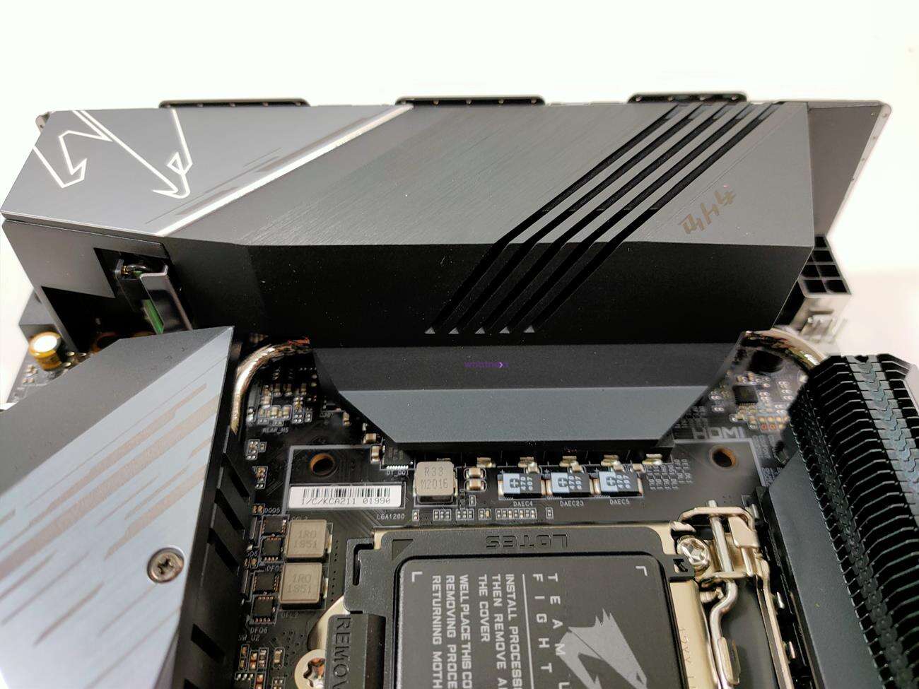 Procesor zasilany jest z jednego złącza 8 pin. Sekcja zasilania ma 10+1 faz oraz 90A dławiki. Nie zabrakło tutaj Gigabyte Direct Power, który ma zapewniać nawet do 4% lepszą efektywność od konkurencyjnych rozwiązań. Sekcja chłodzona jest przez radiatory oraz ciepłowód, który łączy się z częścią na dysk M.2. Ciepłowód jednak nie dotyka bezpośrednio dysku – tutaj mamy osobny radiator. Ciekawe, czy takie rozwiązanie zapewni odpowiednie temperatury sekcji zasilania. Płyta oczywiście oparta jest o chipset Z590 oraz obsługuje procesory Intel 10. i 11. generacji.