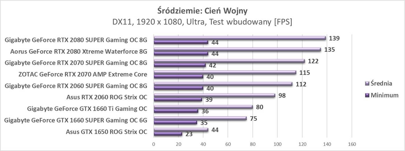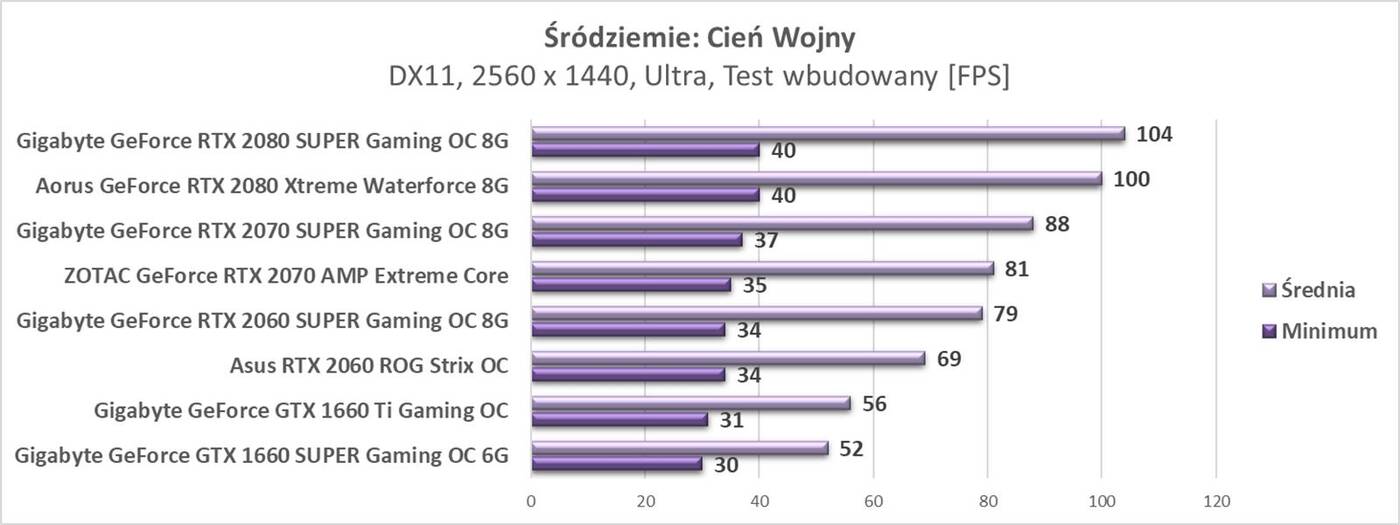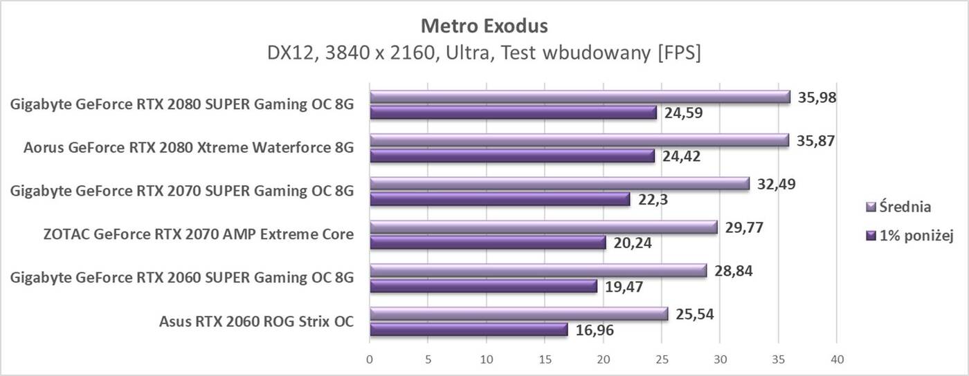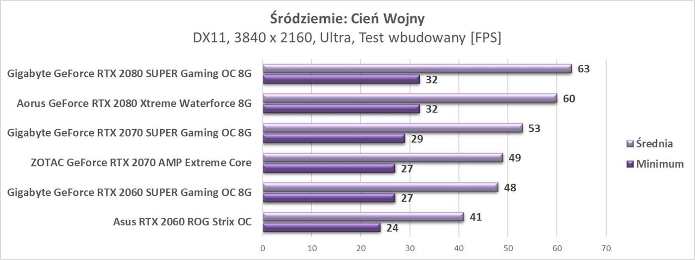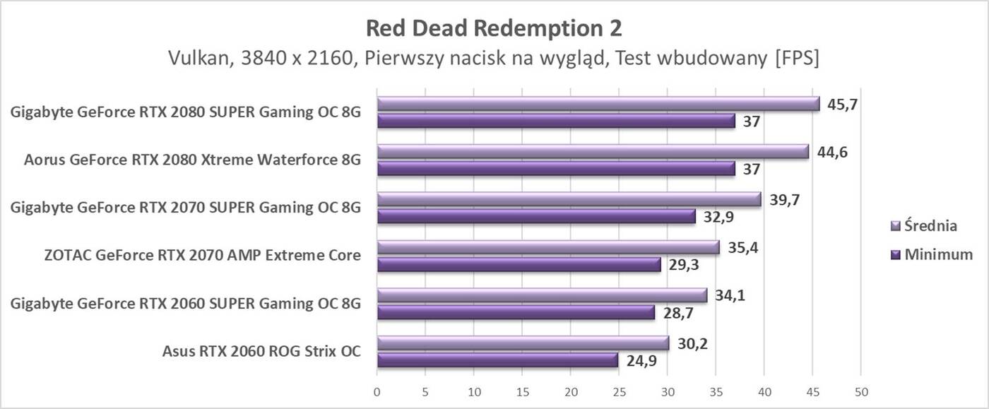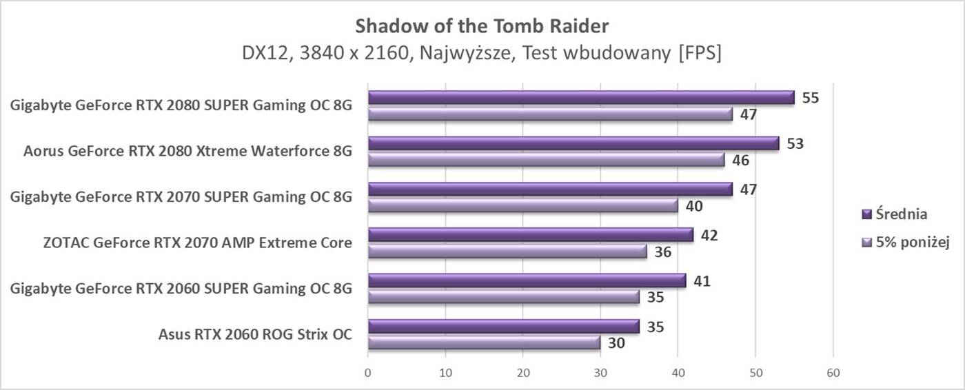 W ostatniej rozdzielczości wyniki bliskie 60 fps zapewnia tylko RTX 2080 SUPER. Warto jednak zwrócić uwagę, że najmocniej podkręcona wersja RTX 2080 od Aorusa ma bardzo bliski rezultat. RTX 2060 kompletnie już odpada z konkurencji, a przy pozostałych kartach konieczna będzie obniżka detali, aby uzyskać średnie wyniki bliskie 60 fps.