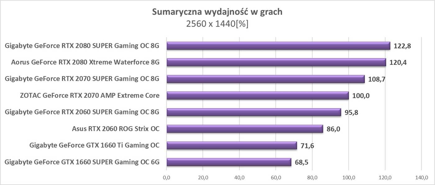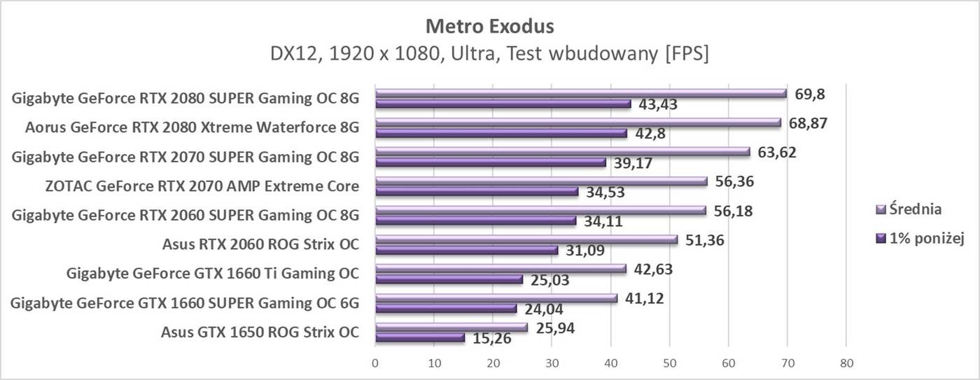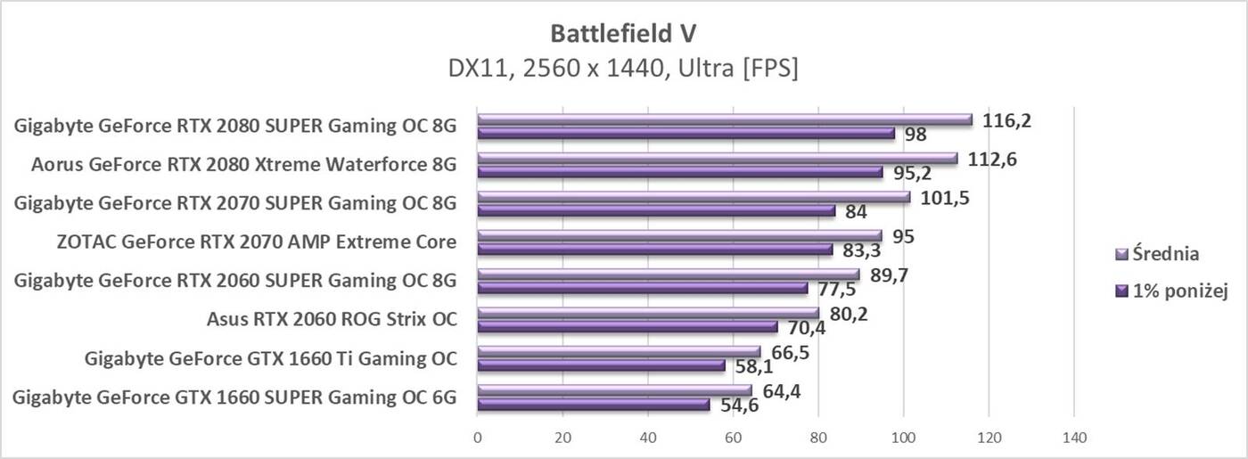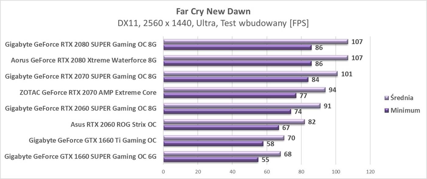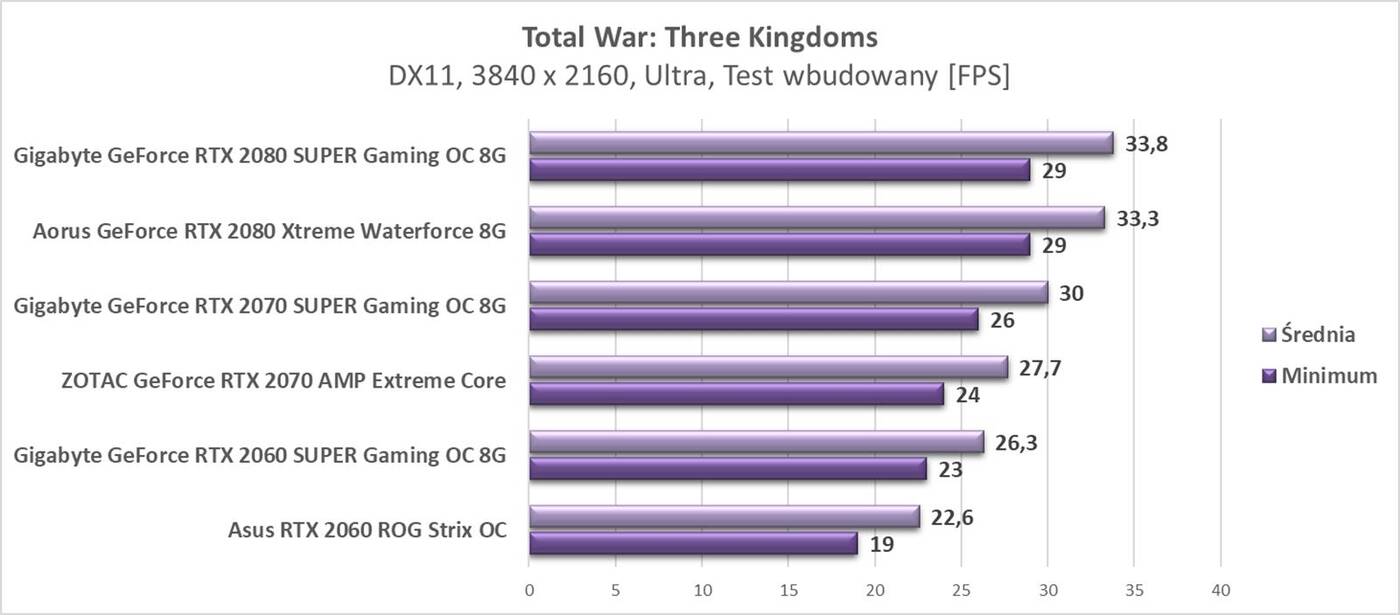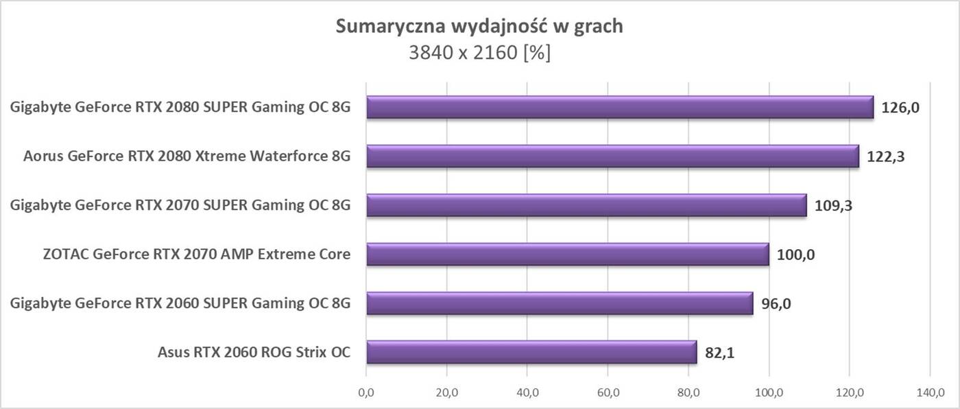 W ostatniej rozdzielczości wyniki bliskie 60 fps zapewnia tylko RTX 2080 SUPER. Warto jednak zwrócić uwagę, że najmocniej podkręcona wersja RTX 2080 od Aorusa ma bardzo bliski rezultat. RTX 2060 kompletnie już odpada z konkurencji, a przy pozostałych kartach konieczna będzie obniżka detali, aby uzyskać średnie wyniki bliskie 60 fps.