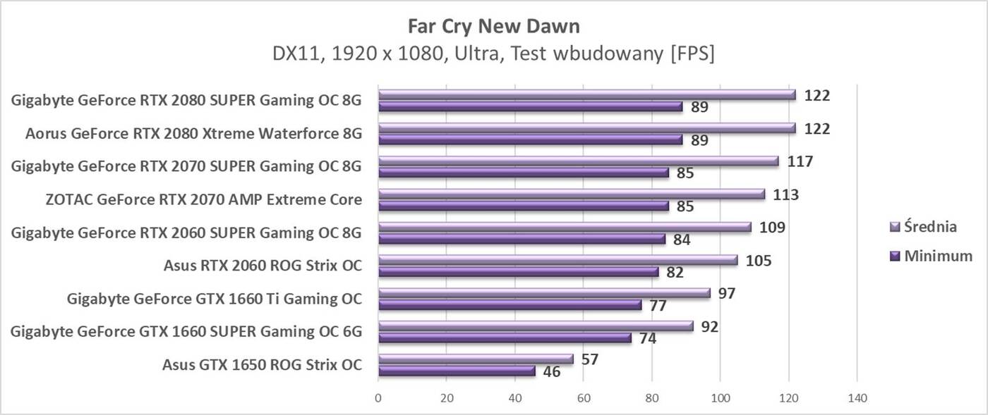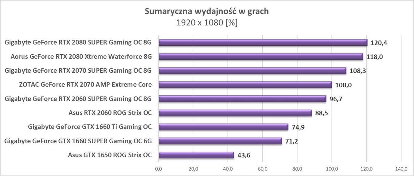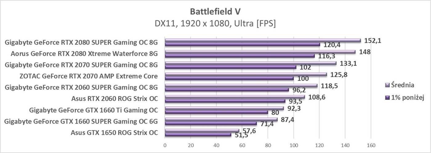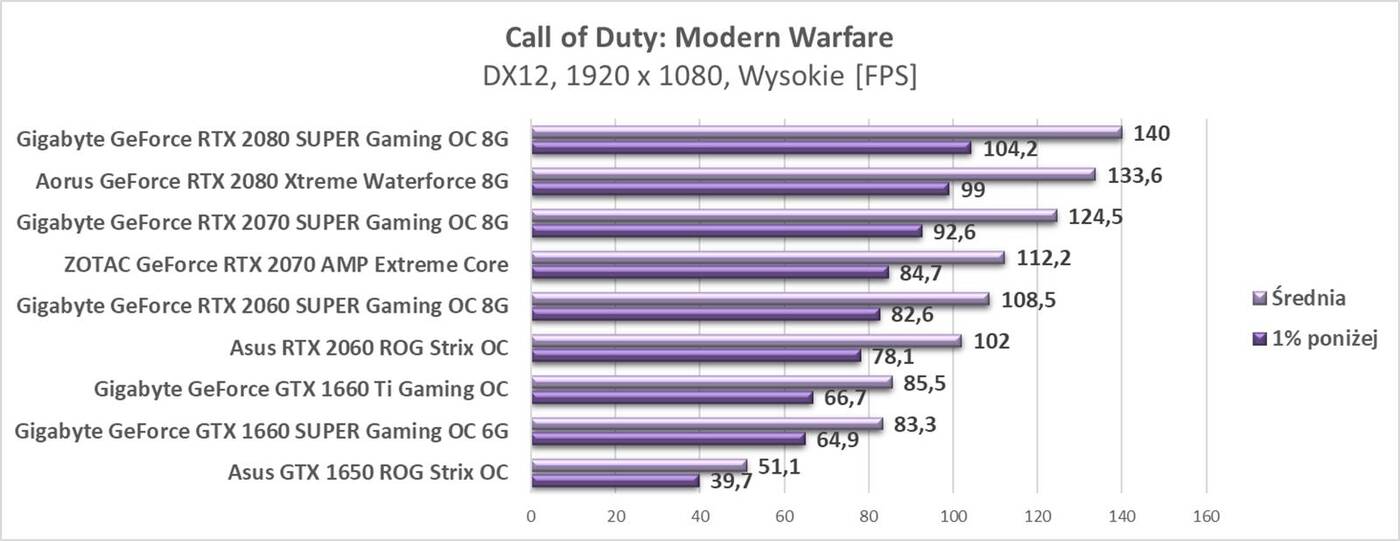 W rozdzielczości 1920 x 1080 px sytuacja jest bez zmian. W większości gier sprawdzi się już karta GTX 1660 SUPER, która zapewni średnio 60 fps przy najwyższych detalach. Niestety przy karcie GTX 1650 trzeba albo obniżyć jakość gry albo zaakceptować znacznie mniej płynną rozgrywkę.