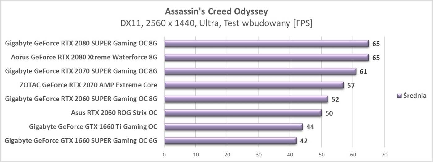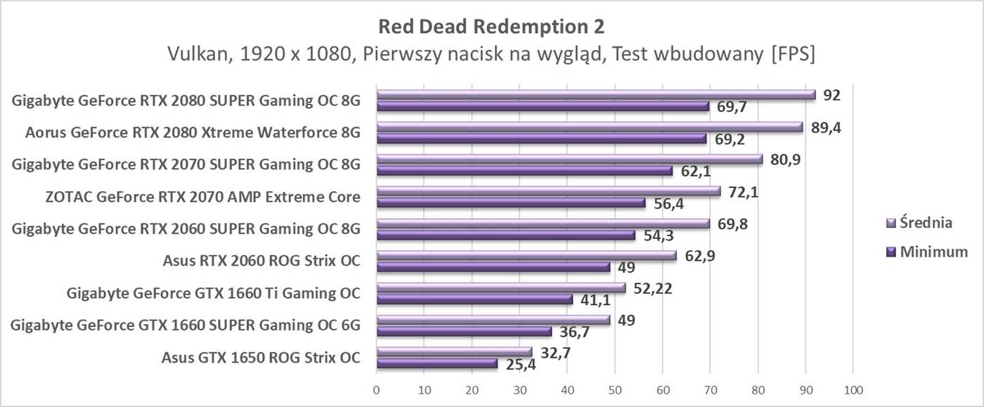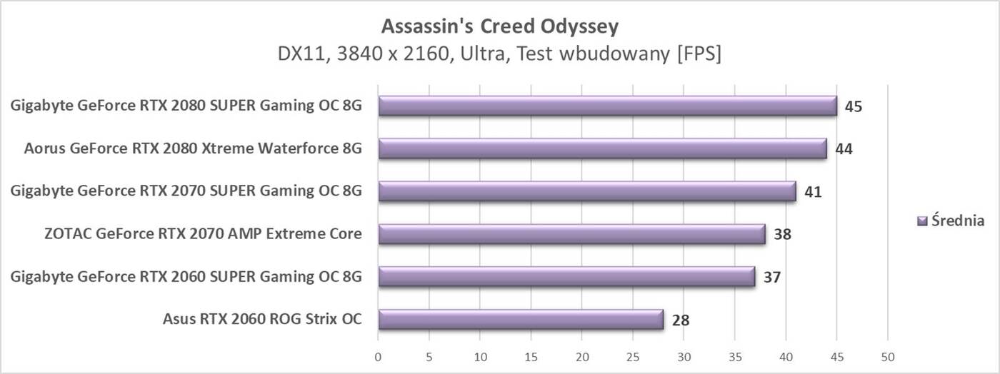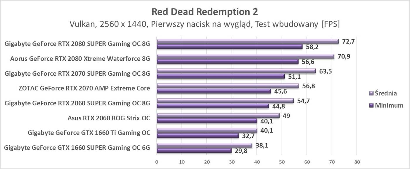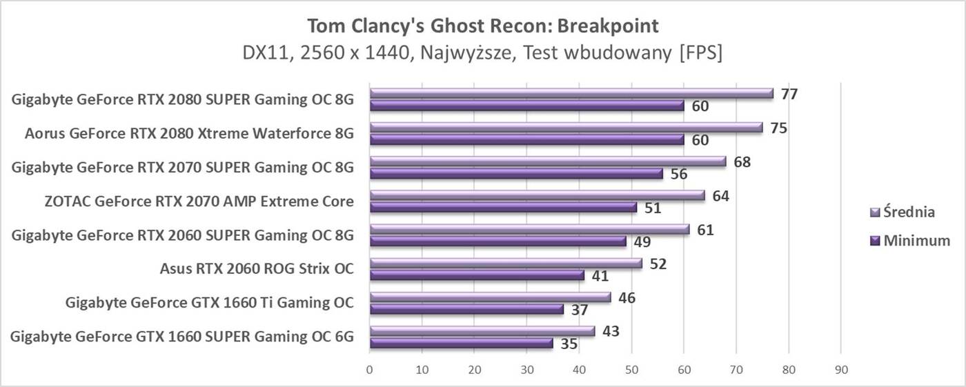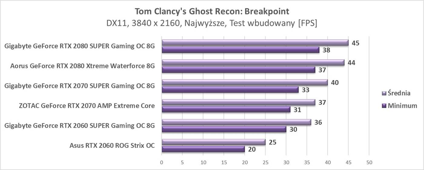 Parę uwag co do wybranych tytułów. W grze Assassin’s Creed Odyssey nie podaję minimalnych fps, gdyż te wyrzucane przez benchmark pomiędzy kolejnymi testami zbyt mocno się różnią. W grze Tom Clancy’s Ghost Recon: Breakpoint maksymalna minimalna ilość fps to 60. Nie zdziwcie się więc, jak żadna karta nie będzie miała większego wyniku. W grze Red Dead Redemption 2 zastosowane ustawienia graficzne to pierwszy nacisk na wygląd w przypadku RTX 2080 SUPER, czyli: