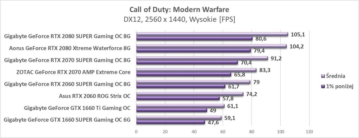 W kolejnej rozdzielczości już RTX 2060 zapewnia w miarę płynną rozgrywkę. Widać jednak sporą stratę do RTX 2060 SUPER, więc jeśli możecie dołożyć do tej wersji karty, to zdecydowanie warto to zrobić. Przy słabszych grafikach konieczne będzie obniżenie detali, aby uzyskać średnio 60 fps.