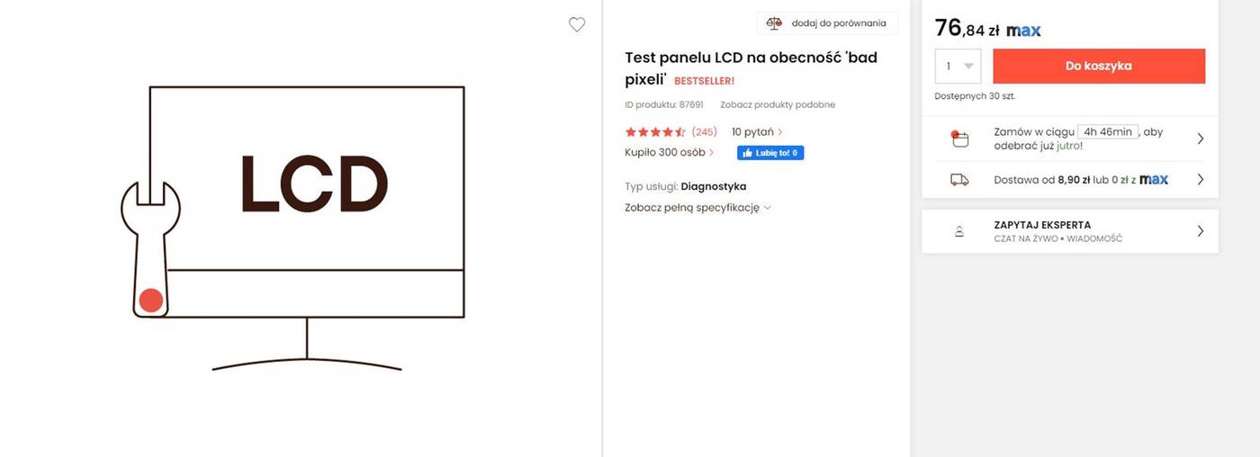 Ponieważ historia jest wielowątkowa, zanim przejdę do szczegółów, przybliżę Wam nieco wcześniejszy artykuł. W nim to kręciłem nosem na temat konkretnych usług sklepu Morele. Wśród nich najdroższa usługa sprowadza się do testu panelu LCD na obecność „bad pixeli”. W ramach tej usługi za 76 złotych (kiedyś 150 złotych) sklep przed wysyłką zleca swoim specjalistom sprawdzenie telewizora/monitora LCD pod kątem obecności wypalonych pikseli, „sun spotów” (przyznam, że kompletnie nie wiem, czym to jest), a na dodatek sprawdzi, czy matryca odpowiednio się podświetla.