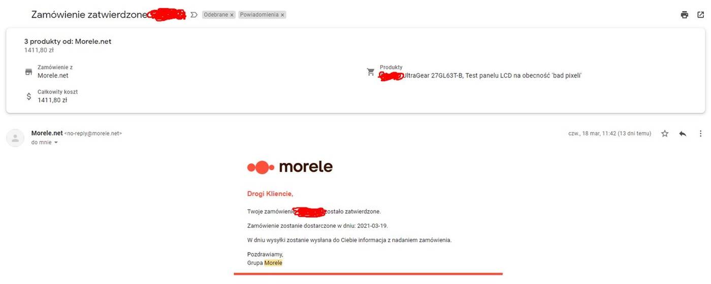 I tutaj do gry wchodzi moje źródło, które na potrzebę tego artykułu nazwę Panią Julią. Julia skontaktowała się ze mną, przybliżając swoją ostatnią przygodę ze sklepem Morele, w którym to zakupiła nowy monitor w ramach ograniczonej czasowo promocji i zdecydowała się właśnie na wspomniany test matrycy. Swoją historię dokładnie mi opisała i potwierdziła, przedstawiając solidne dowody.