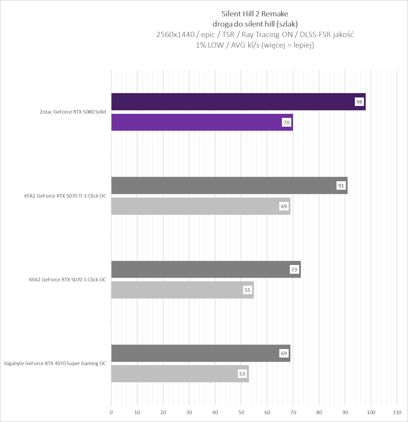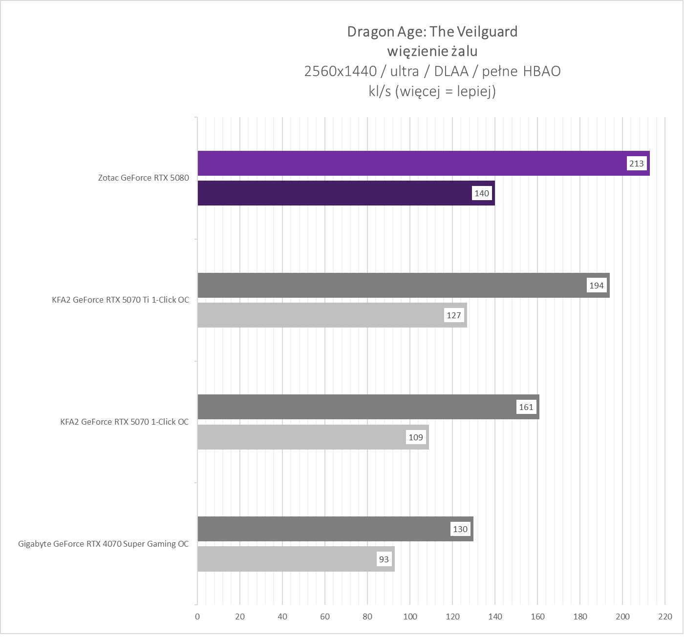 Dla ciekawskich: gra uruchomiona w trybie 2560×1440 DLSS (+ Frame Generator) bardzo słabo skaluje się z procesorem Ryzen 5 9600X, co powoduje, że wydajność testowanego dziś GPU w tym konkretnym scenariuszu jest znacznie niższa od zakładanej przy procesorach AMD Ryzen 7/9xxx X3D, osiągając w najgorszym scenariuszu jedynie około 60% pełnego wykorzystania.