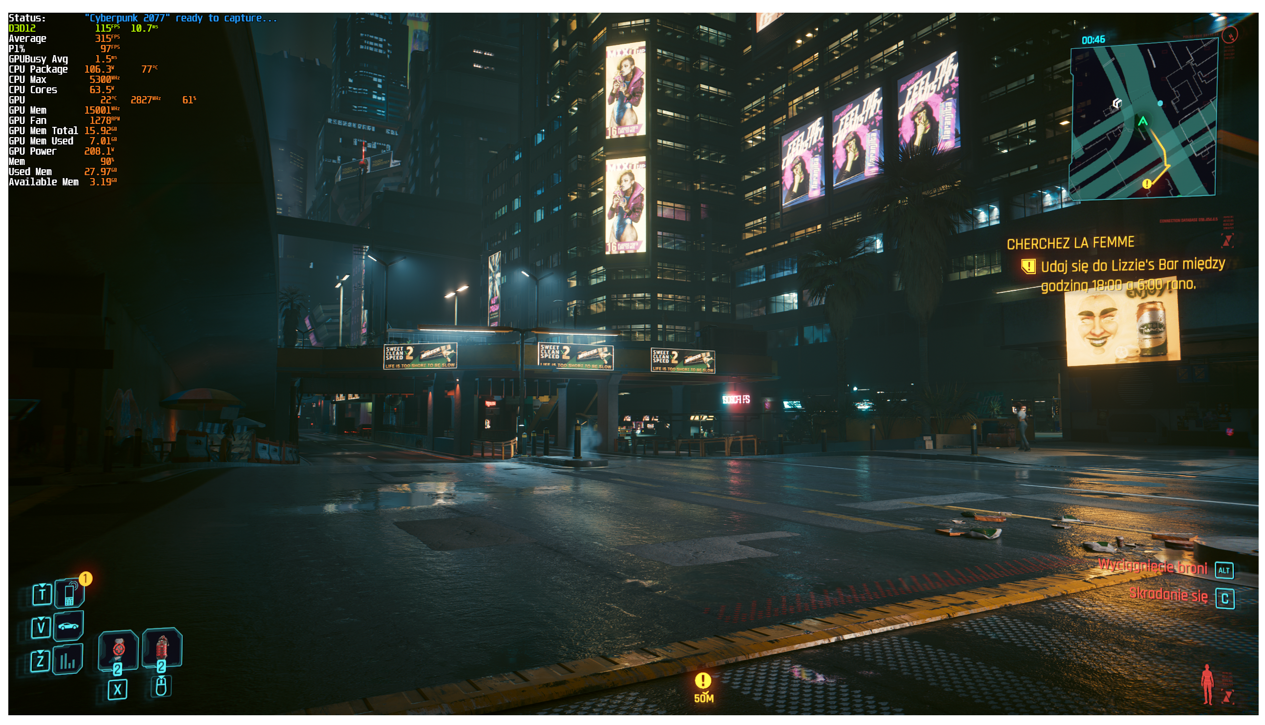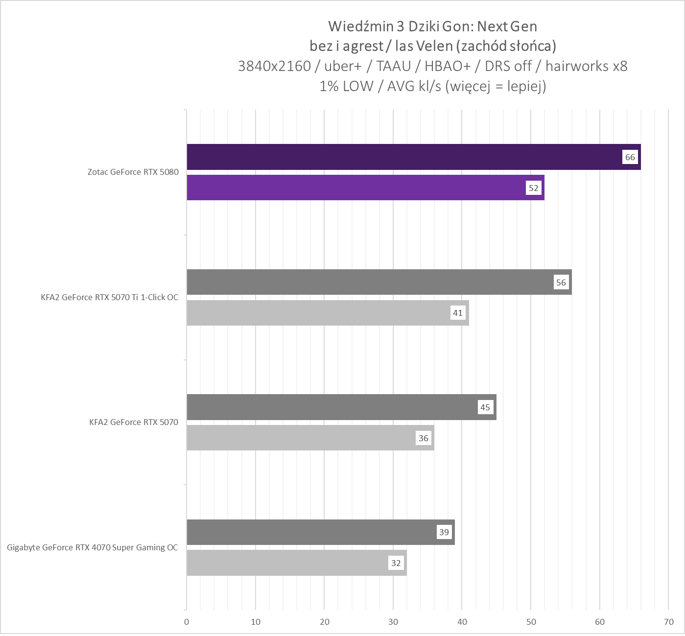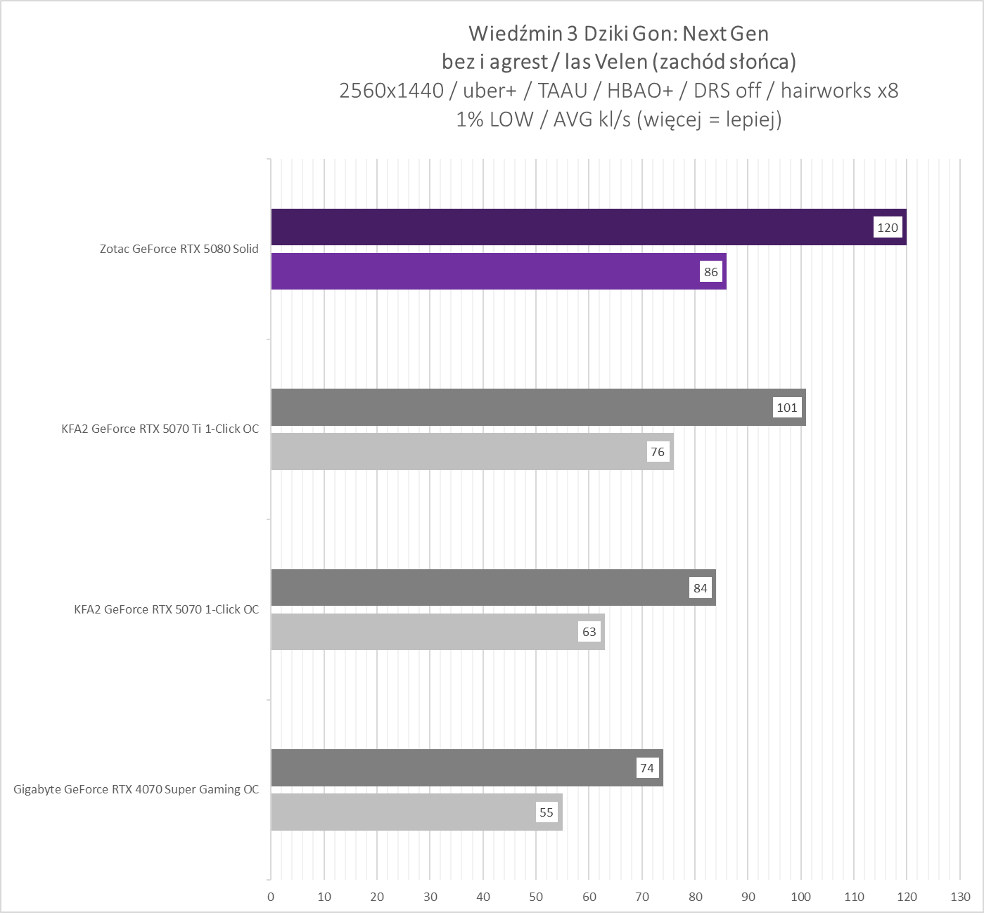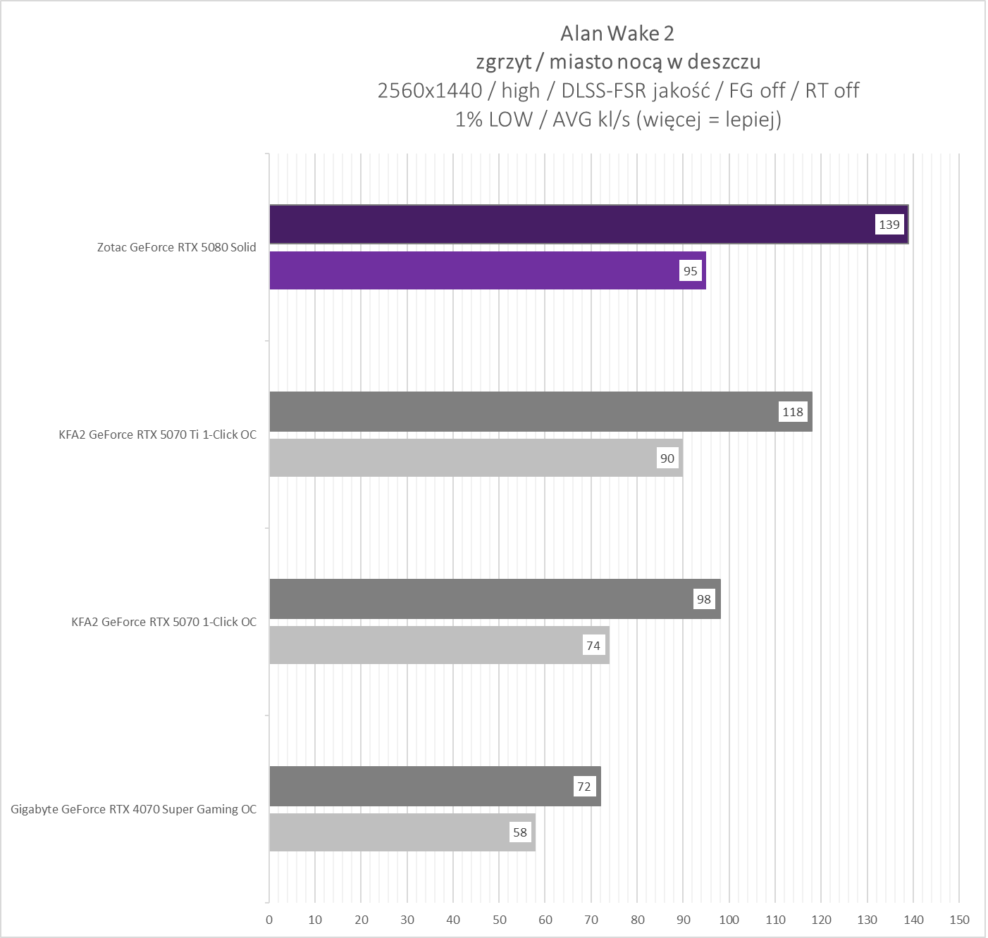 Testy karty graficznej przeprowadzono na systemie Windows 11 64-bit (wersja 23H2) z użyciem sterowników nVidia 576.02, w trakcie rzeczywistej rozgrywki. Do pomiaru liczby klatek wykorzystałem program CapeFrameX w wersji 1.7.2.